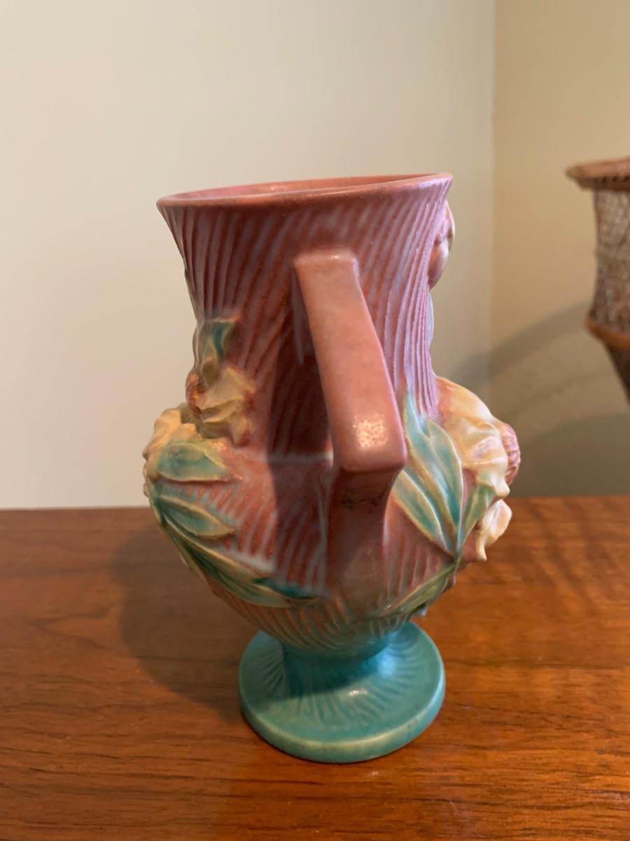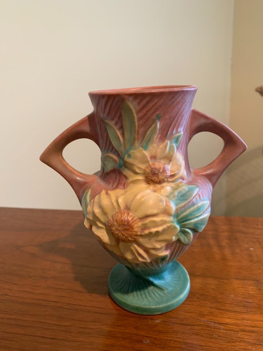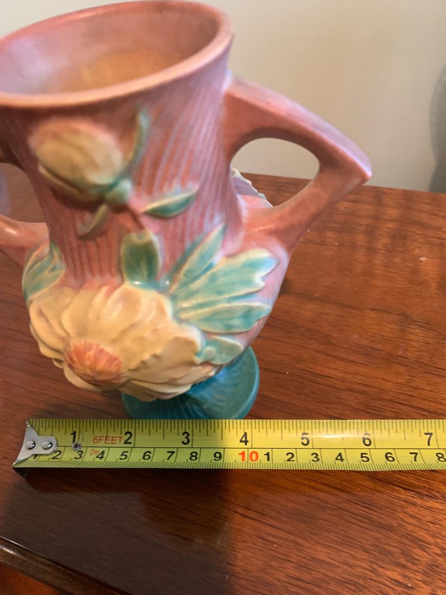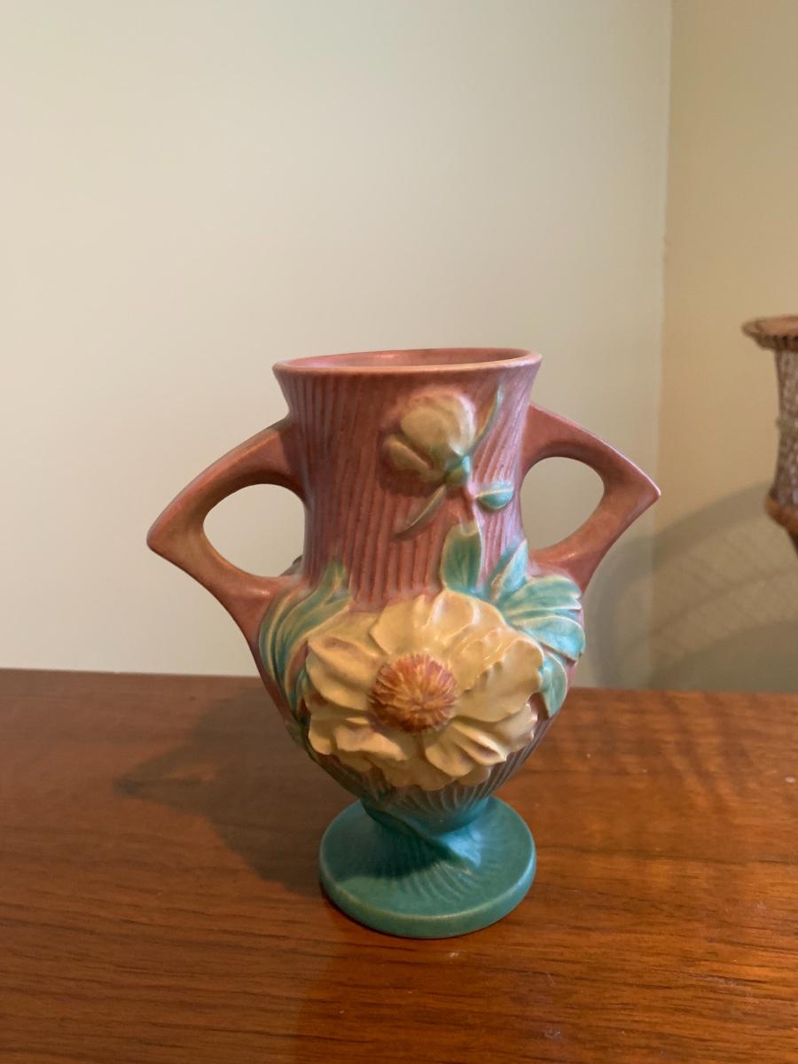 Roseville 6" Footed 2 handle Vase Peony Coral, no signs of damage.