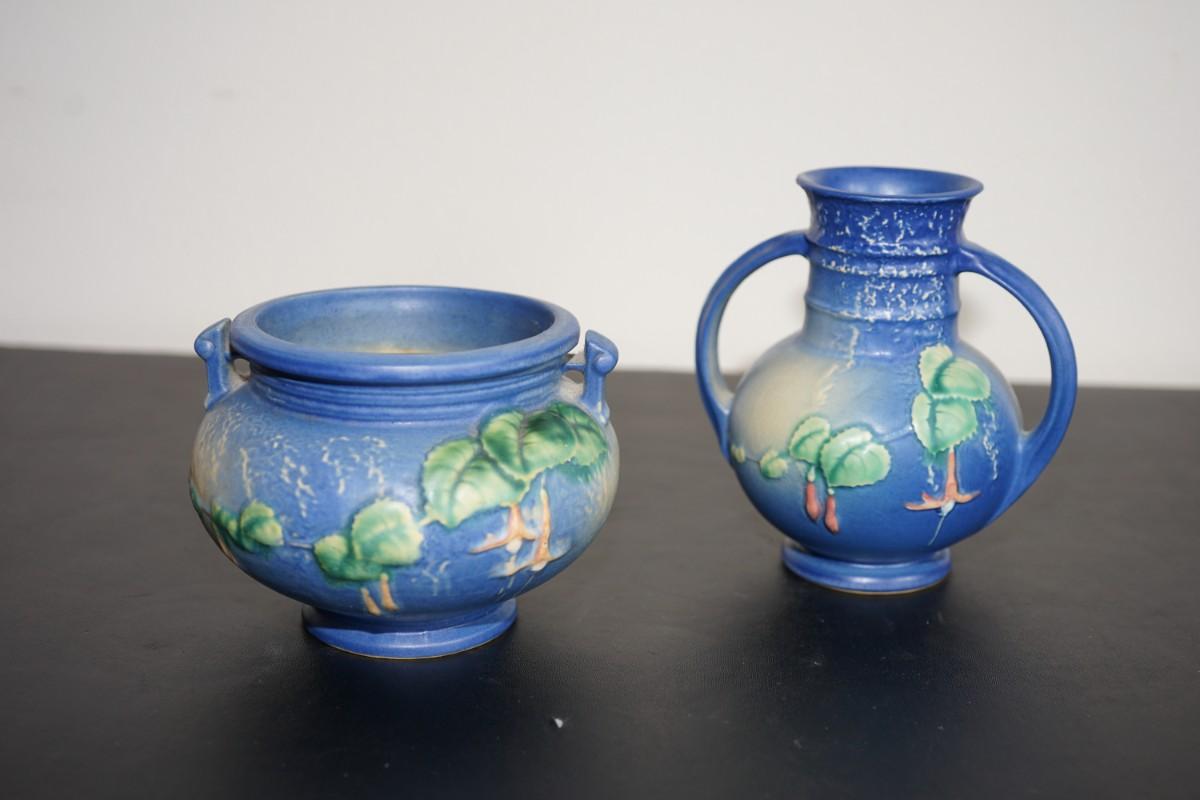 ROSEVILLE FUCHSIA 1938 HANDLED VASES FOR THE PAIR IN VERY GOOD CONDITION