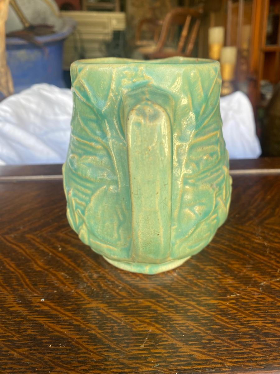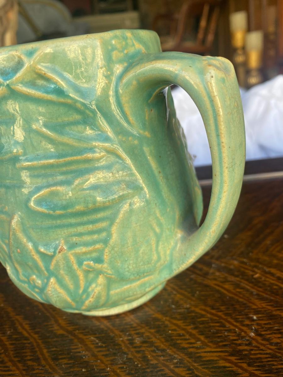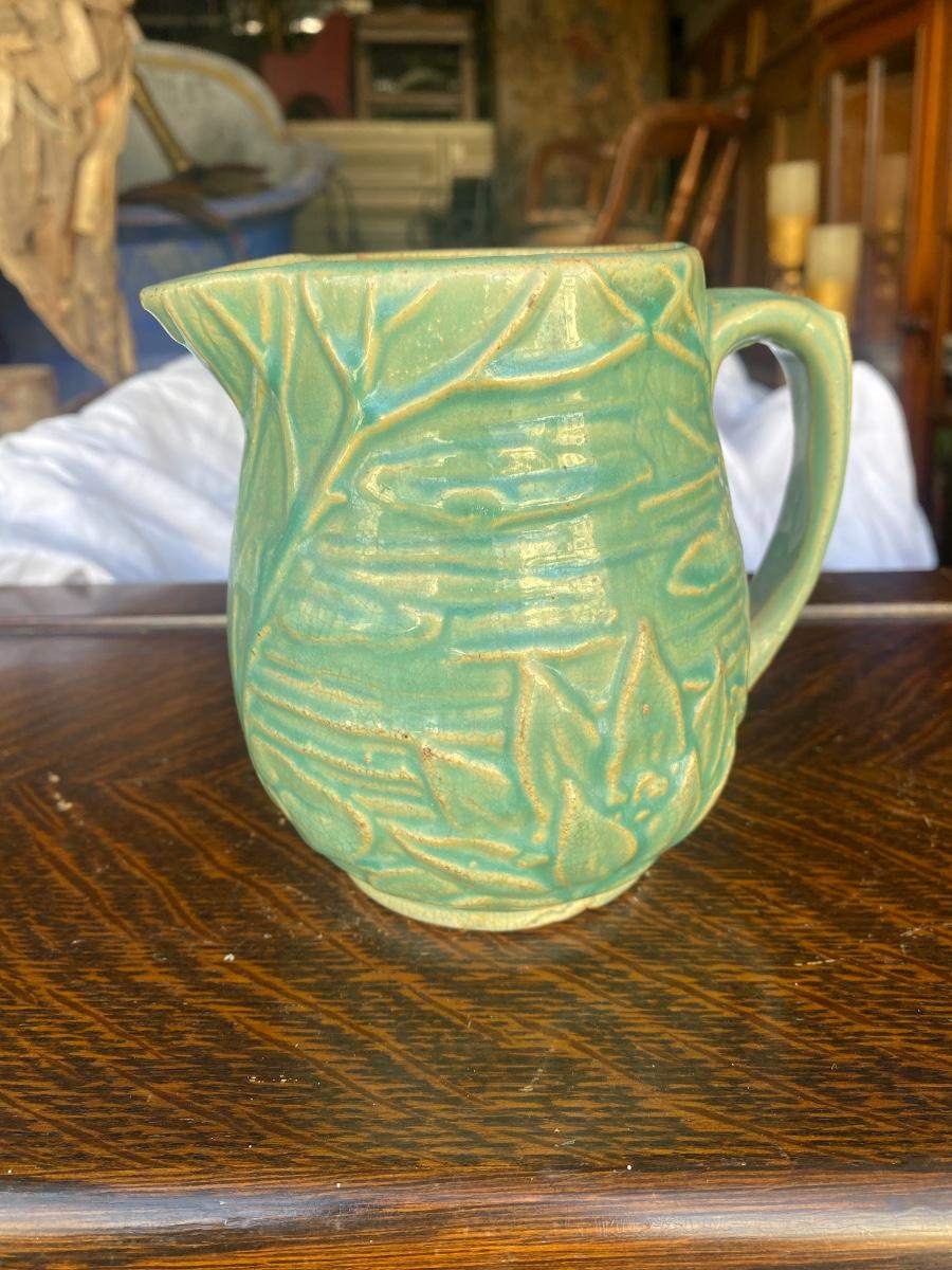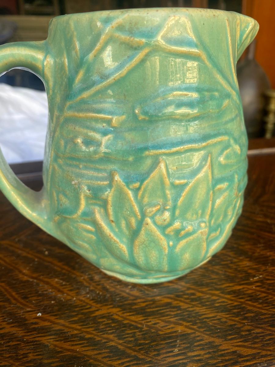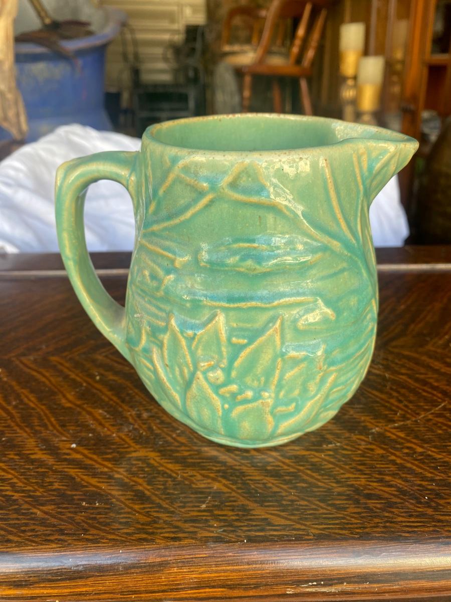 This vintage, 5" tall stoneware pitcher is a piece from the Nelson McCoy Water Lily line, made in the 1930s, marked 124. The embossed greenery and the green/teal glaze make it a stand out, early production piece from McCoy. There is mild overall crazing and a glaze loss, but in otherwise great condition