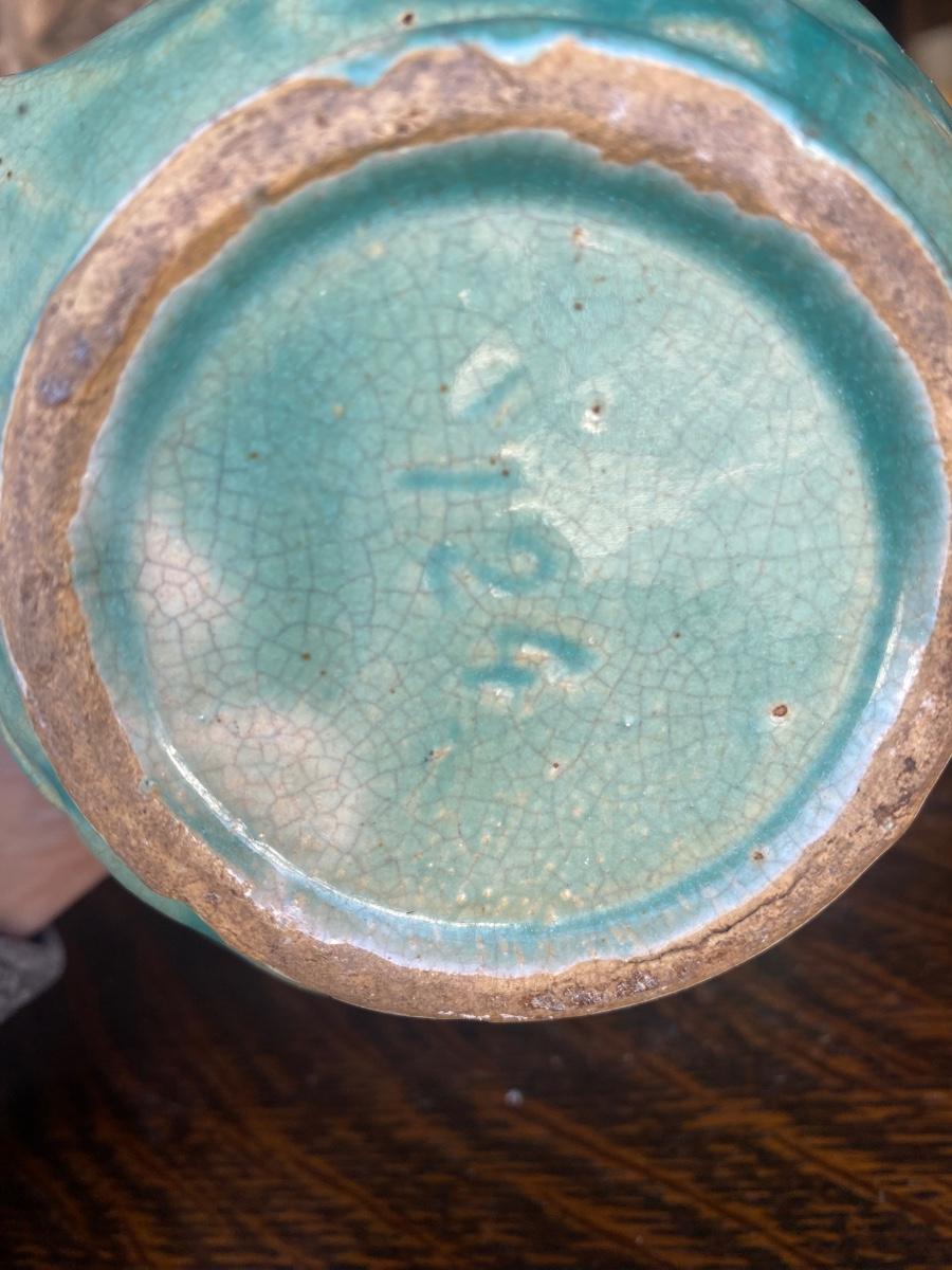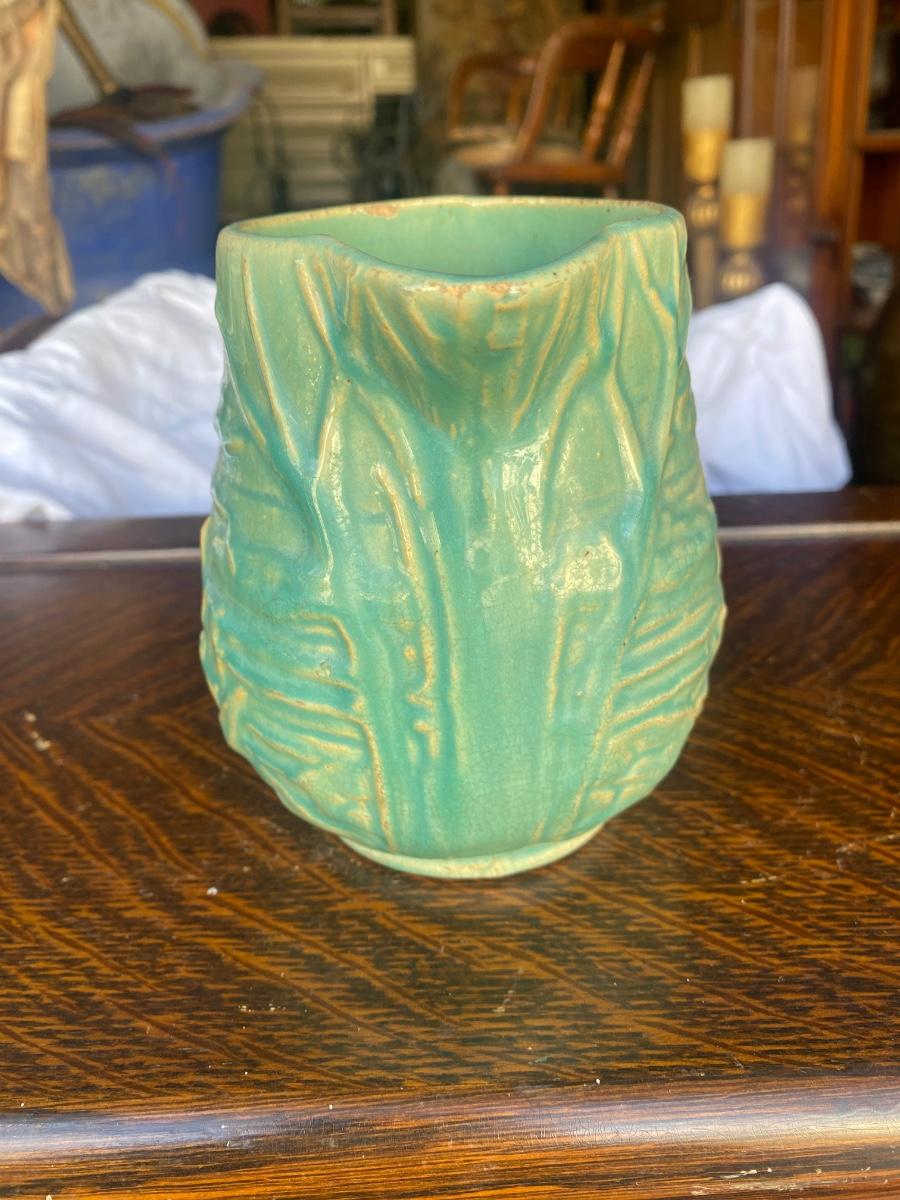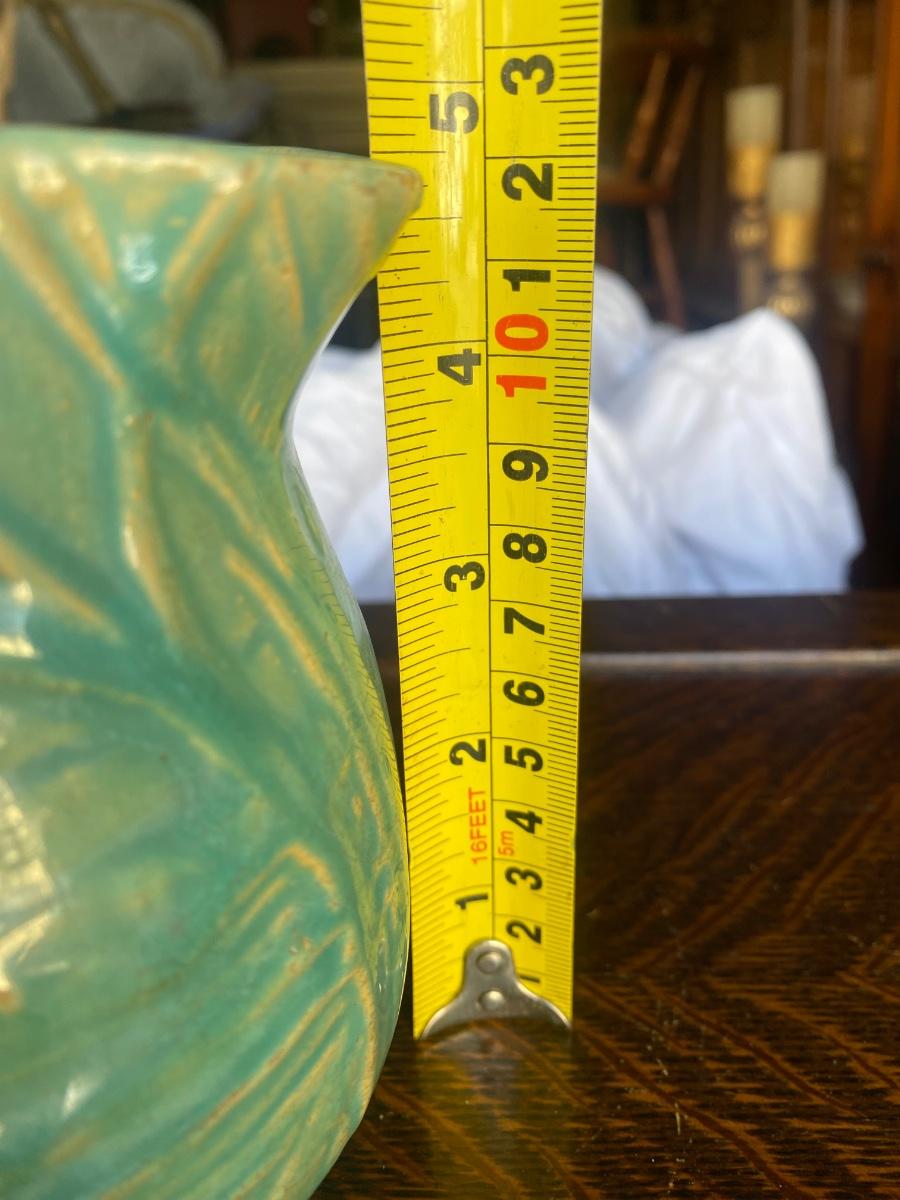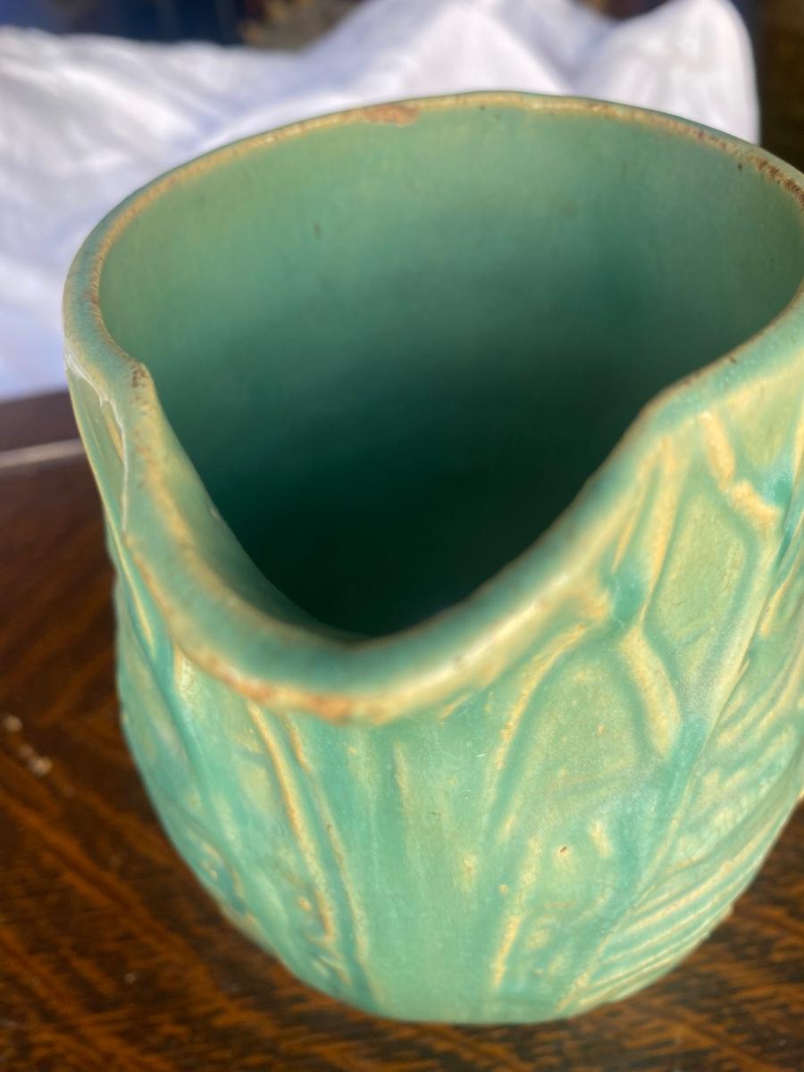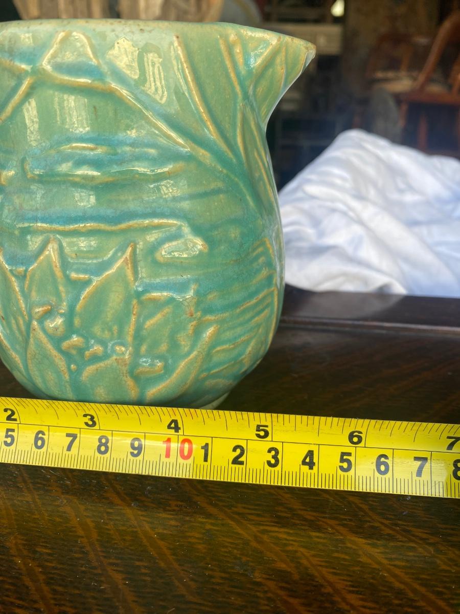 This vintage, 5" tall stoneware pitcher is a piece from the Nelson McCoy Water Lily line, made in the 1930s, marked 124. The embossed greenery and the green/teal glaze make it a stand out, early production piece from McCoy. There is mild overall crazing and a glaze loss, but in otherwise great condition