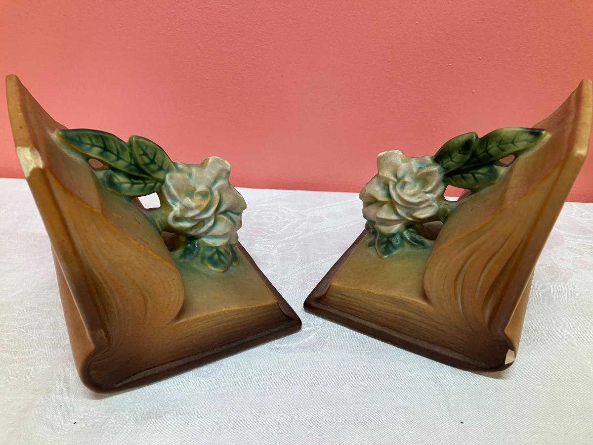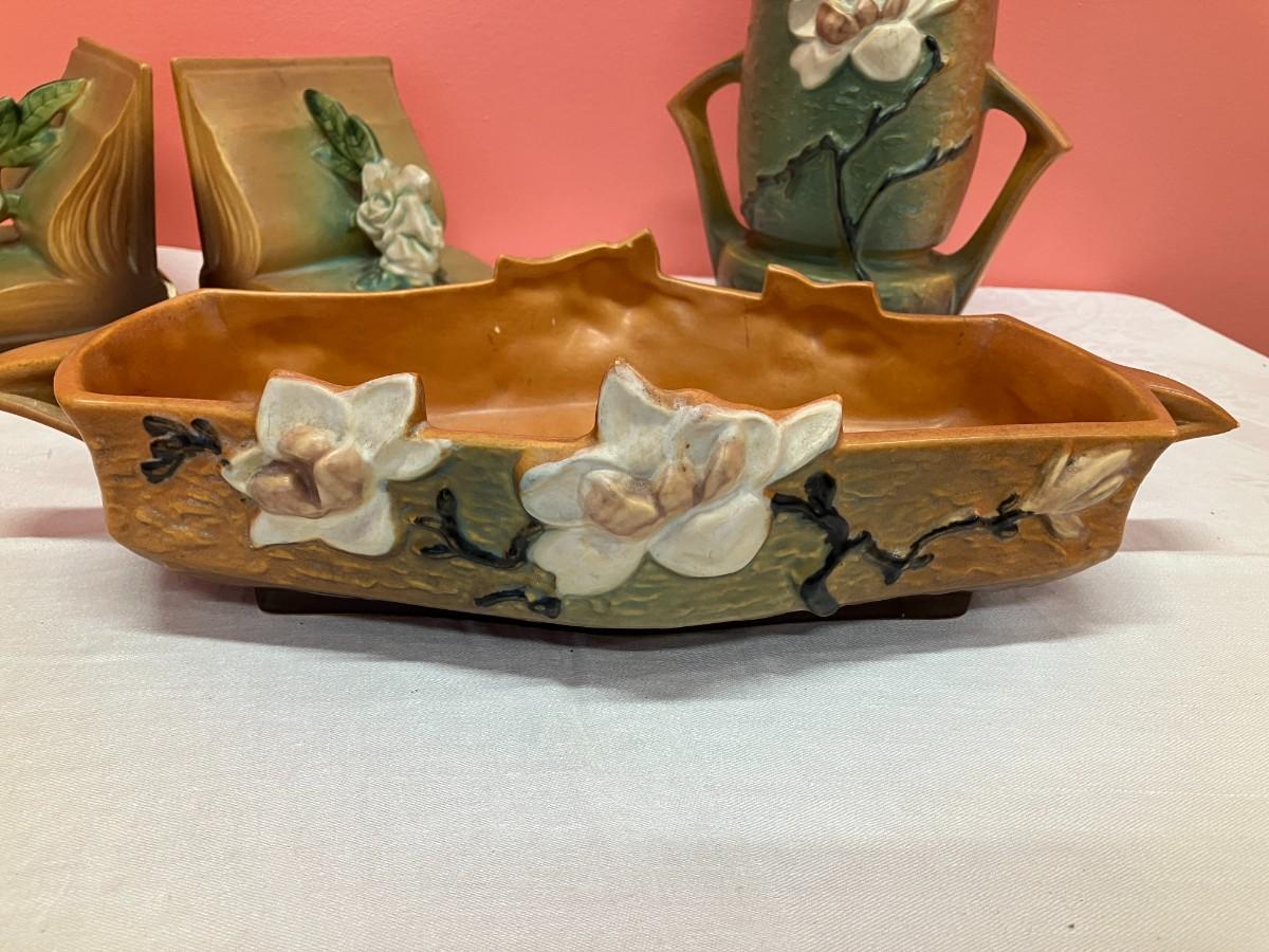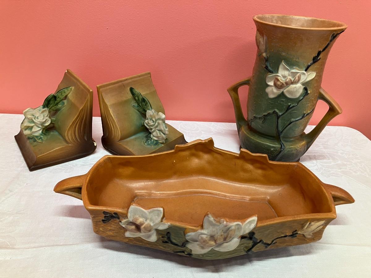 Set of Roseville pieces including a bowl, vase, and bookends. Minor chipping to book end tops.