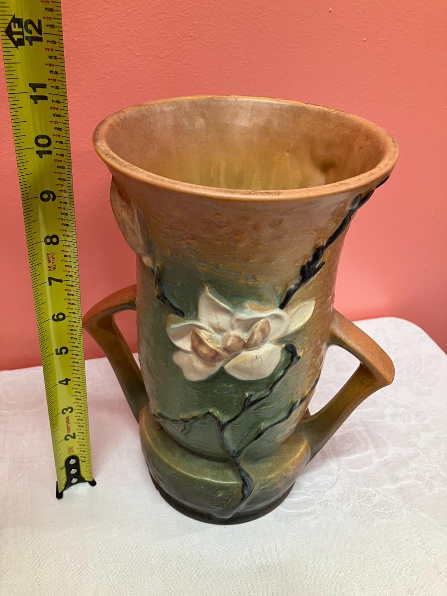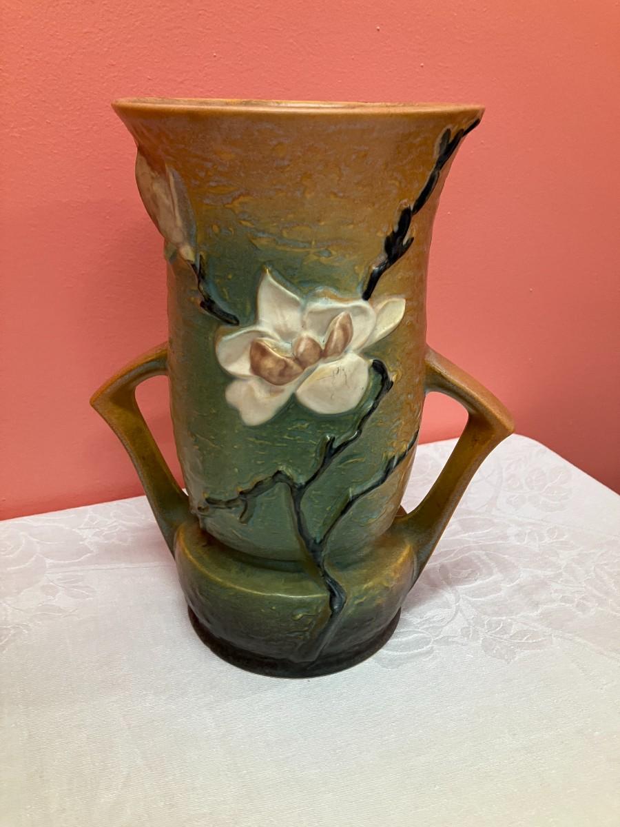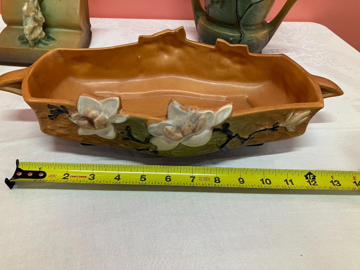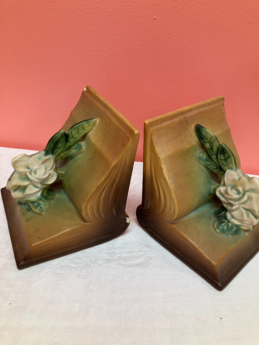 Set of Roseville pieces including a bowl, vase, and bookends. Minor chipping to book end tops.