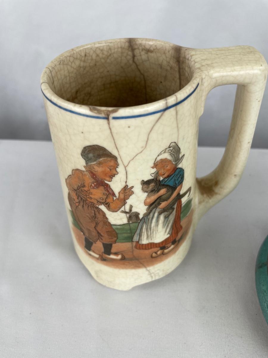 Roseville, cream, pottery mug, stein with boy and girl is extremely cracked