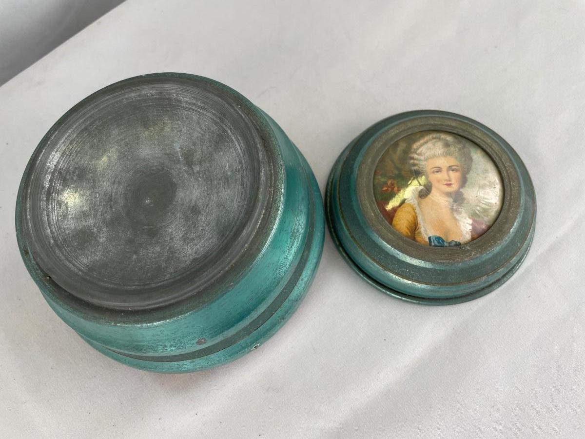 Hand painted Victorian lady, aluminum antique powder, trinket box