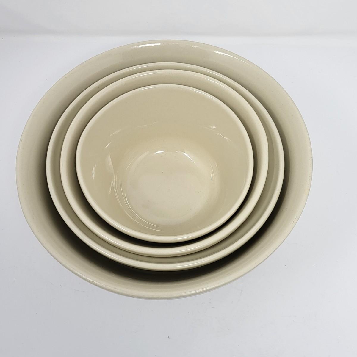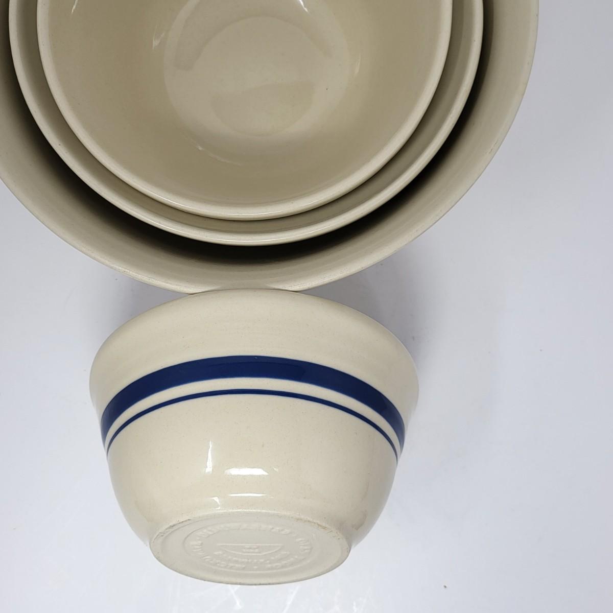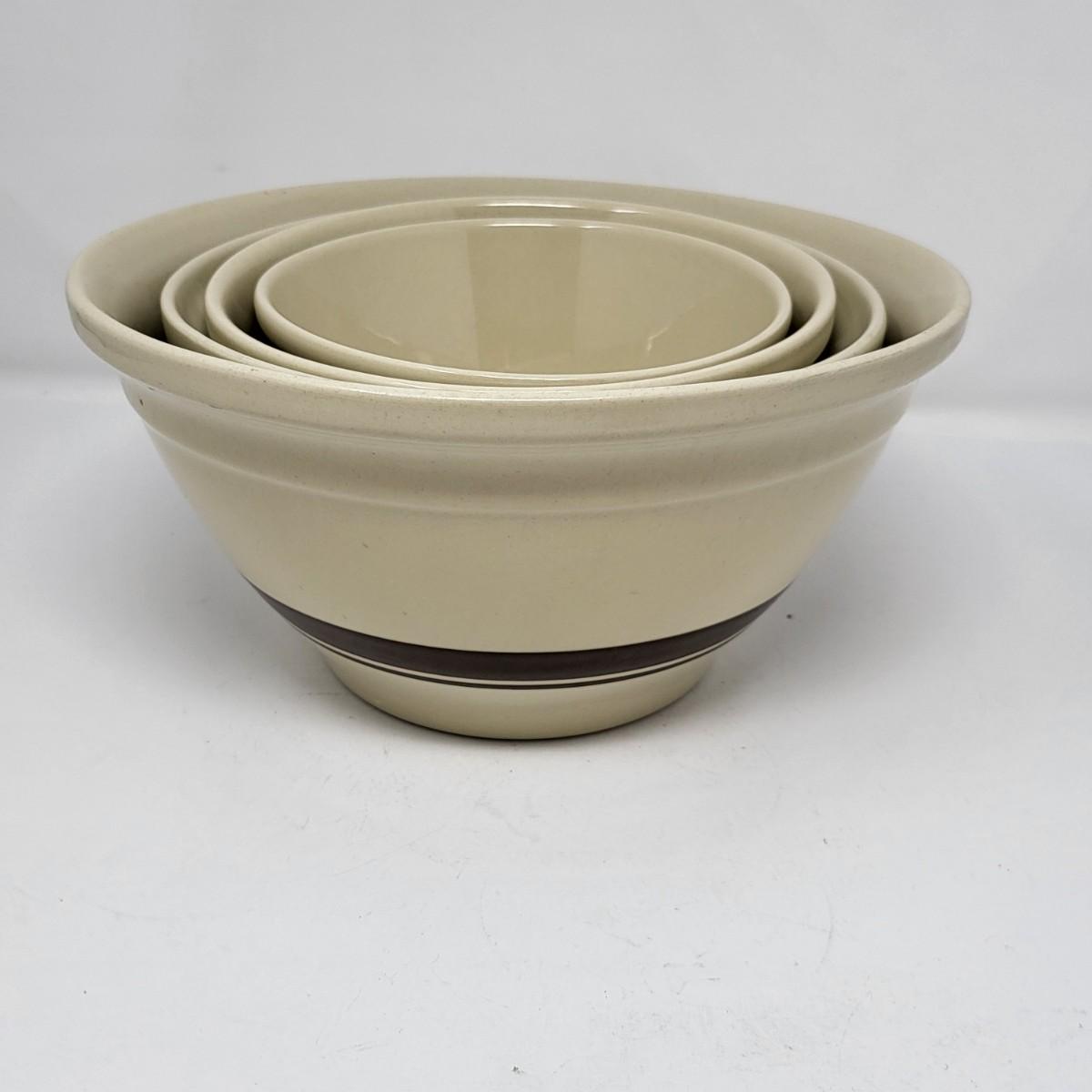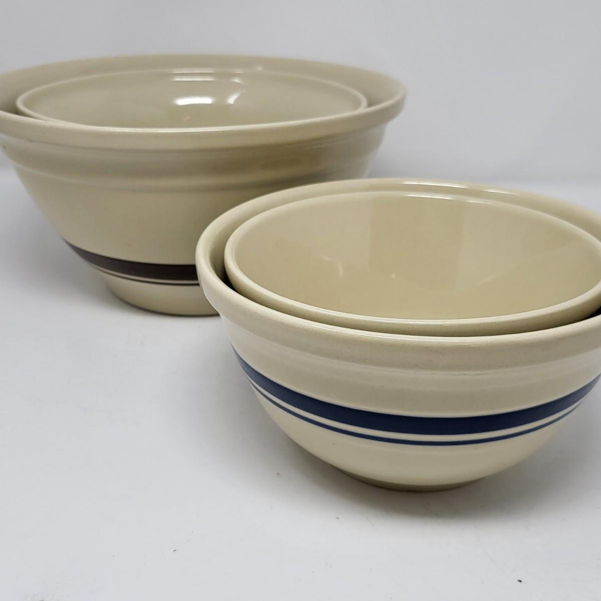 Set of four, Roseville, Ohio, tan and blue stripe, glazed nesting bowls. Smallest measures 6" x 3.75" to largest 10" x 5". Oven, dishwasher, and microwave-safe stoneware.