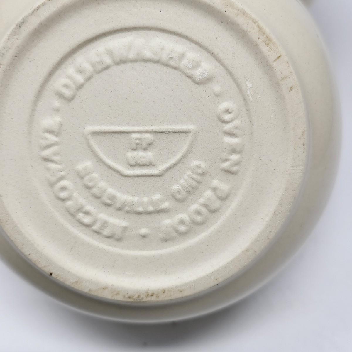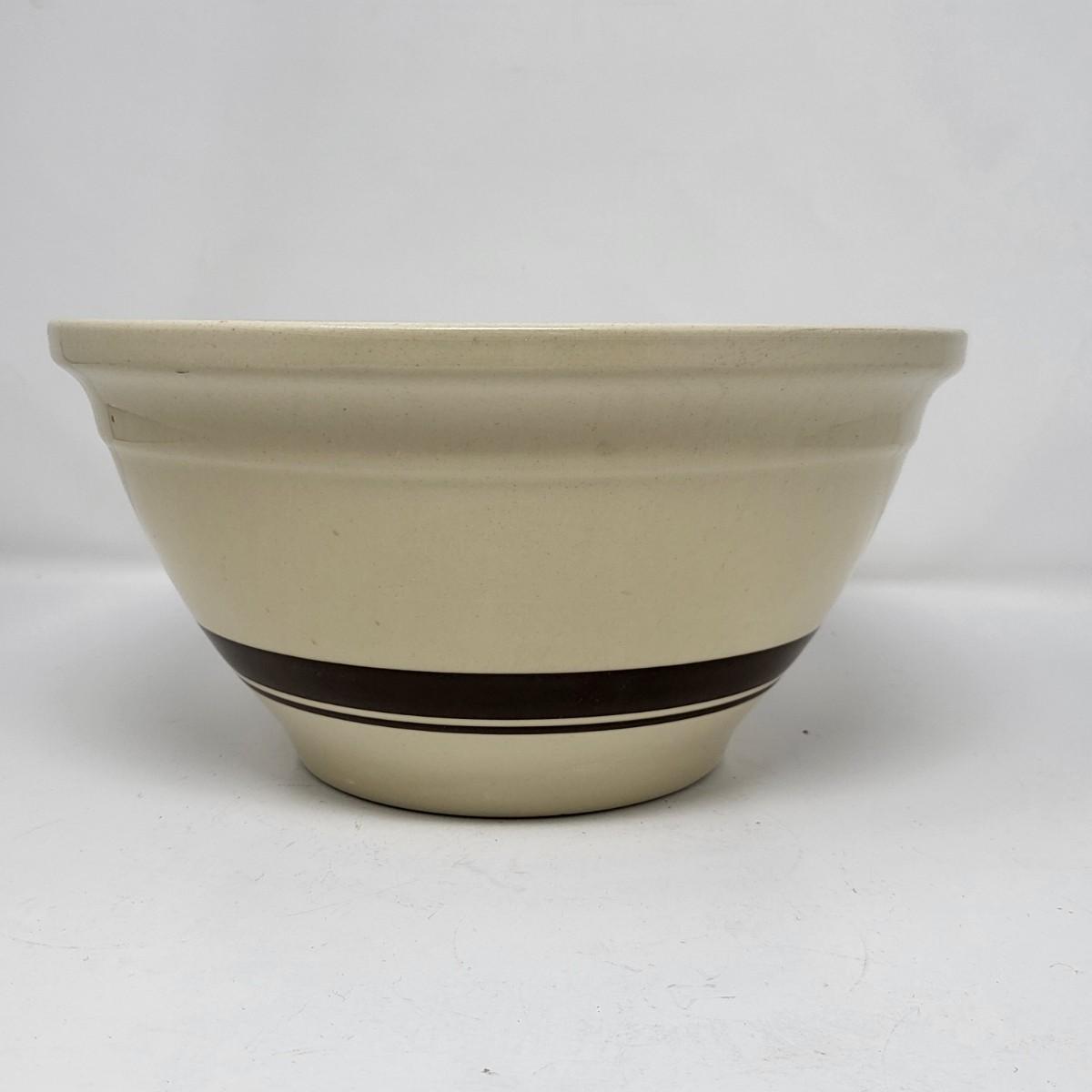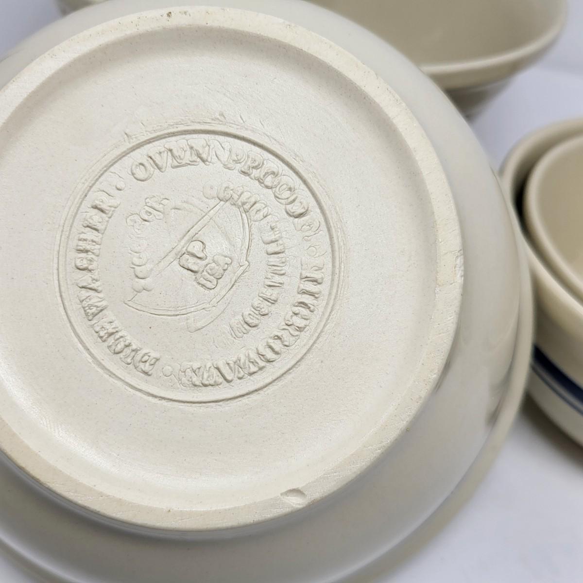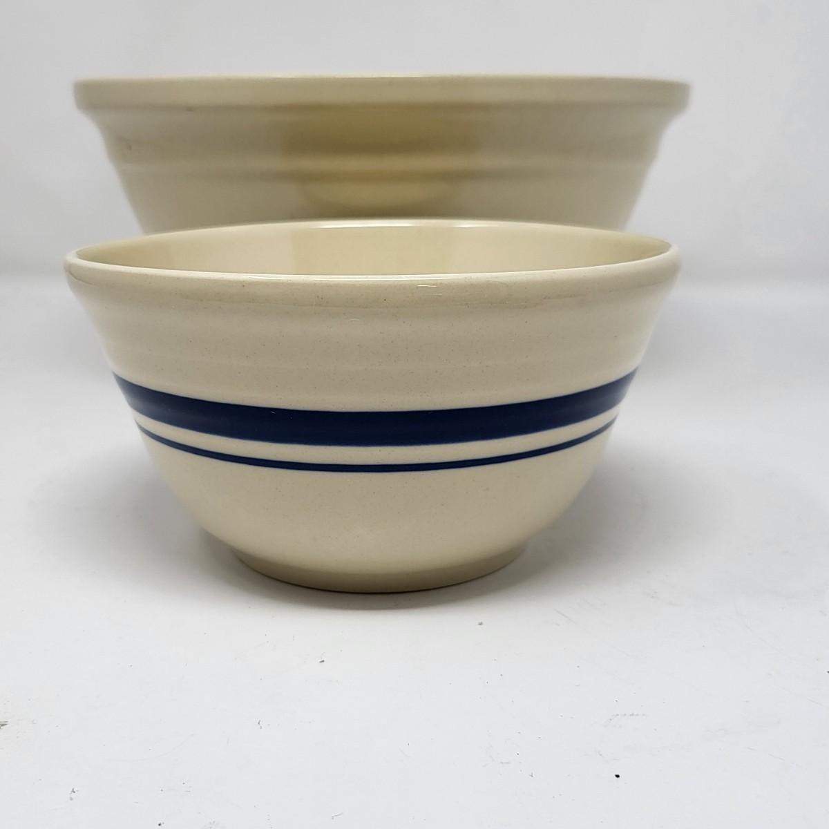 Set of four, Roseville, Ohio, tan and blue stripe, glazed nesting bowls. Smallest measures 6" x 3.75" to largest 10" x 5". Oven, dishwasher, and microwave-safe stoneware.