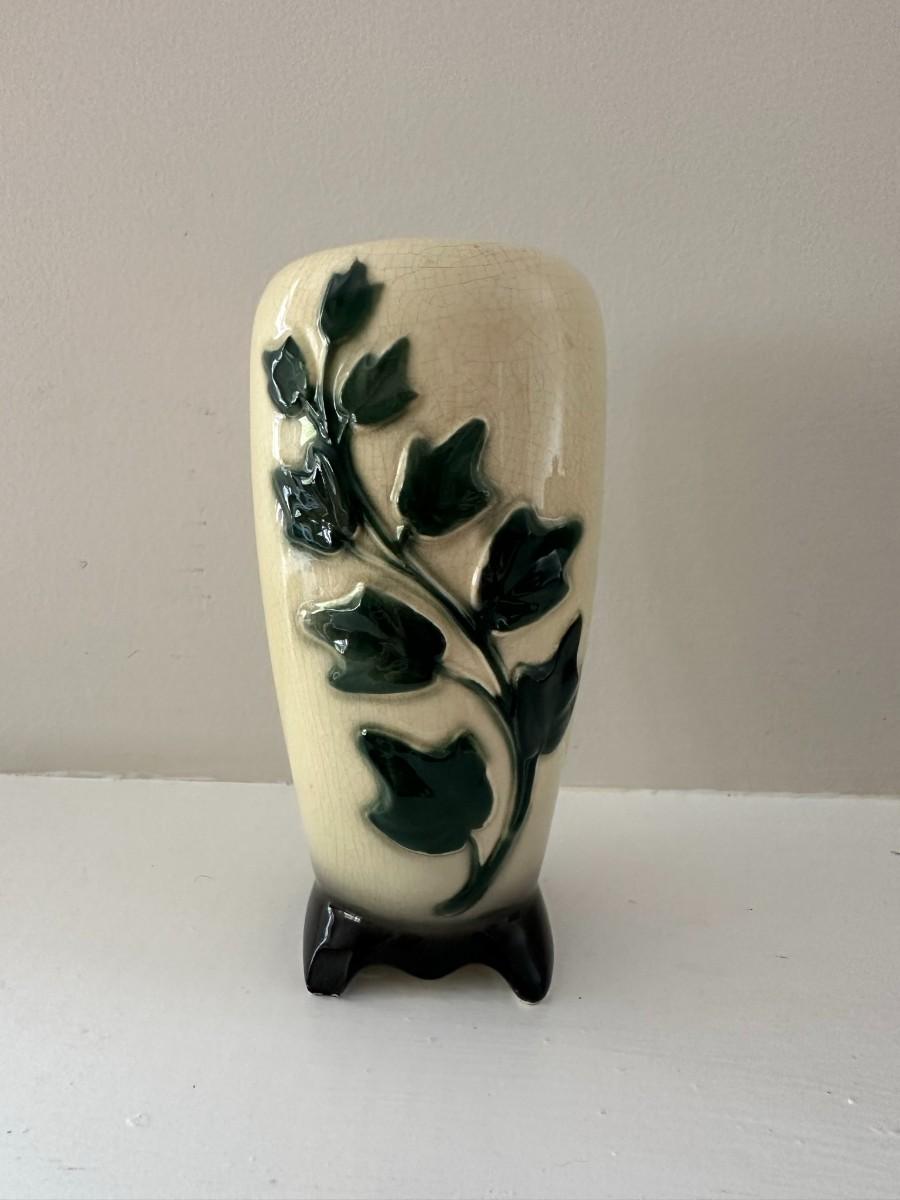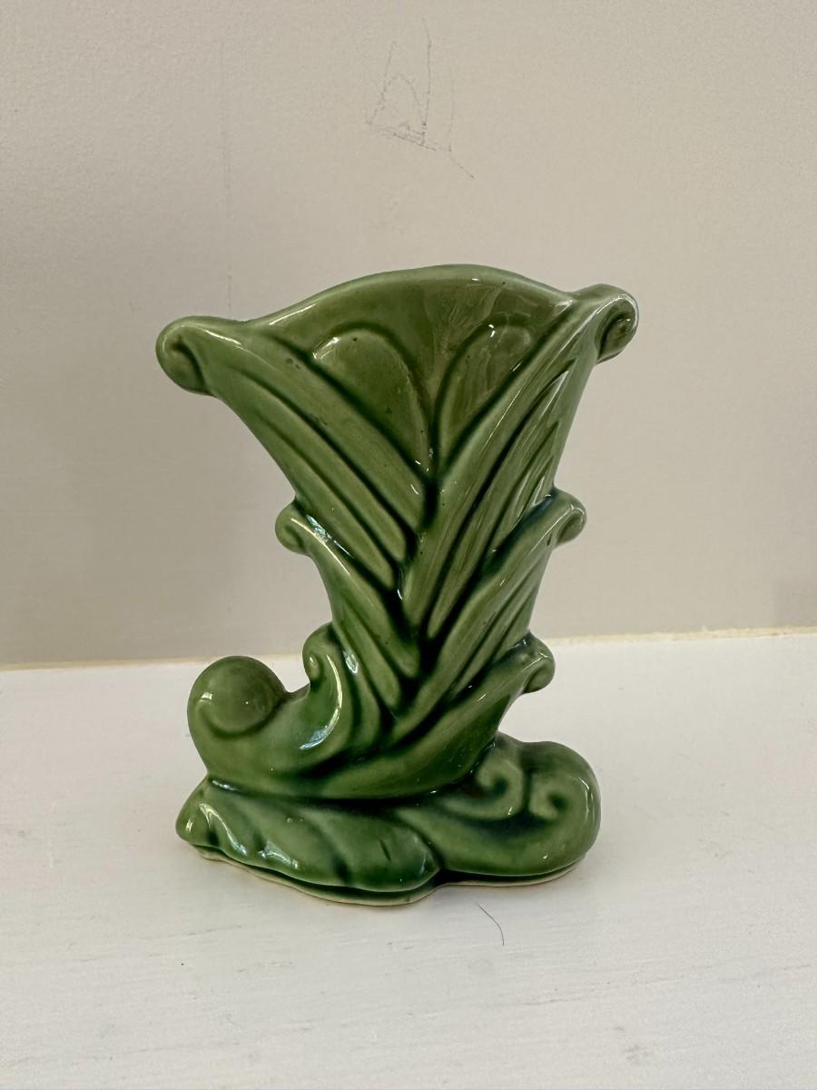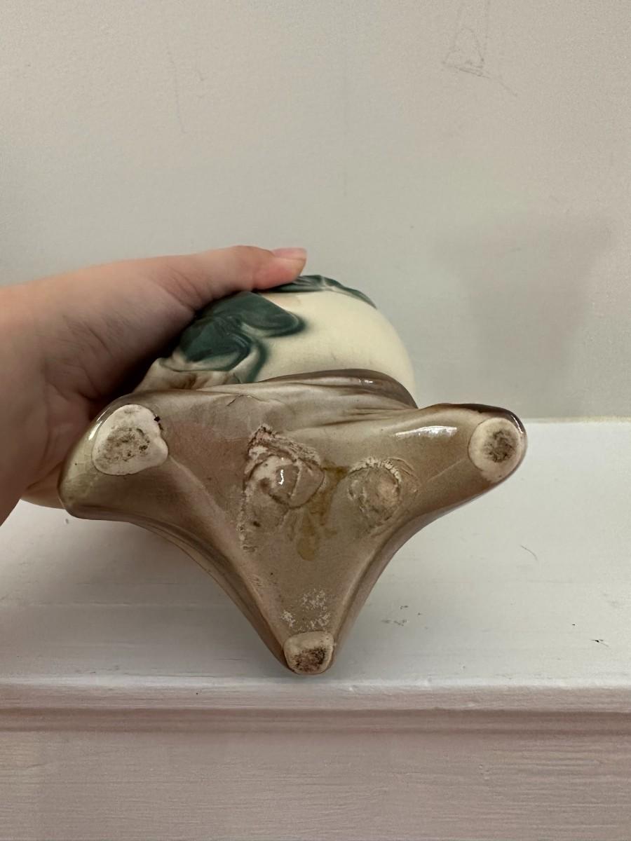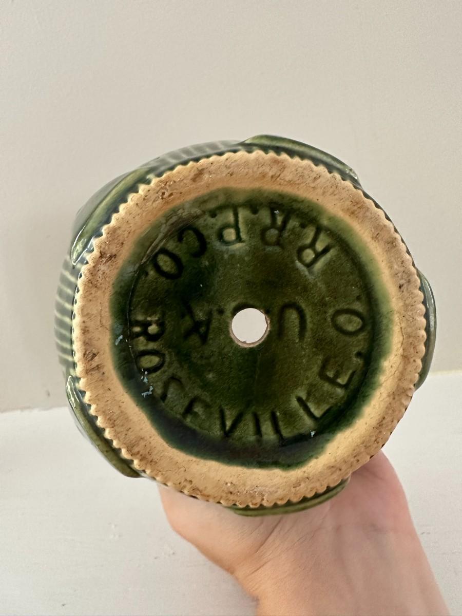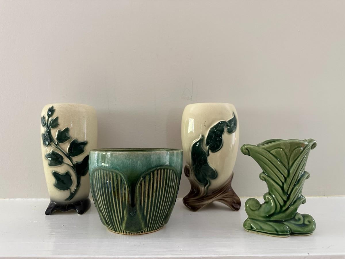 5"w x 4"h Green Roseville Pot. 5"h Green Vase - USA 835. 2 Ivory/Green Vases - 7.25"h and 7"h.