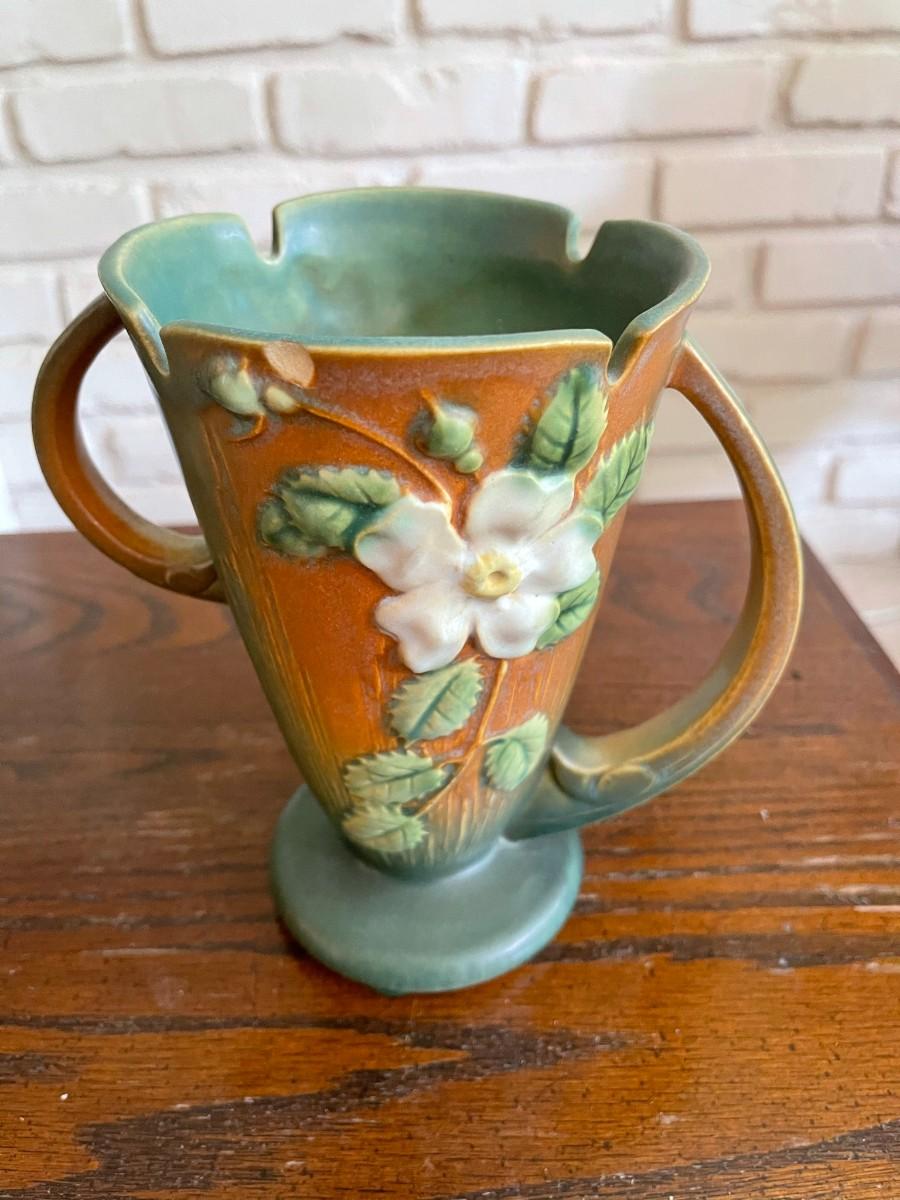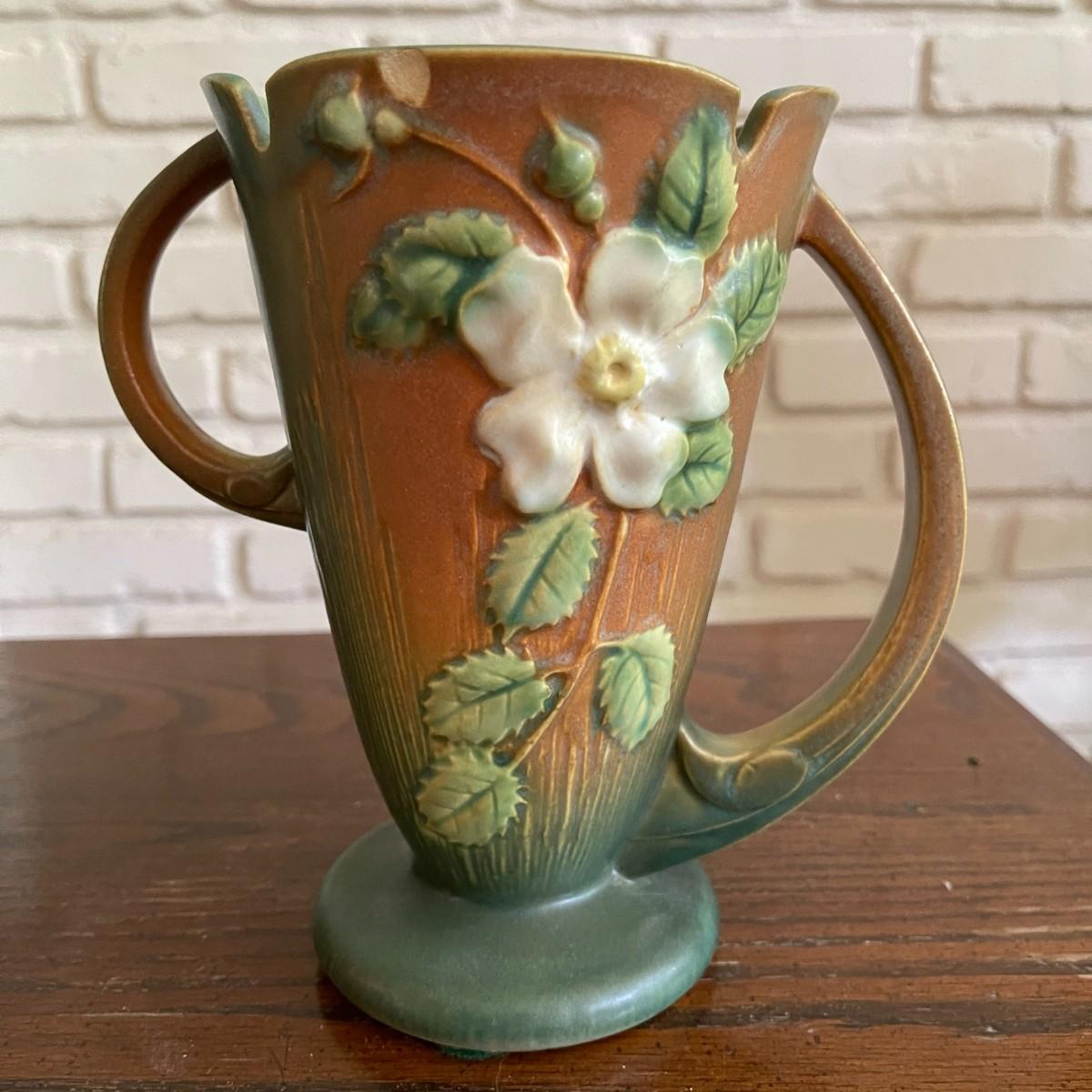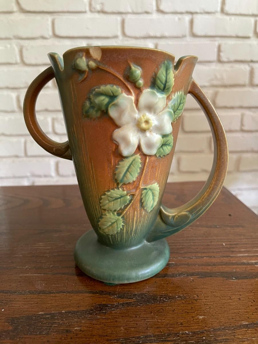 Vintage Roseville Pottery, 1940's White Rose Double Handled Vase 982-7,