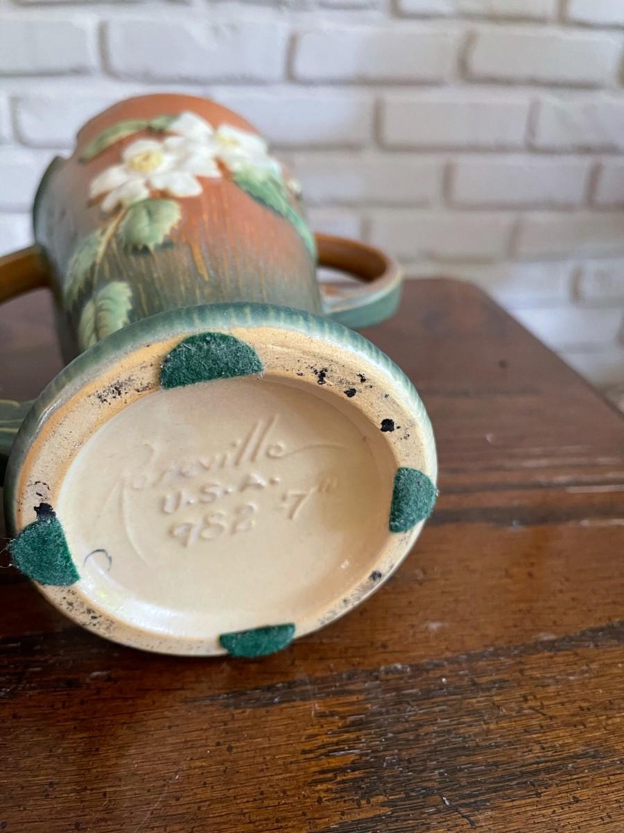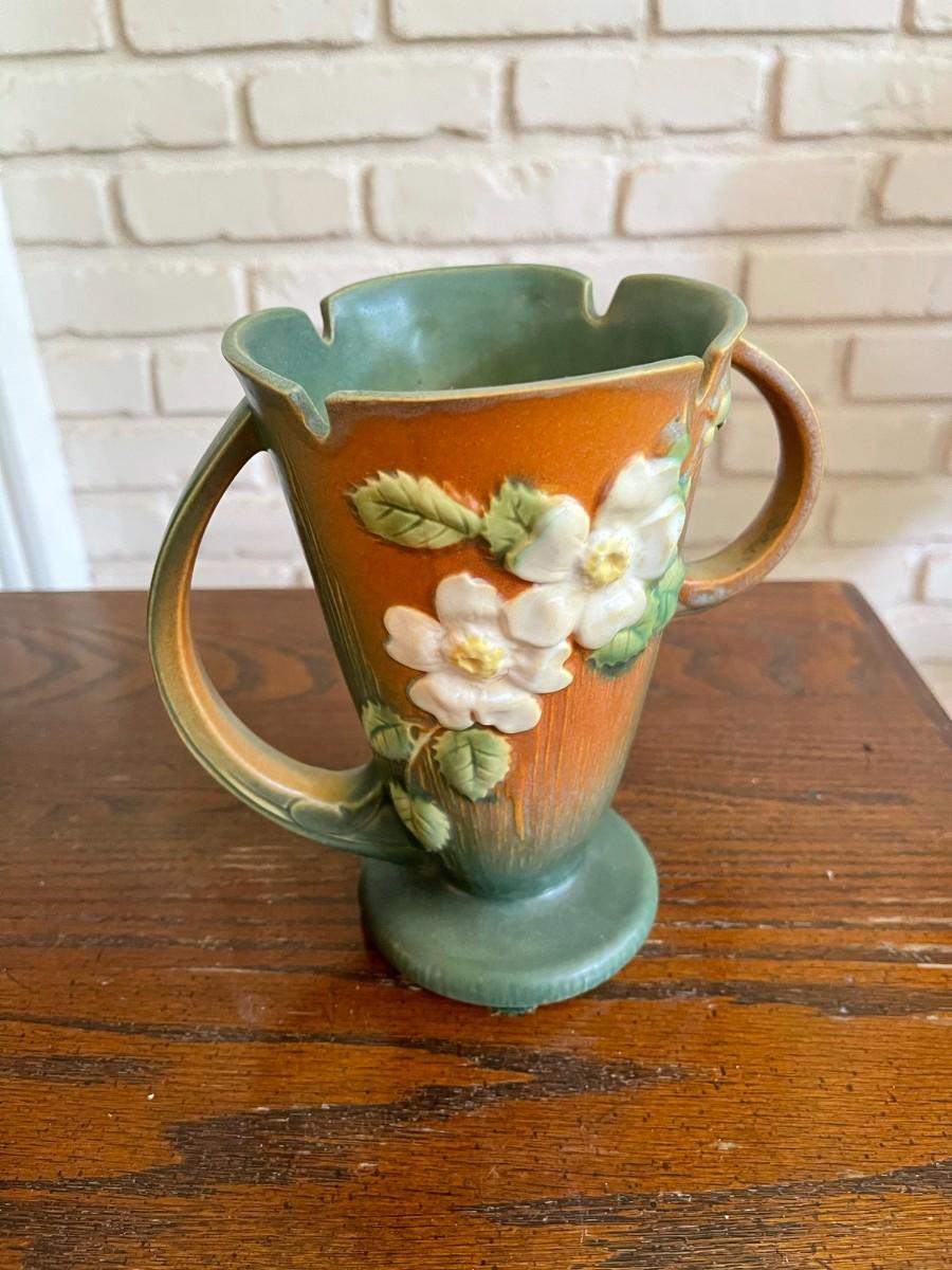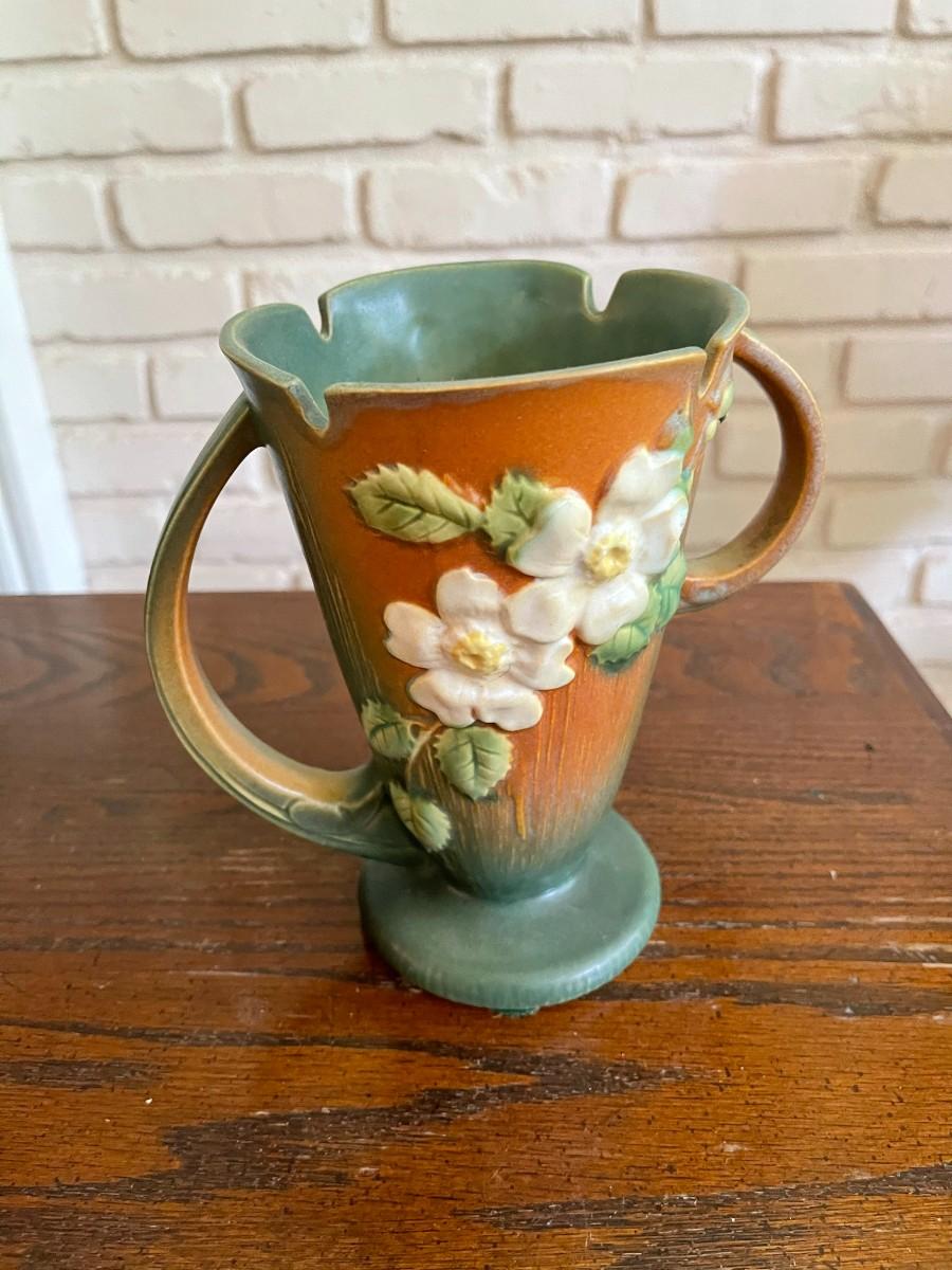Vintage Roseville Pottery, 1940's White Rose Double Handled Vase 982-7,