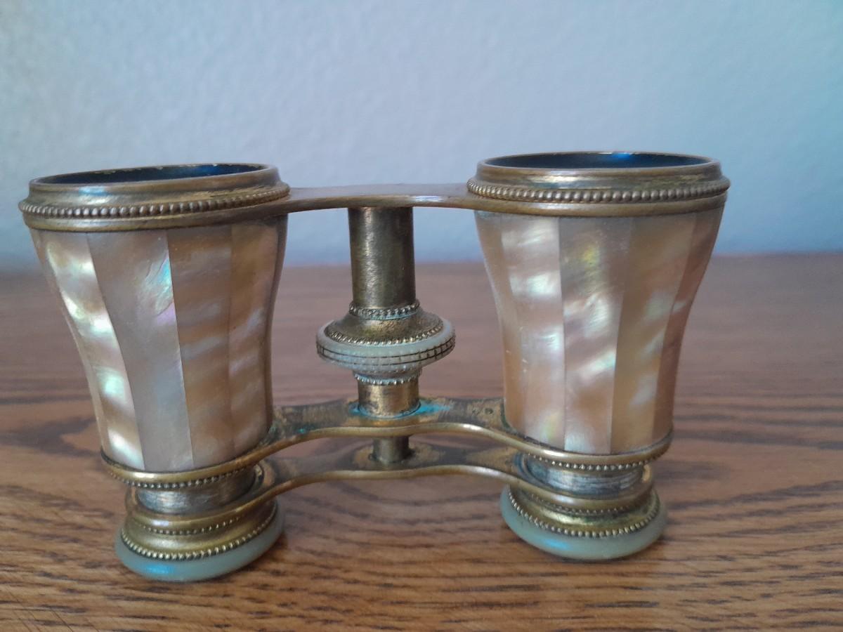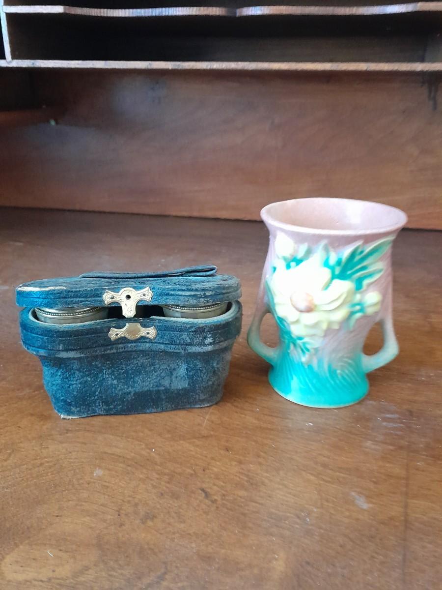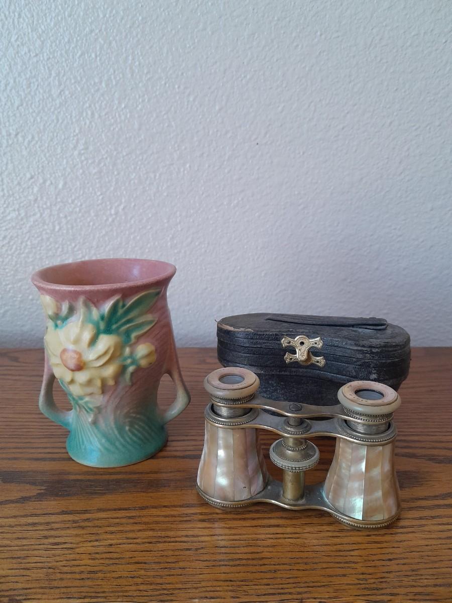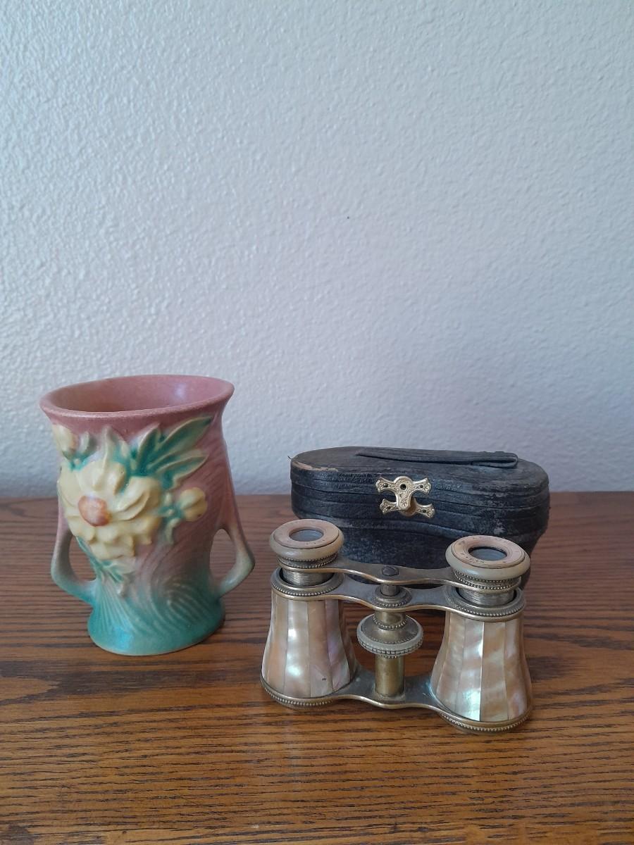 ROSEVILLE POTTERY AND MOTHER OF PEARL OPERA GLASSES WITH CASE