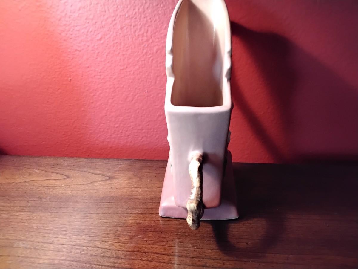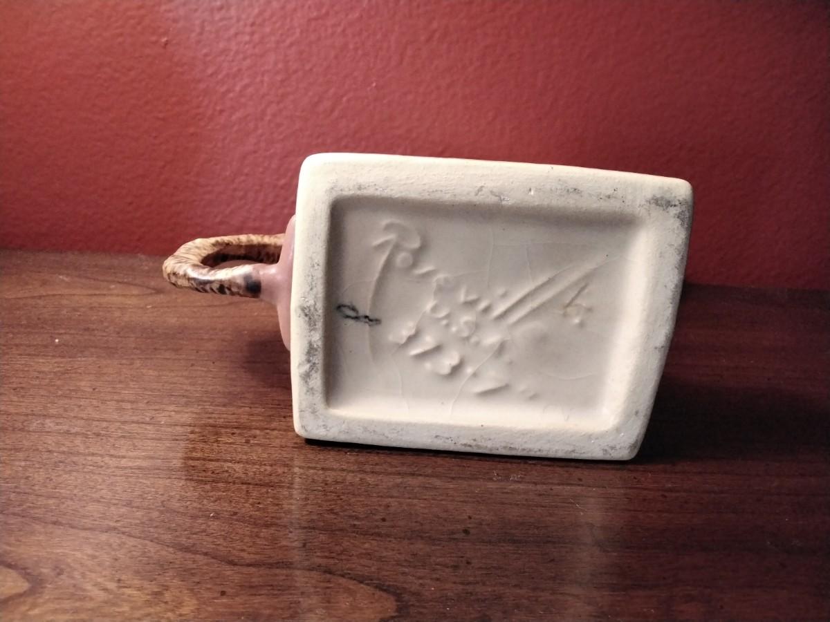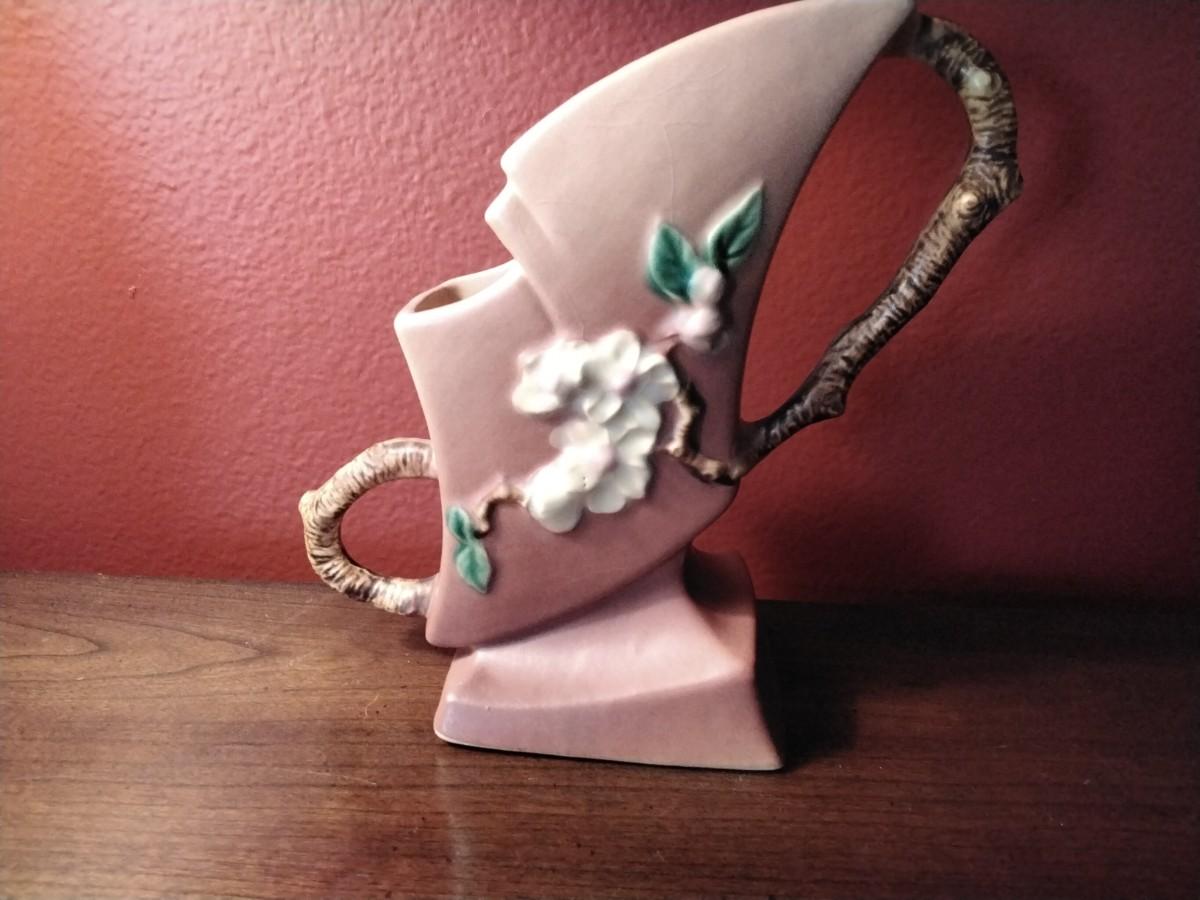 Roseville Pottery Apple Blossom pink handled vase. Good form and color. EXCELLENT ORIGINAL CONDITION. No chips, cracks, damage or repair of any kind. Bottom marked with Roseville, USA and 373-7. Vase is 7 1/2" tall and 7 1/2" wide from handle to handle.