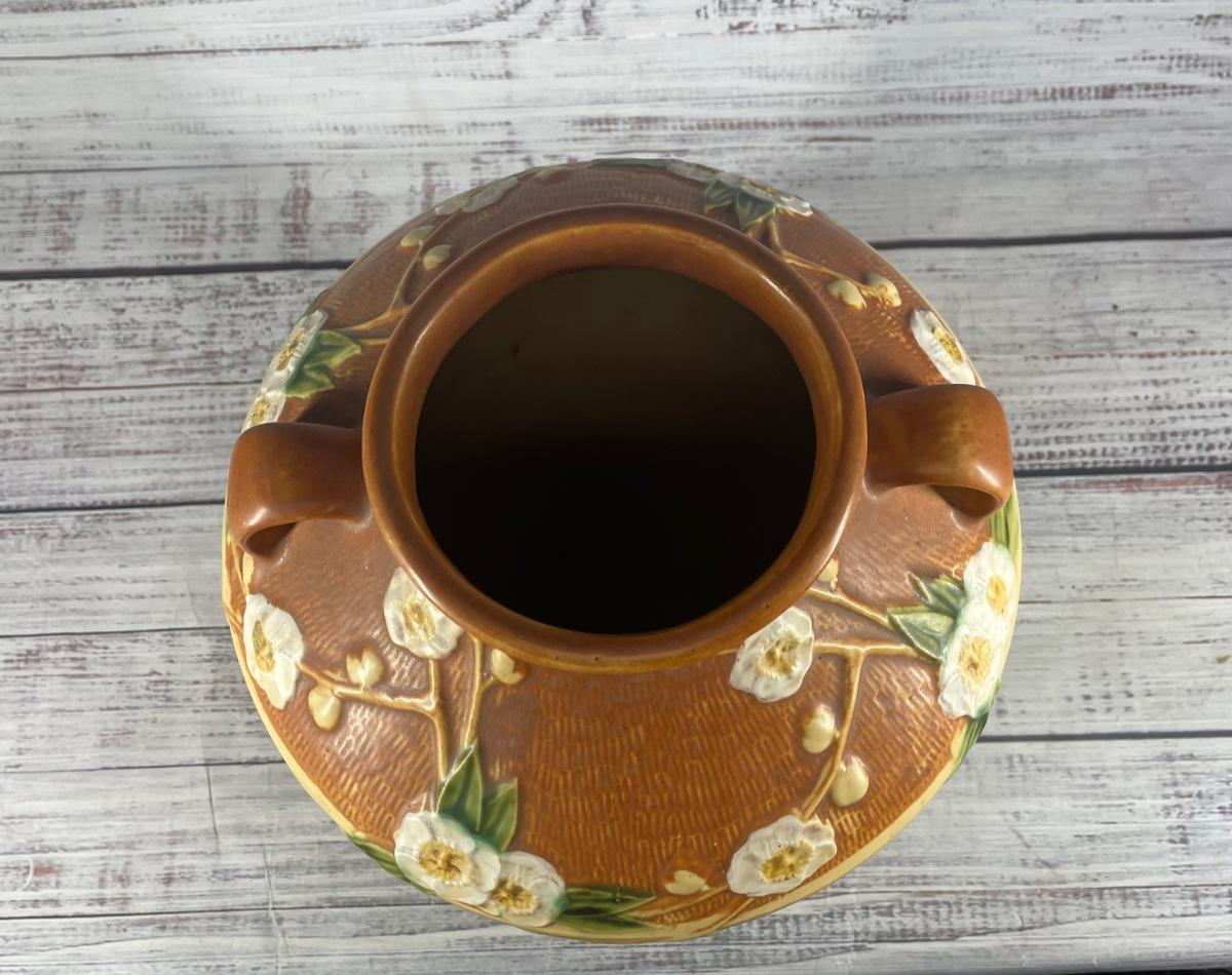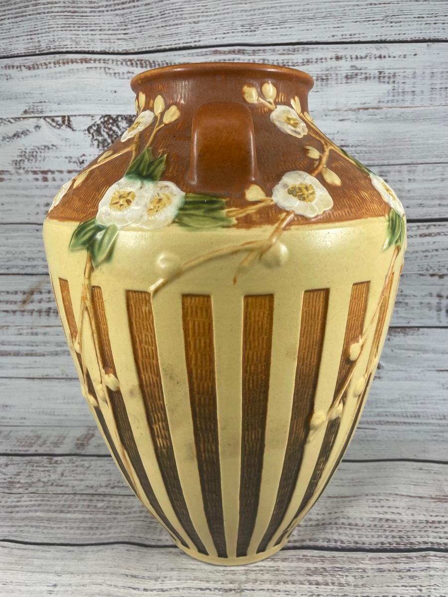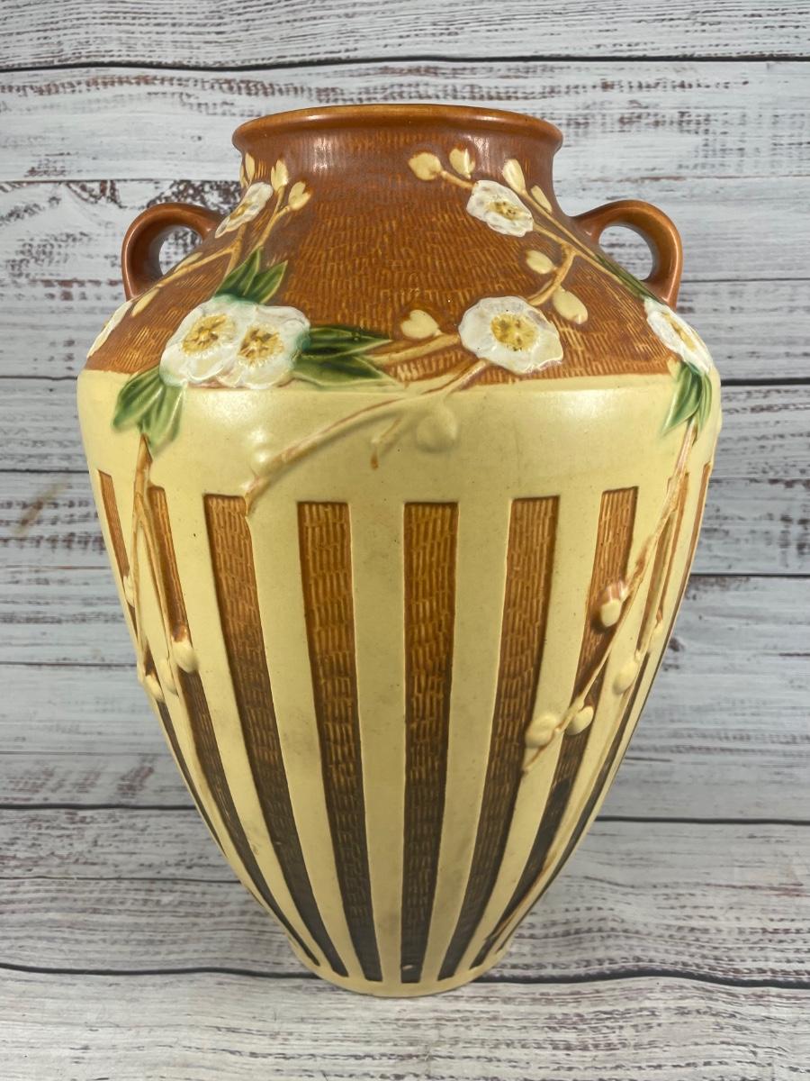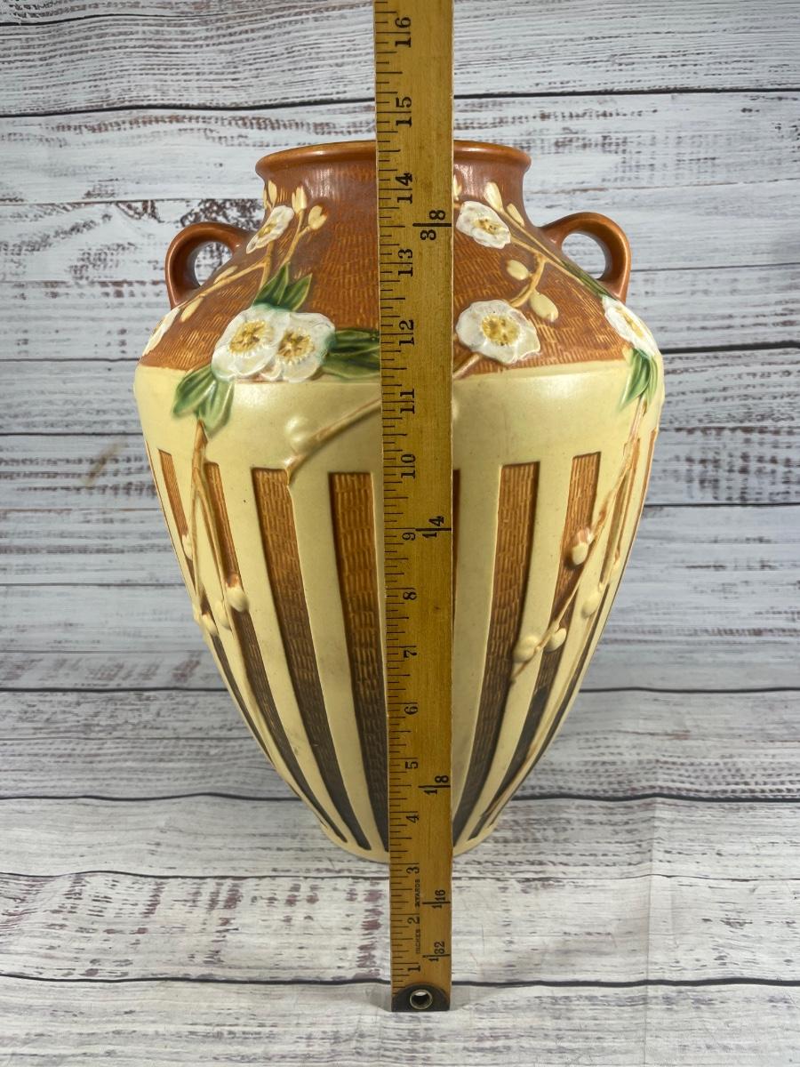Vintage Beige Brown Roseville Pottery Cherry Blossom Floor Vase Vessel Urn 628-15