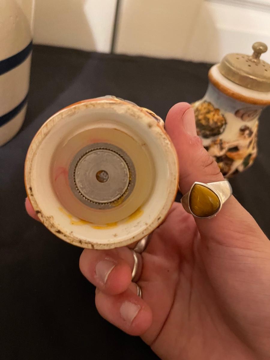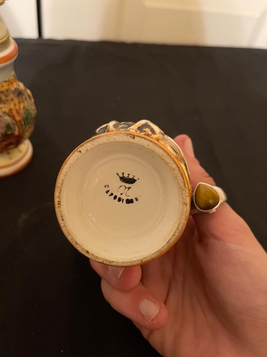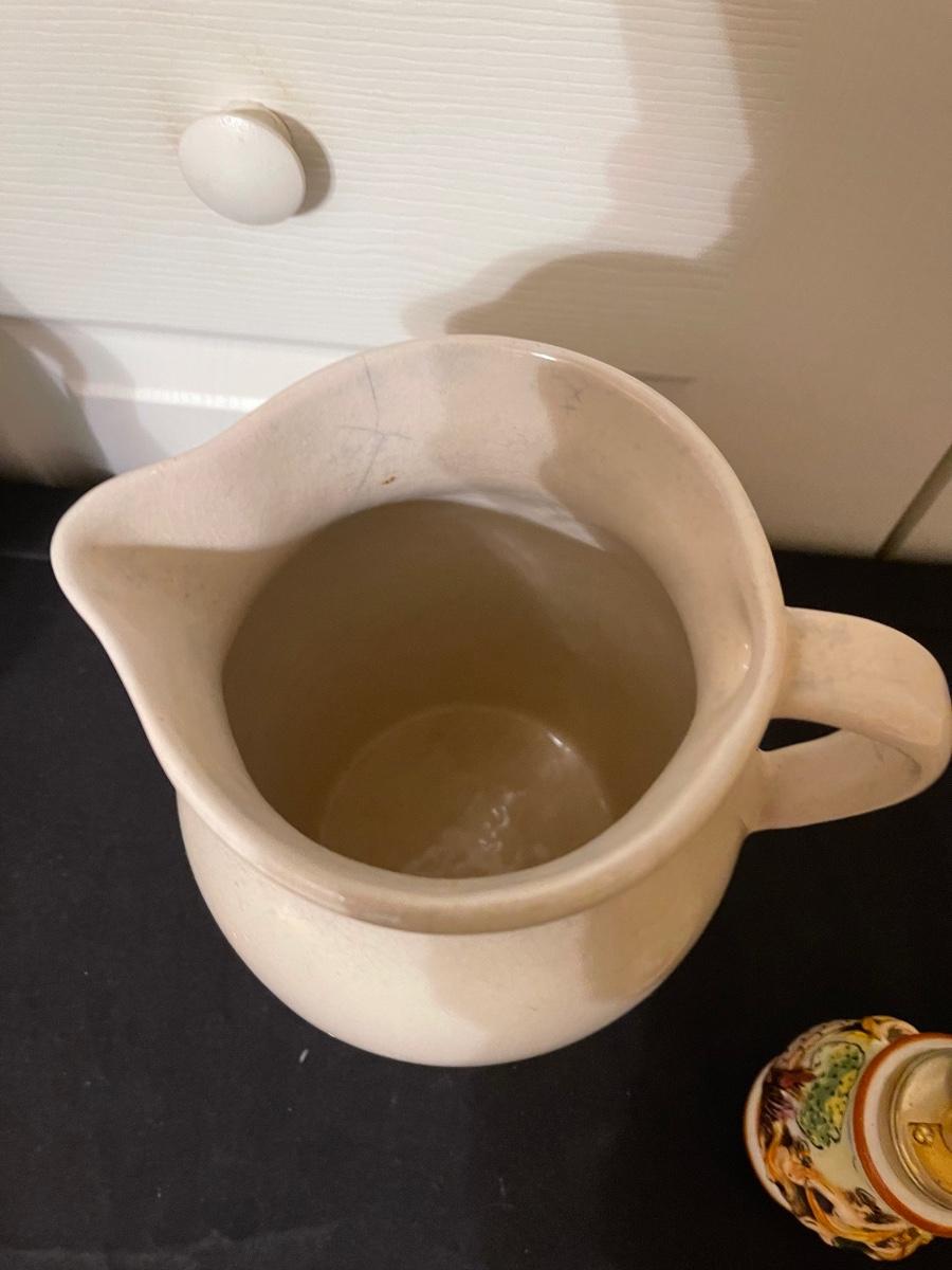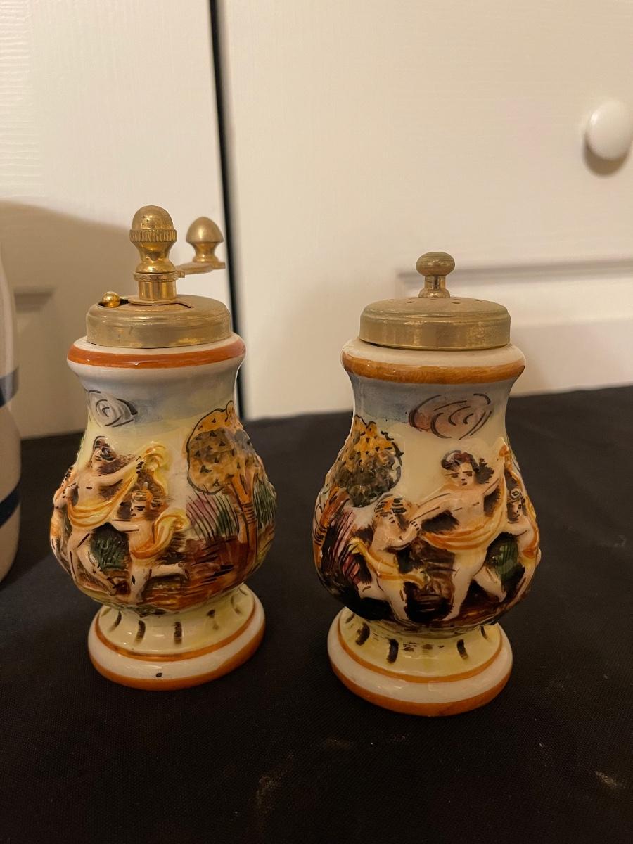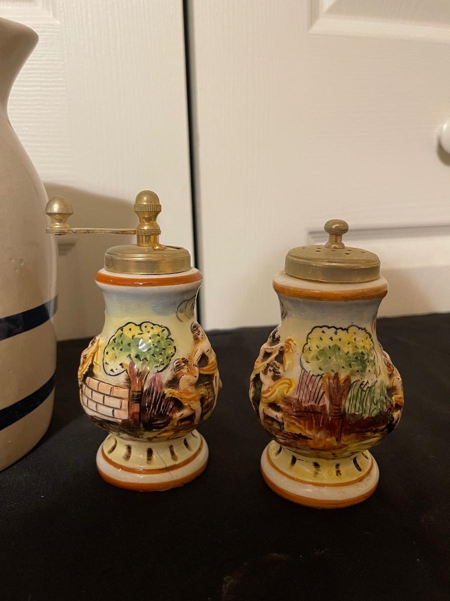 Roseville Pottery Pitcher and capodimonte s+p shakers