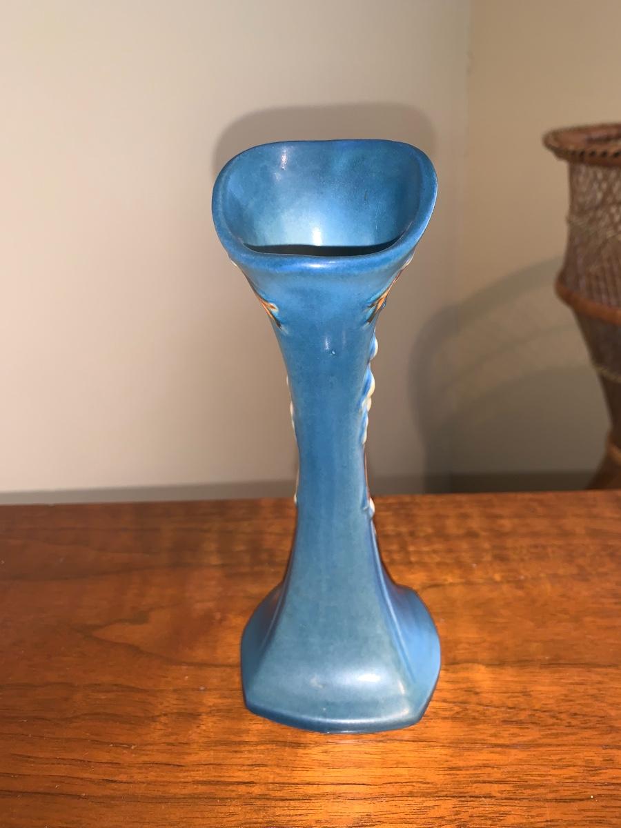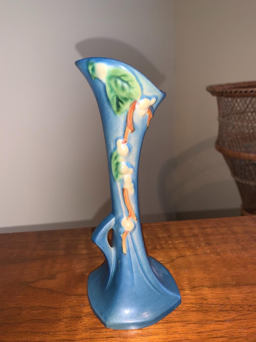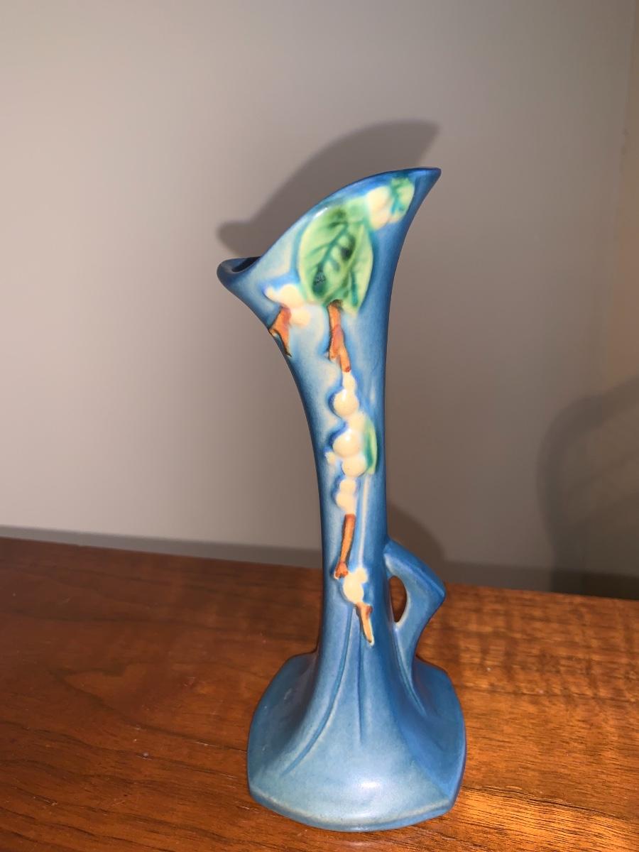 art pottery vase made by the Roseville Pottery Company of Zanesville, Ohio. The pattern is called "Snowberry" and it is done in the ever popular "Rose Bud" or just "Bud" vase shape. This vase is a nice cabinet size as it stands 7 3/8" tall 3 7/8" wide at the foot. There is a small chip on theunderside of the vase as shown in photos