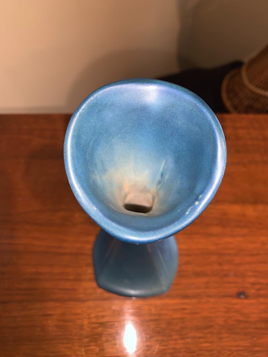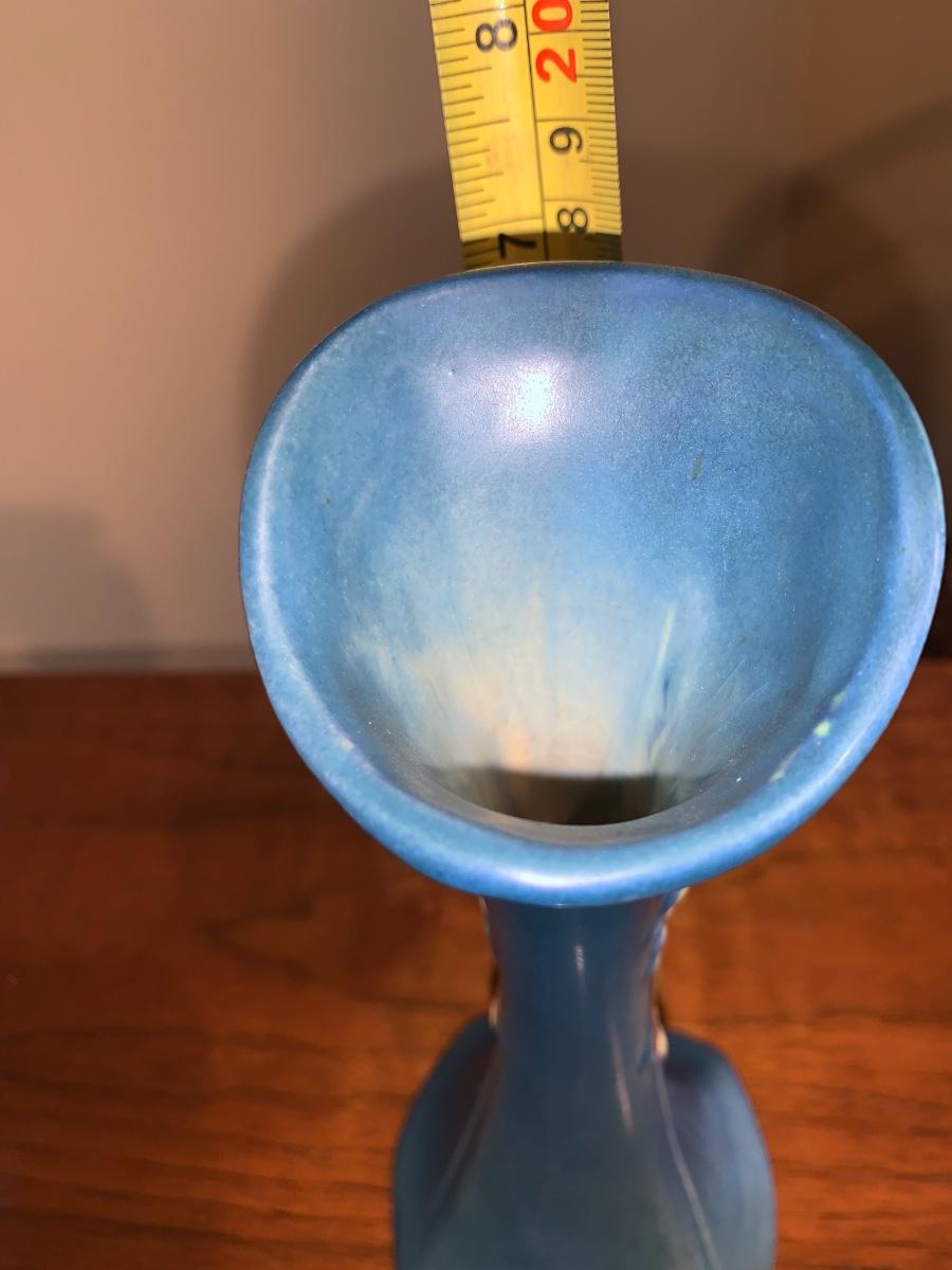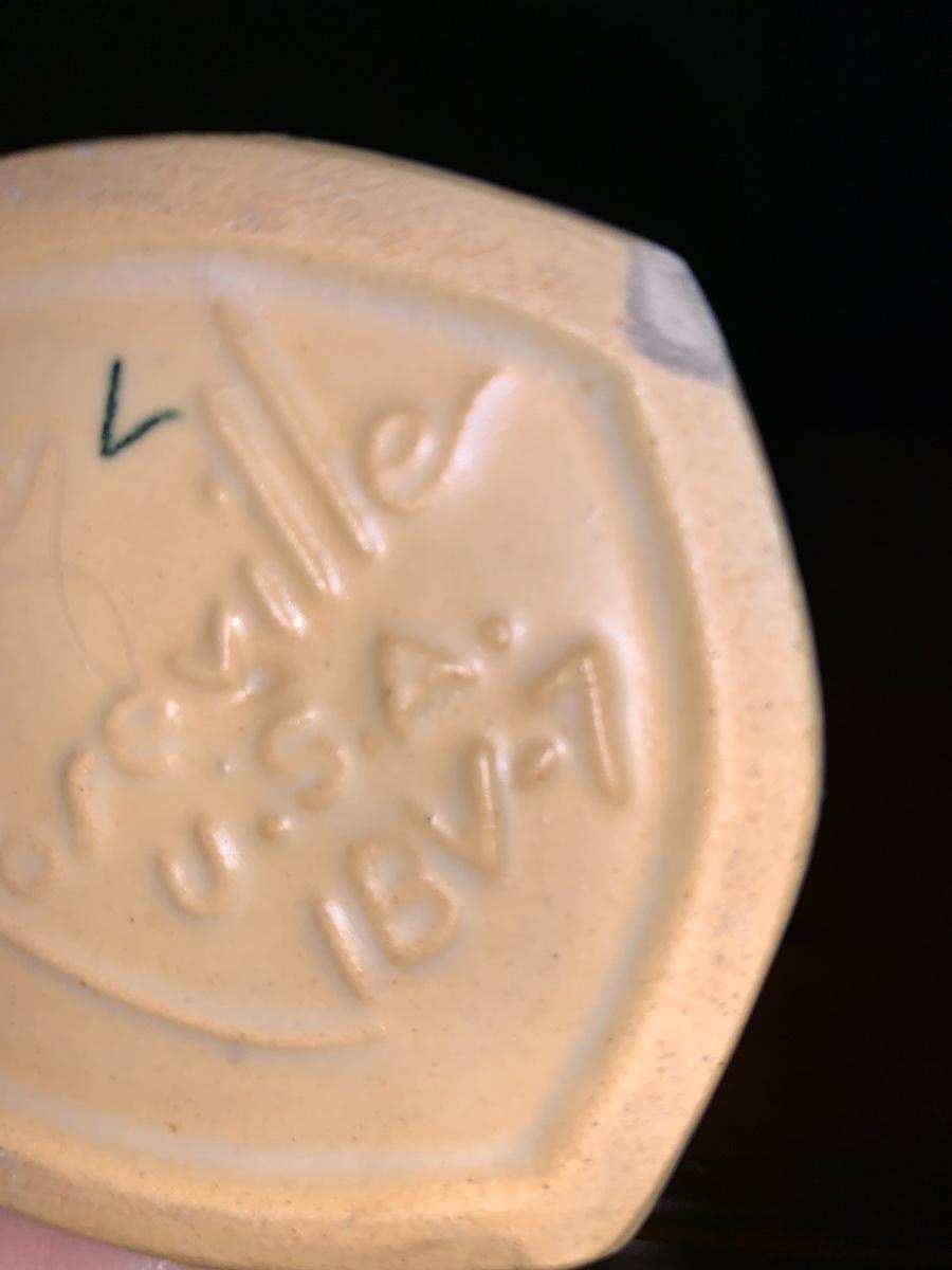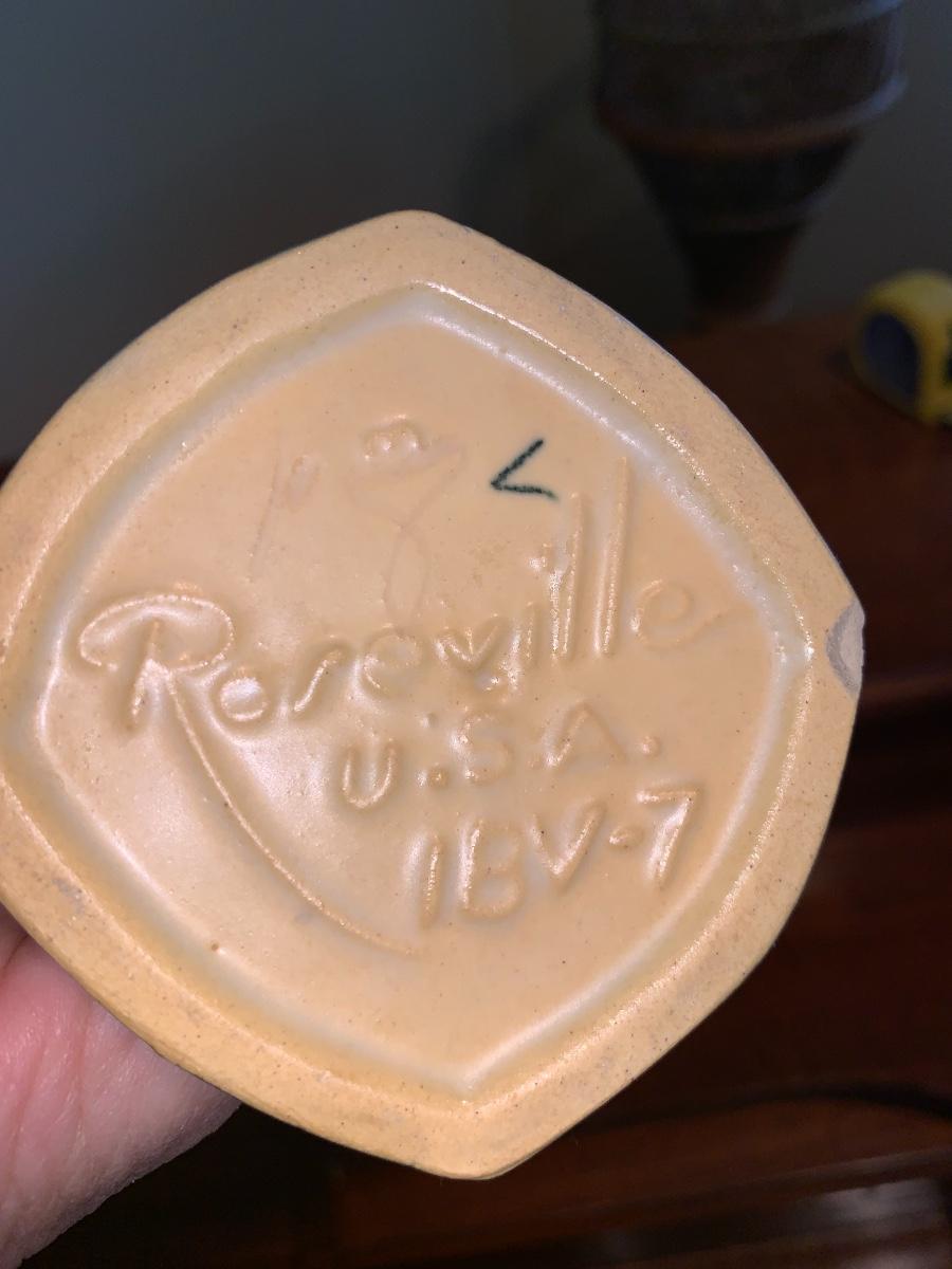 art pottery vase made by the Roseville Pottery Company of Zanesville, Ohio. The pattern is called "Snowberry" and it is done in the ever popular "Rose Bud" or just "Bud" vase shape. This vase is a nice cabinet size as it stands 7 3/8" tall 3 7/8" wide at the foot. There is a small chip on theunderside of the vase as shown in photos