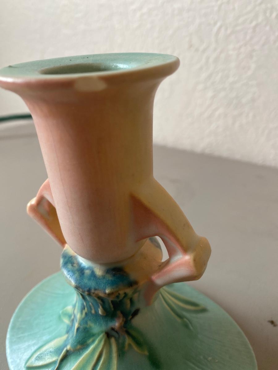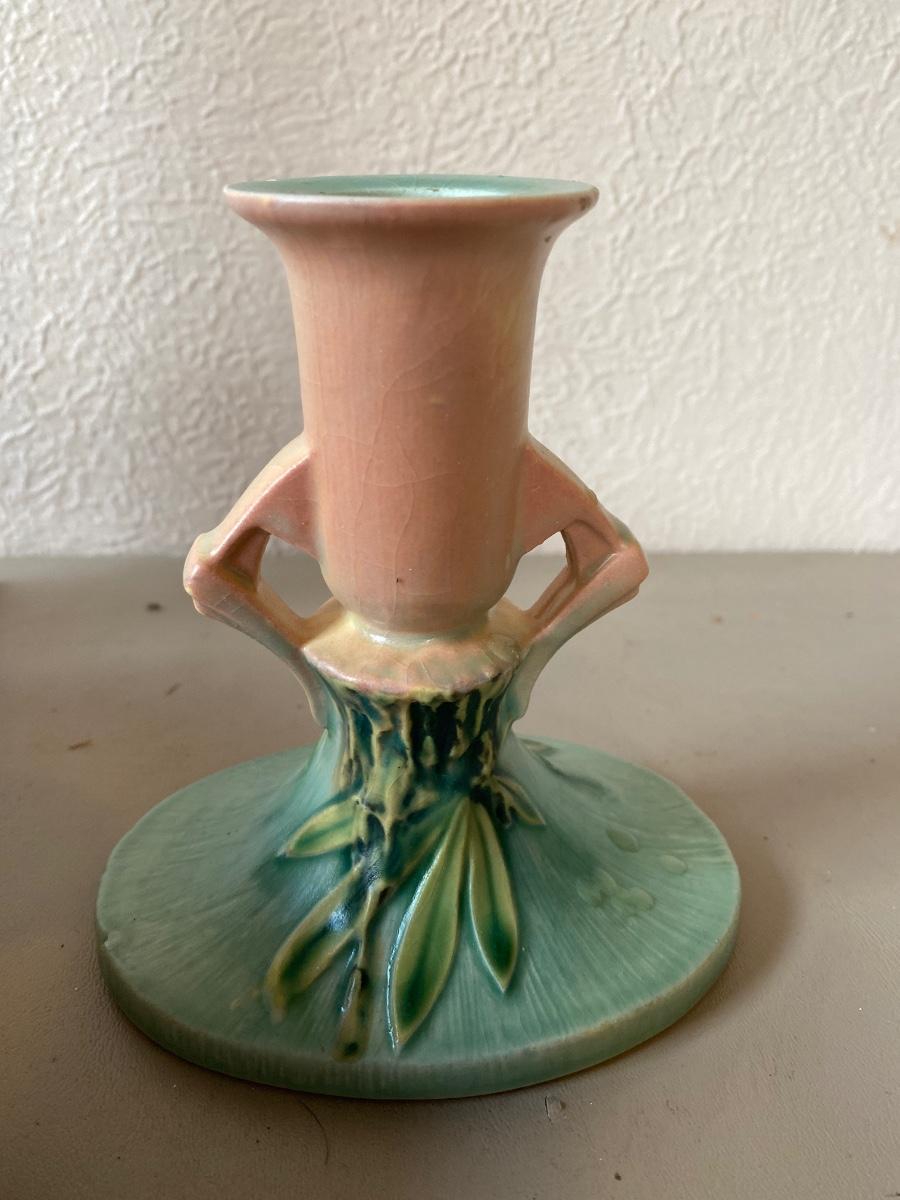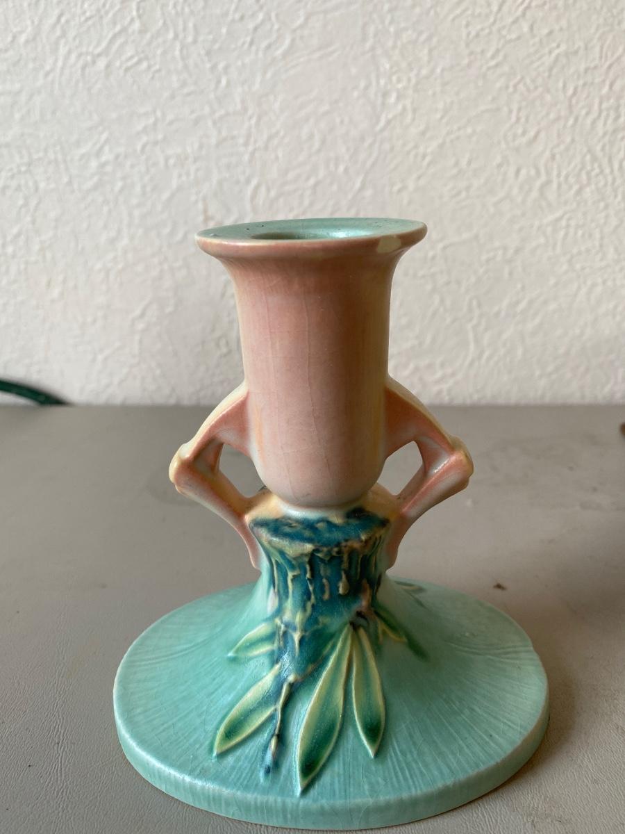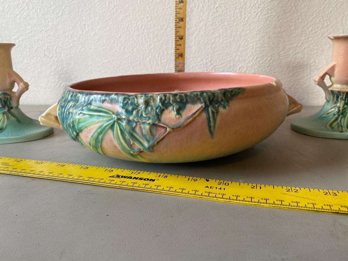Vintage Roseville bowl and candle holders. There are some minor chipping.