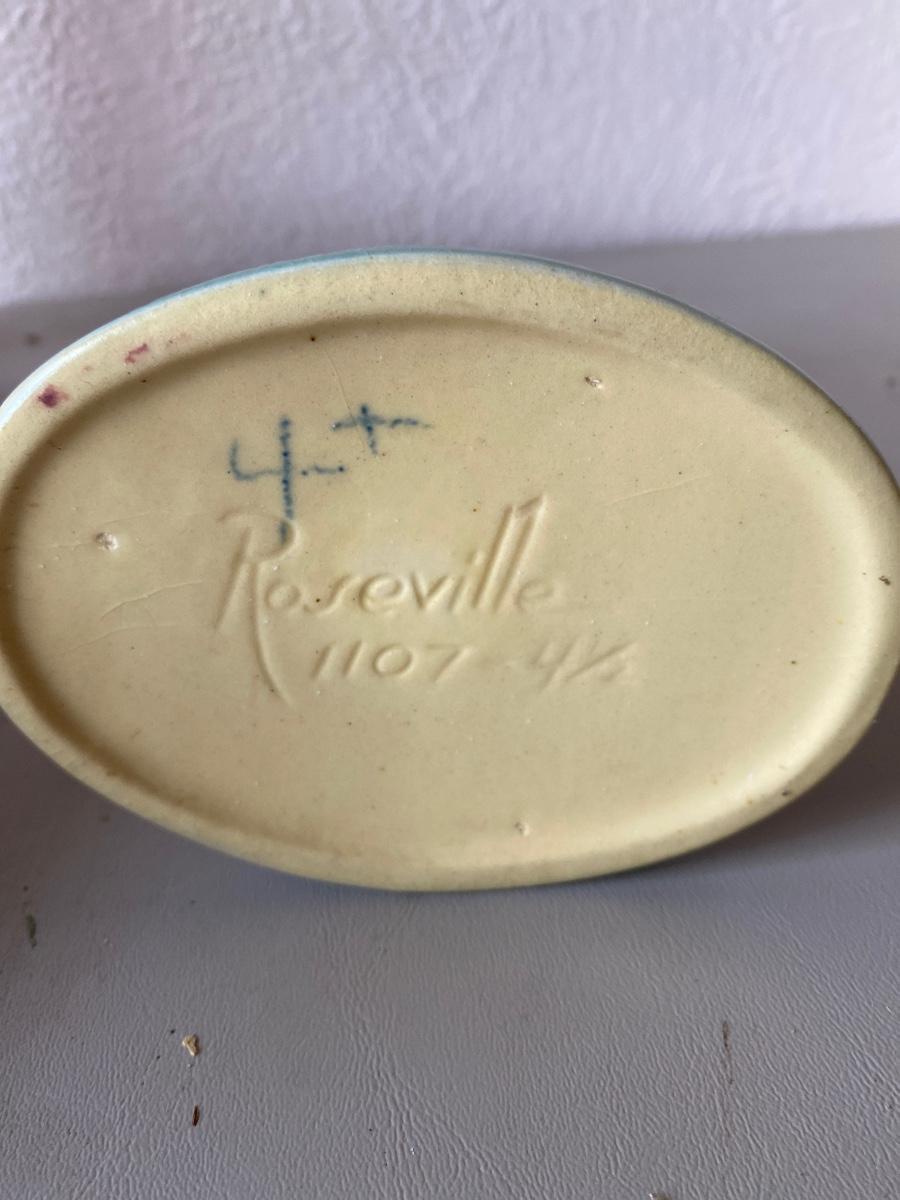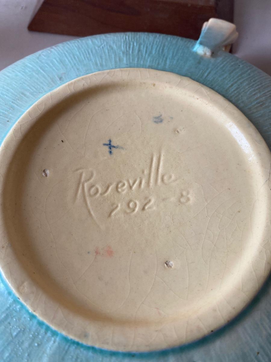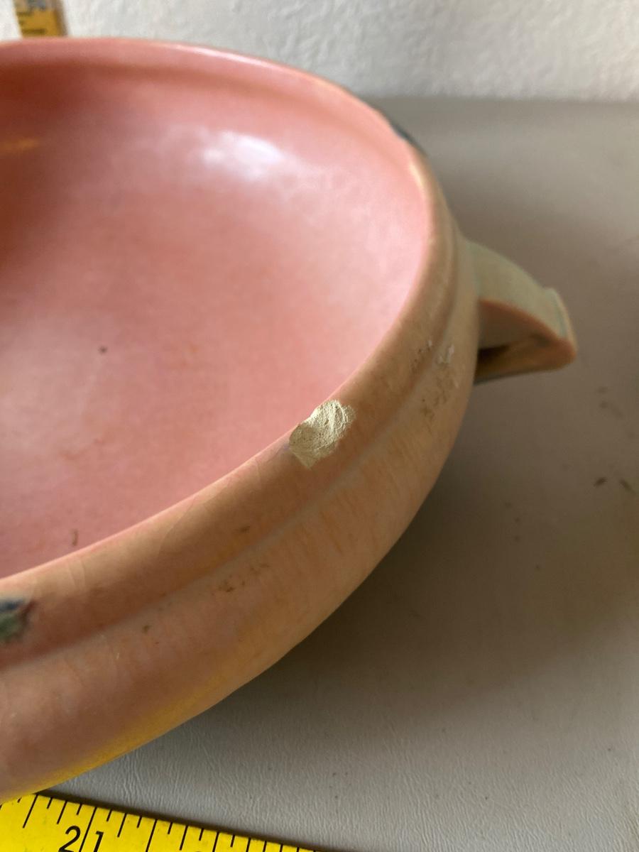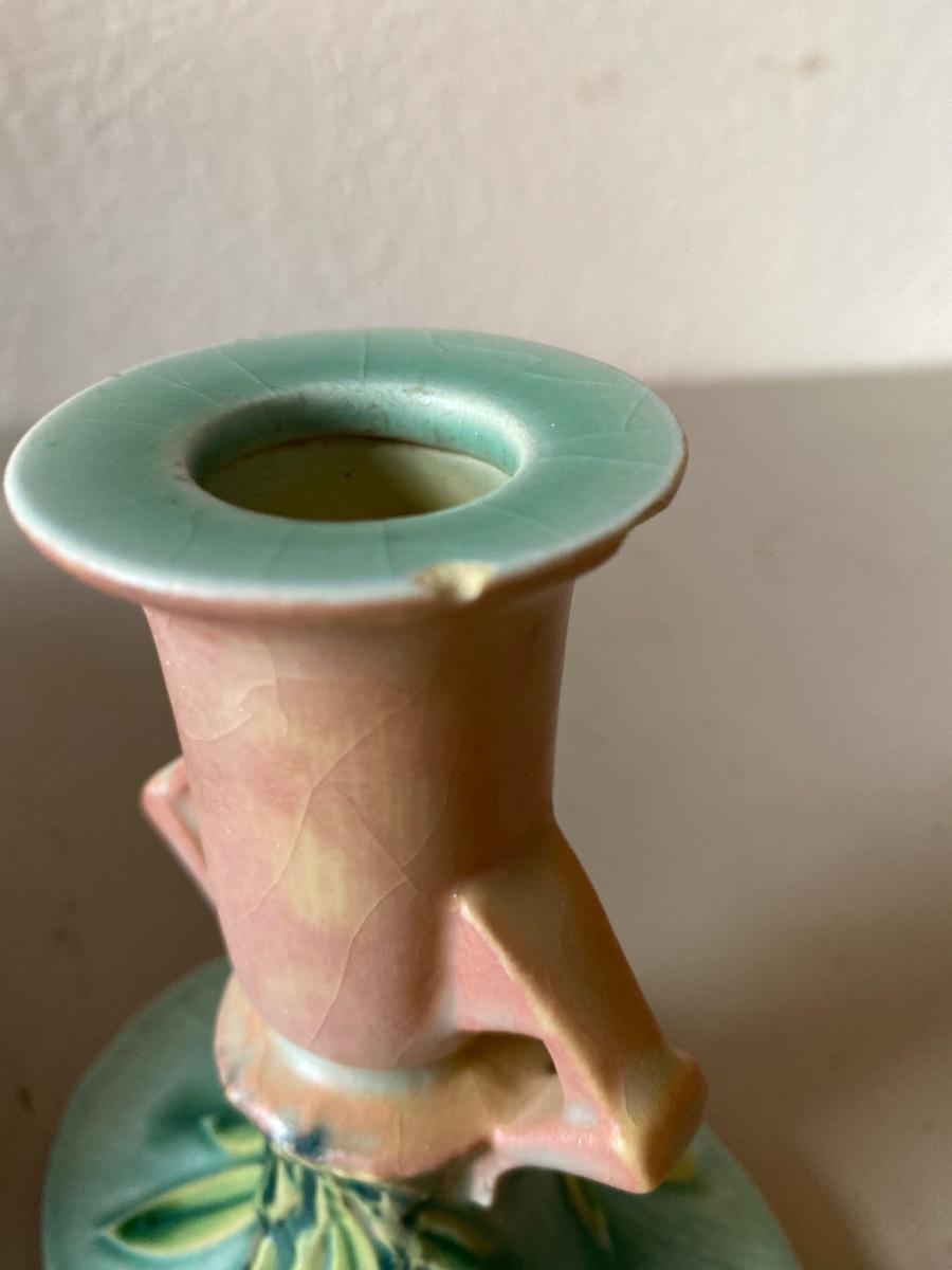 Vintage Roseville bowl and candle holders. There are some minor chipping.