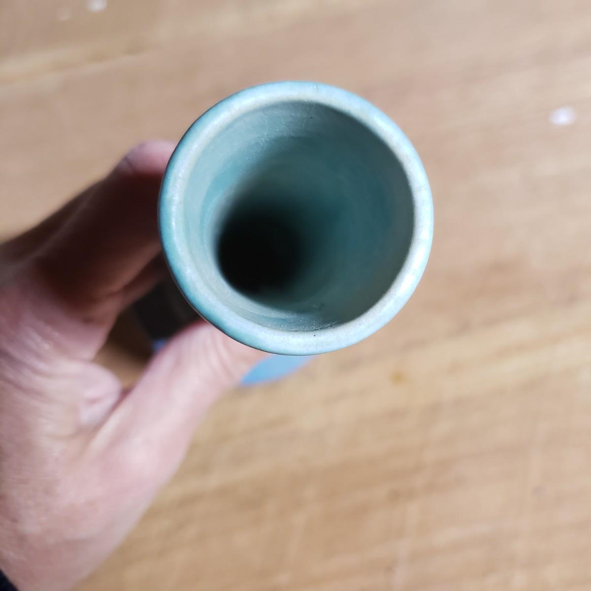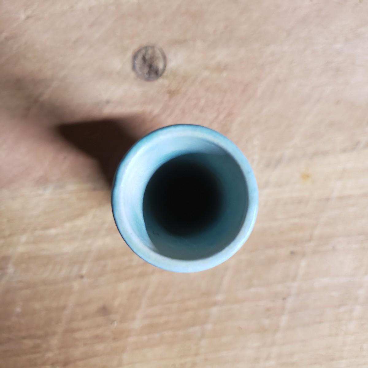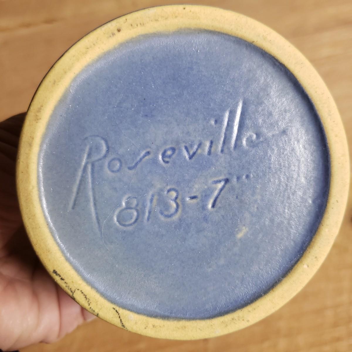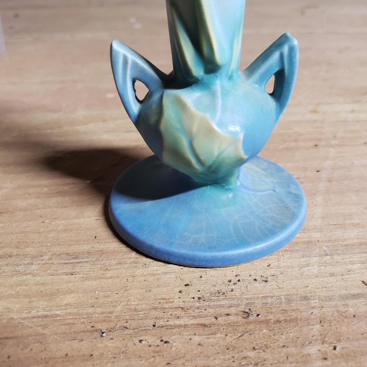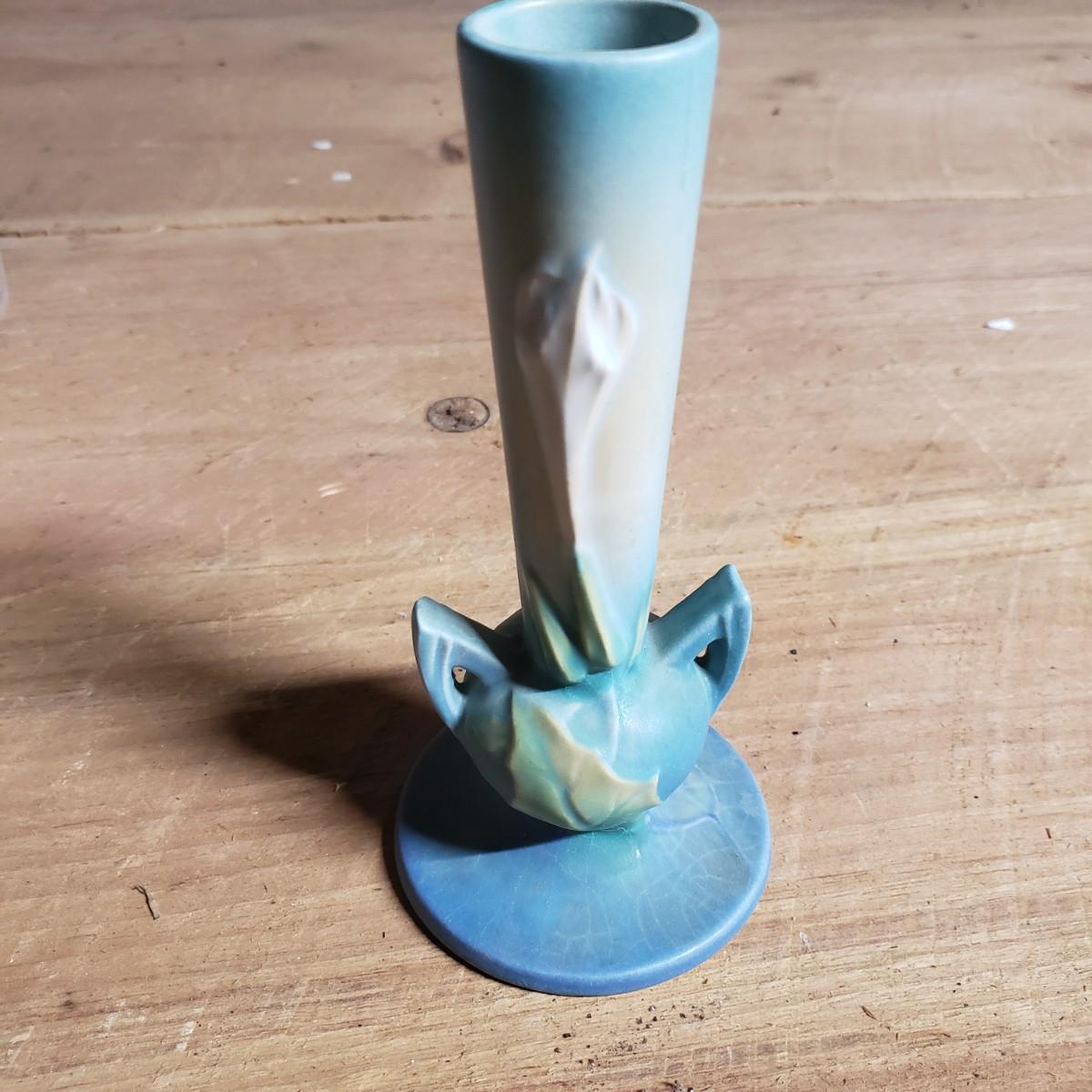 This is a Roseville Thornapple art deco bud vase. The vase measures 4.5" x 7"H. There is a chip off one side, see picture. Yet you can't see it from the front.