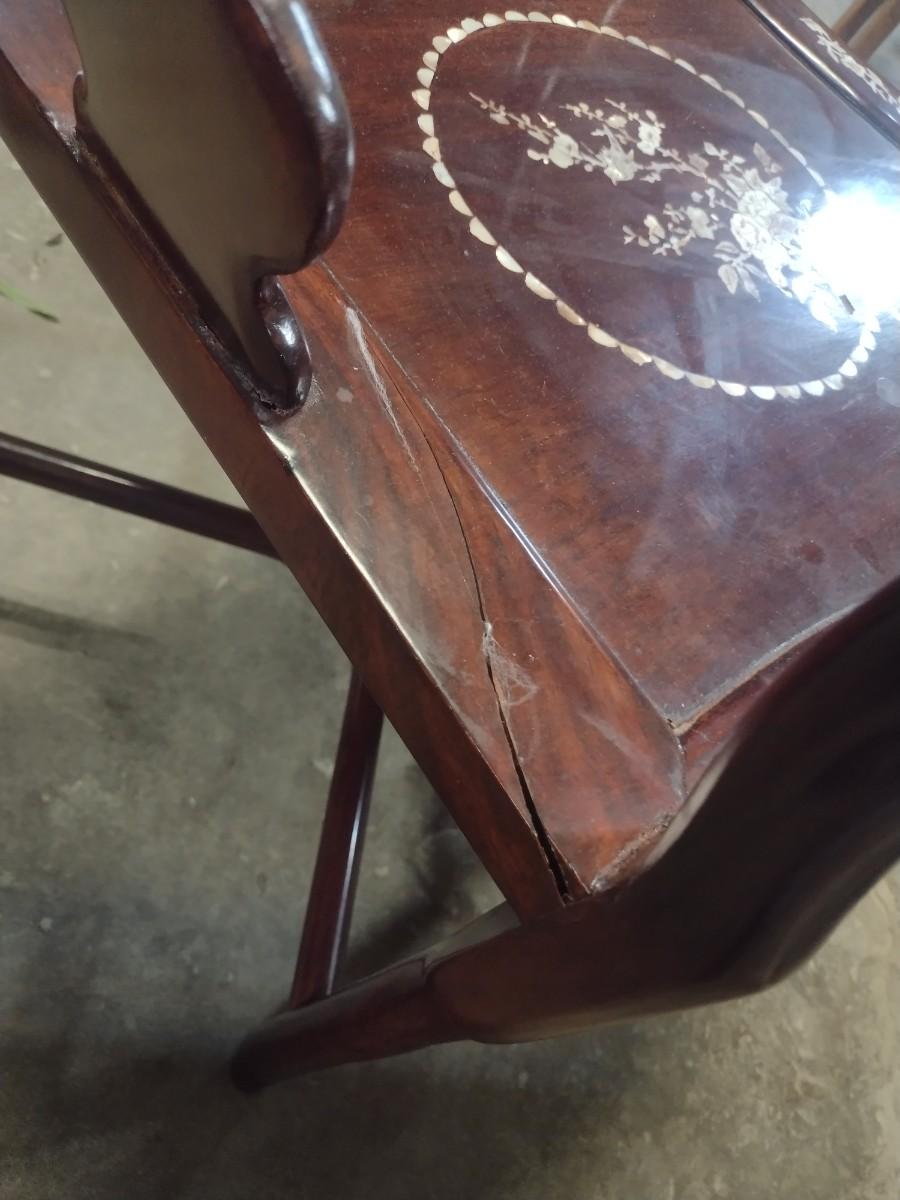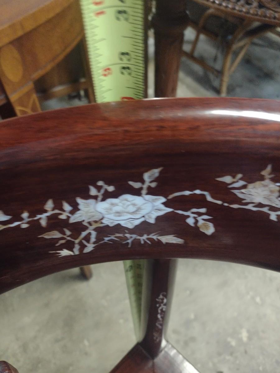 Rosewood Corner Chair with Mother of Pearl Inlay. Has a visible crack at arm post as shown.