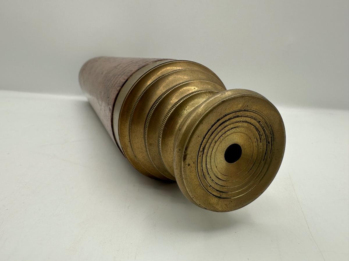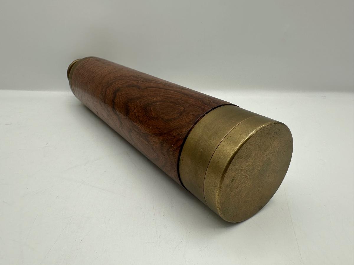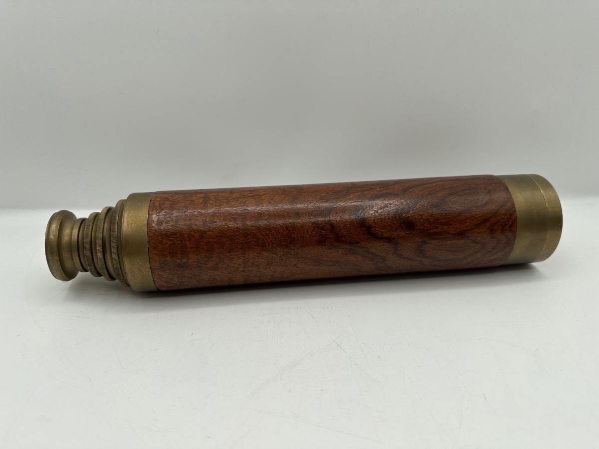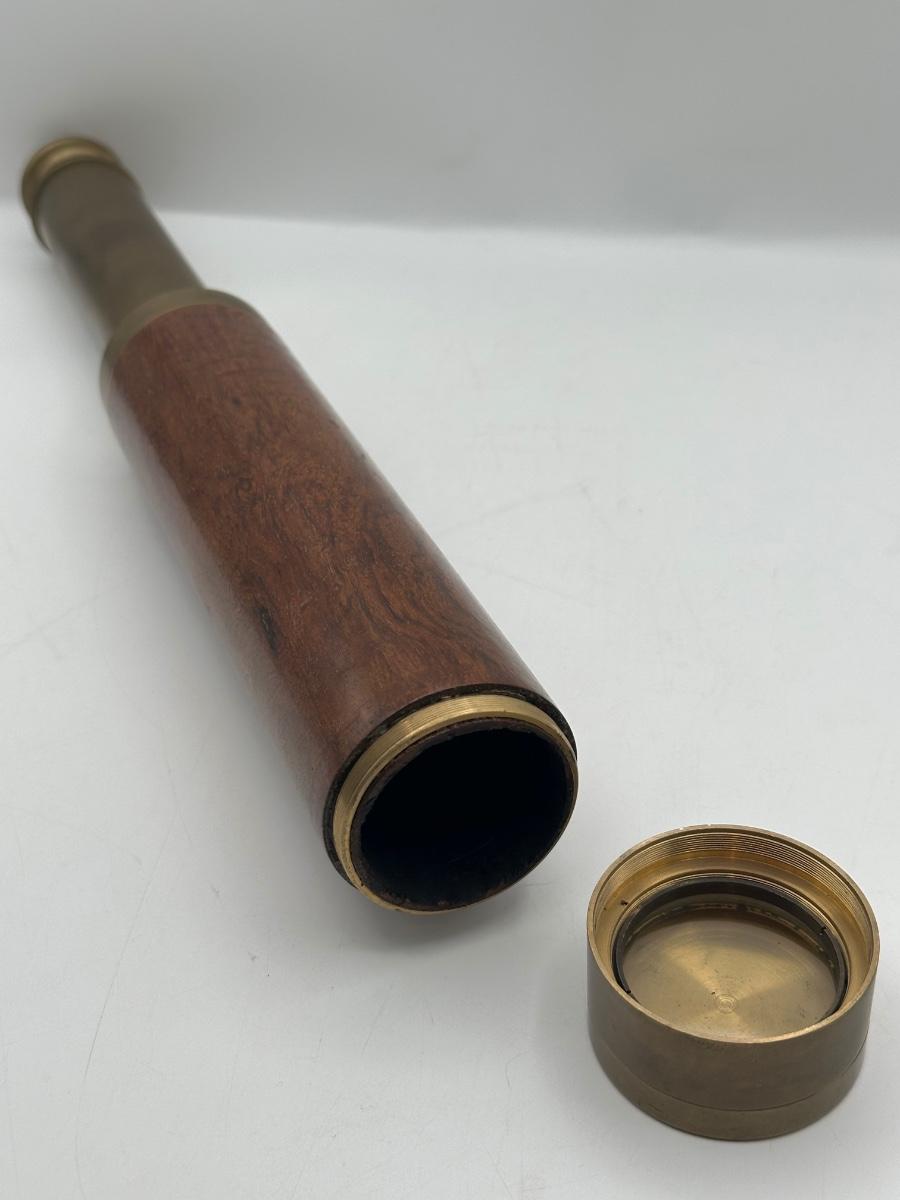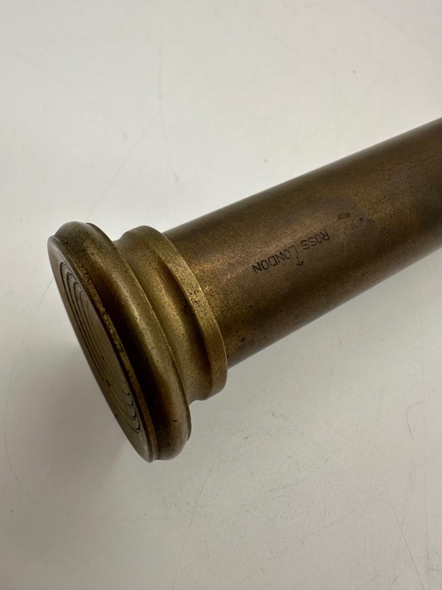 Maker-marked “Ross London,” this brass collapsible handheld telescope features a turned wooden barrel and sliding brass draw tubes. Shows warm patina to the brass and light surface wear consistent with age. Extends and collapses smoothly. Lens clarity untested.