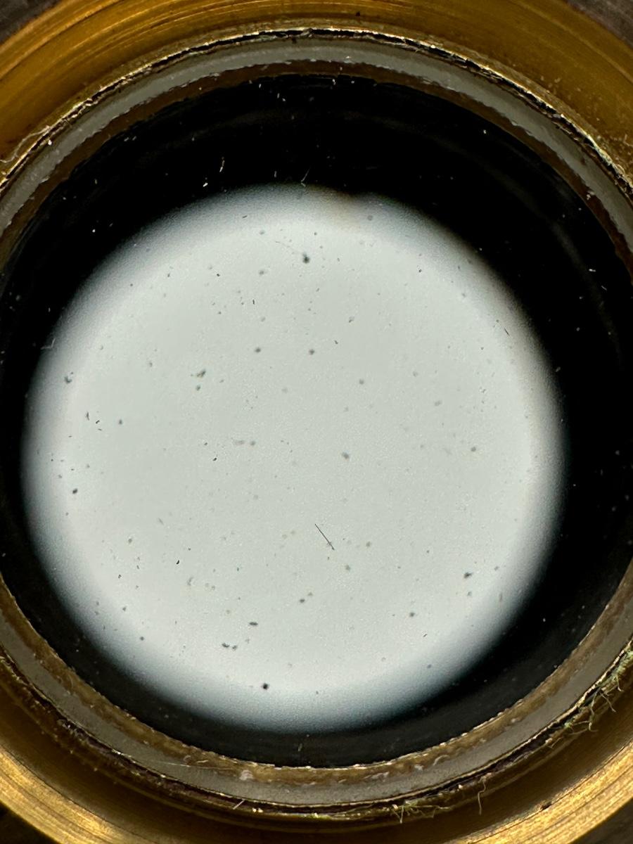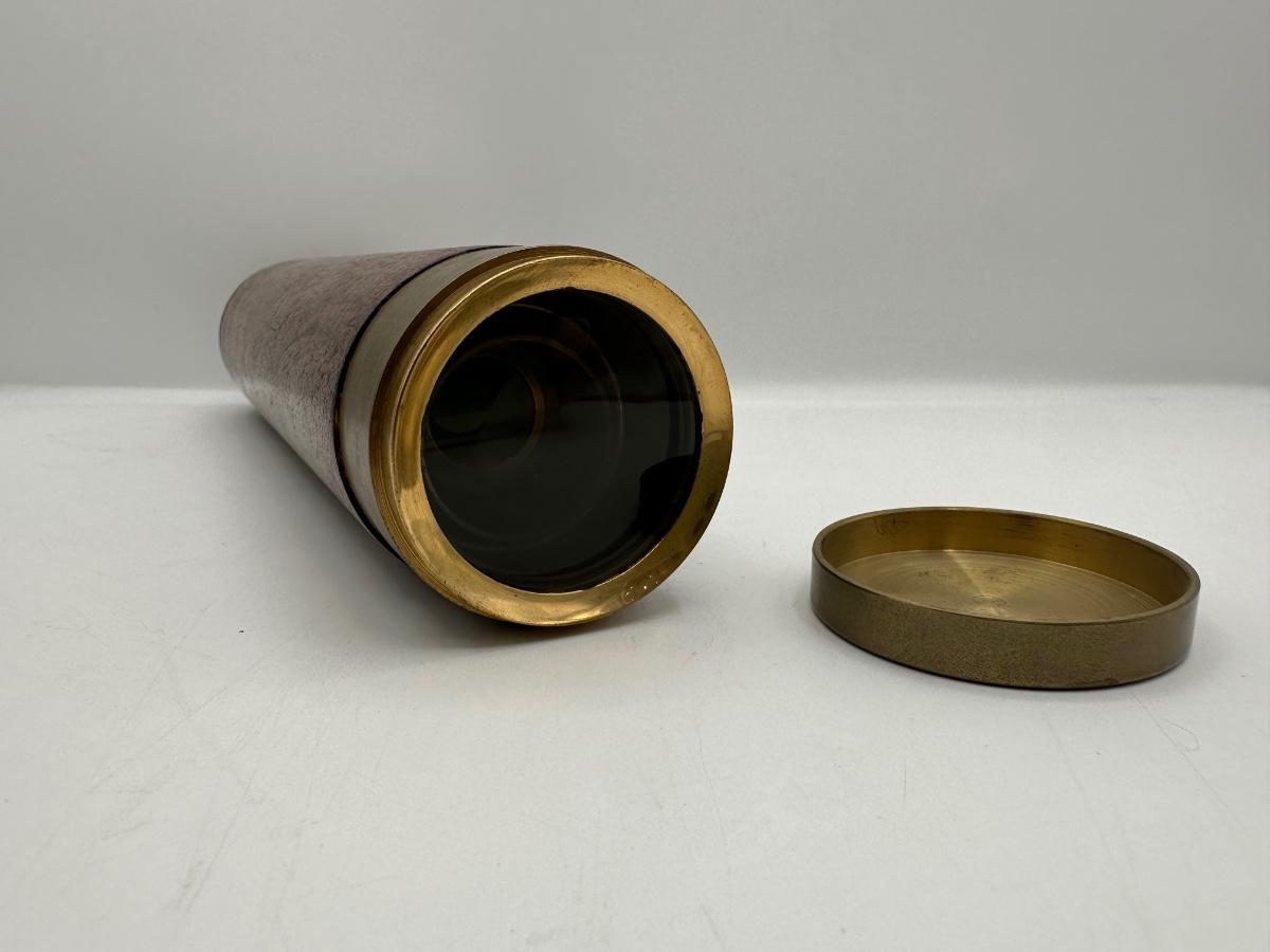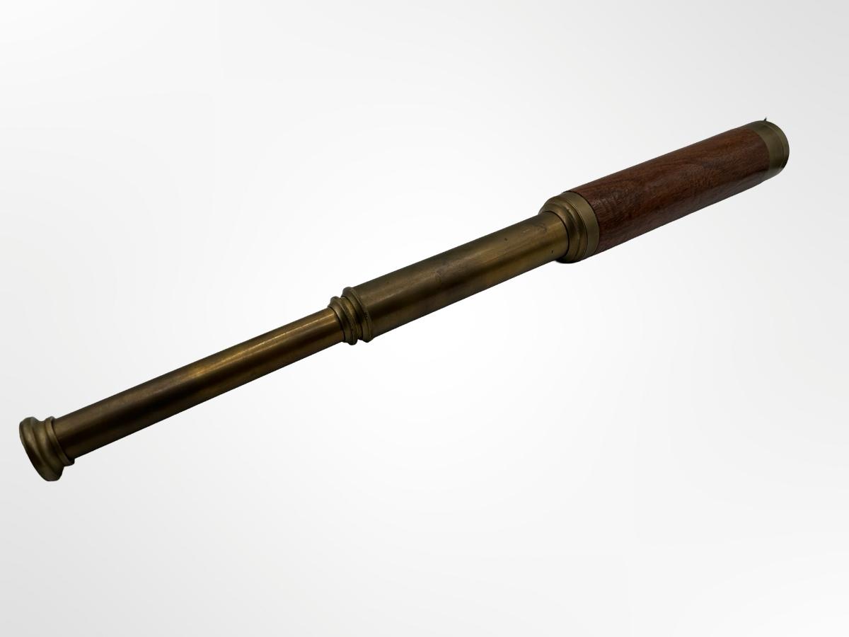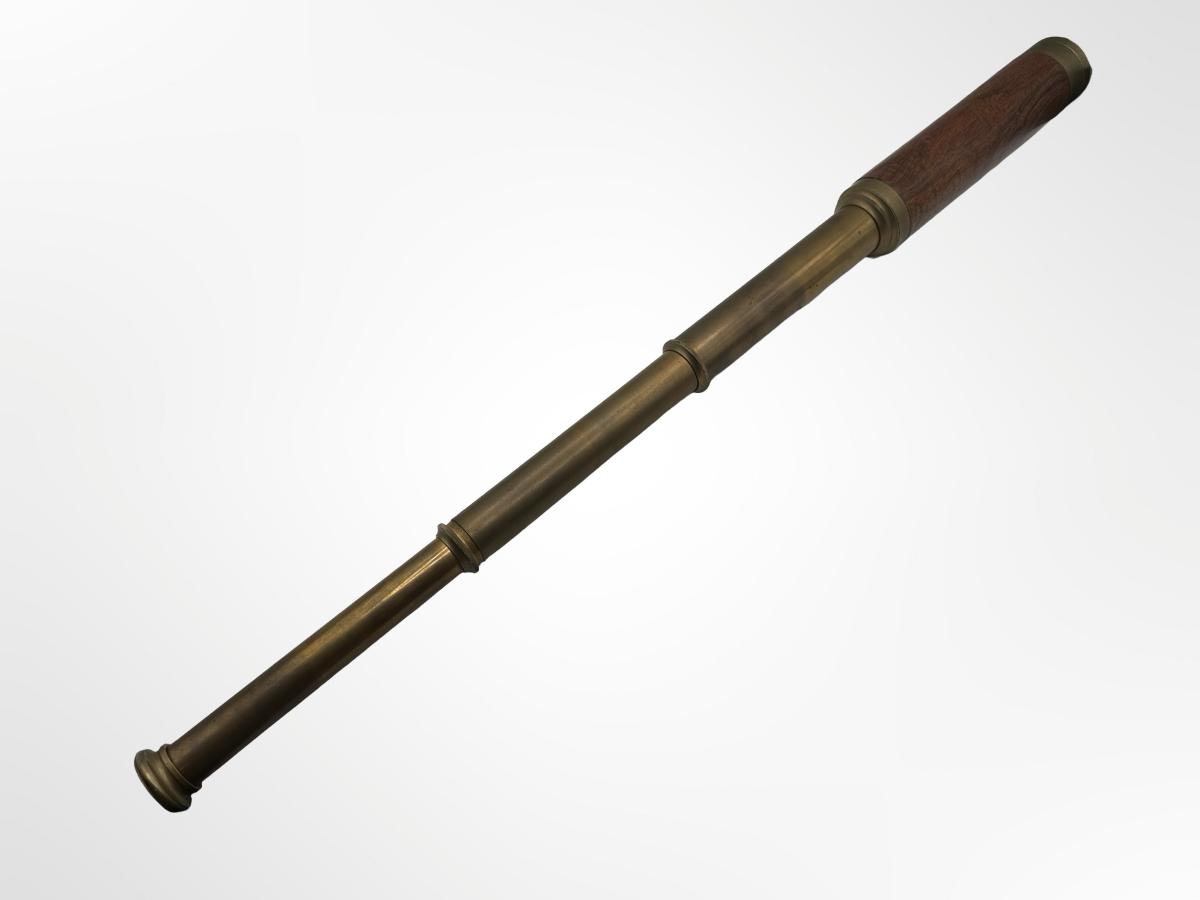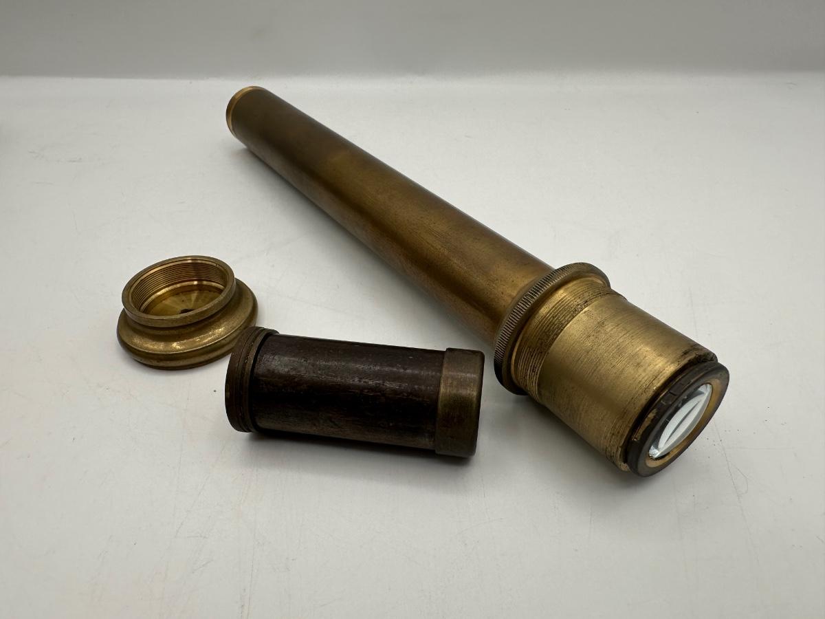 Maker-marked “Ross London,” this brass collapsible handheld telescope features a turned wooden barrel and sliding brass draw tubes. Shows warm patina to the brass and light surface wear consistent with age. Extends and collapses smoothly. Lens clarity untested.
