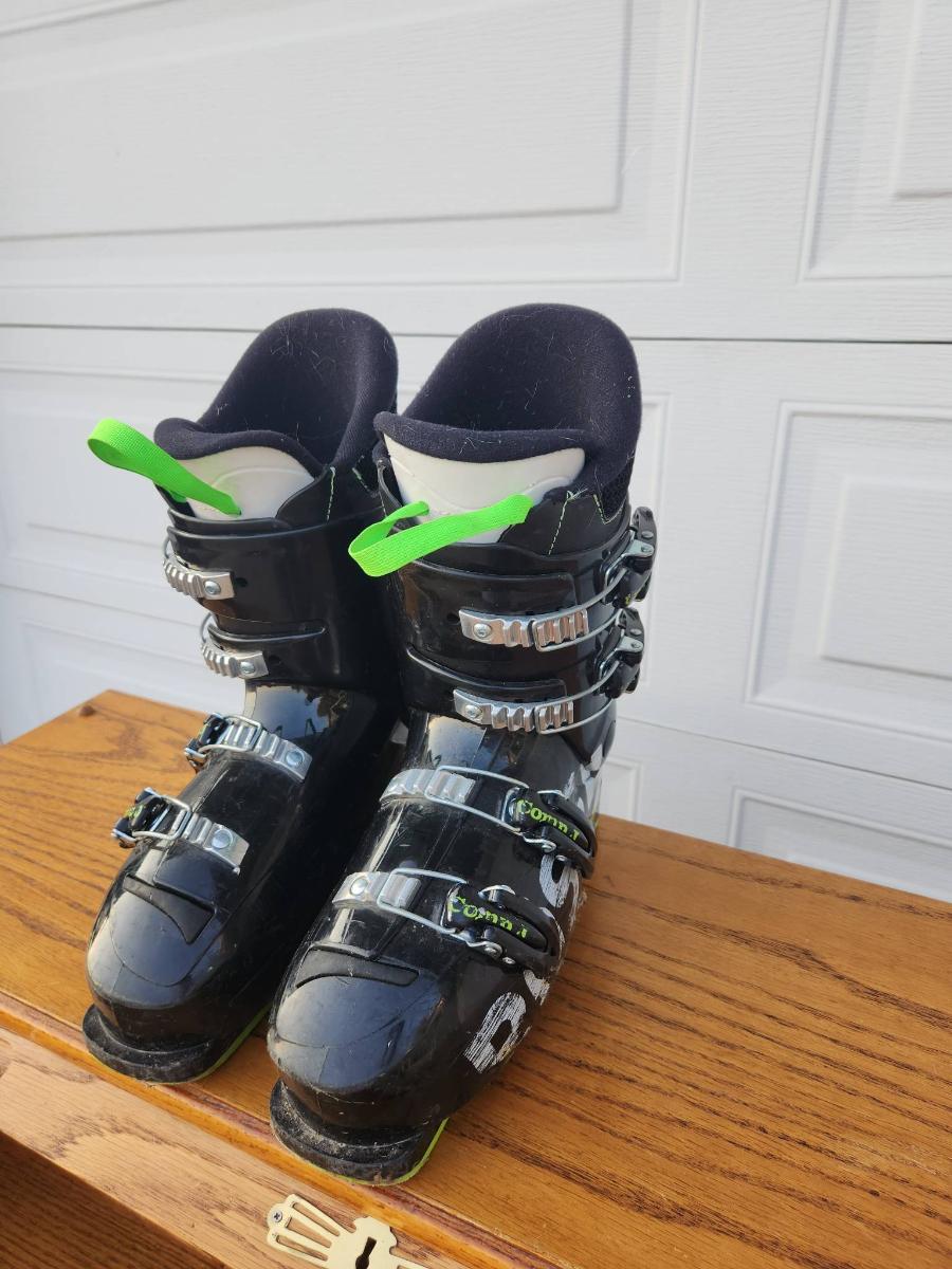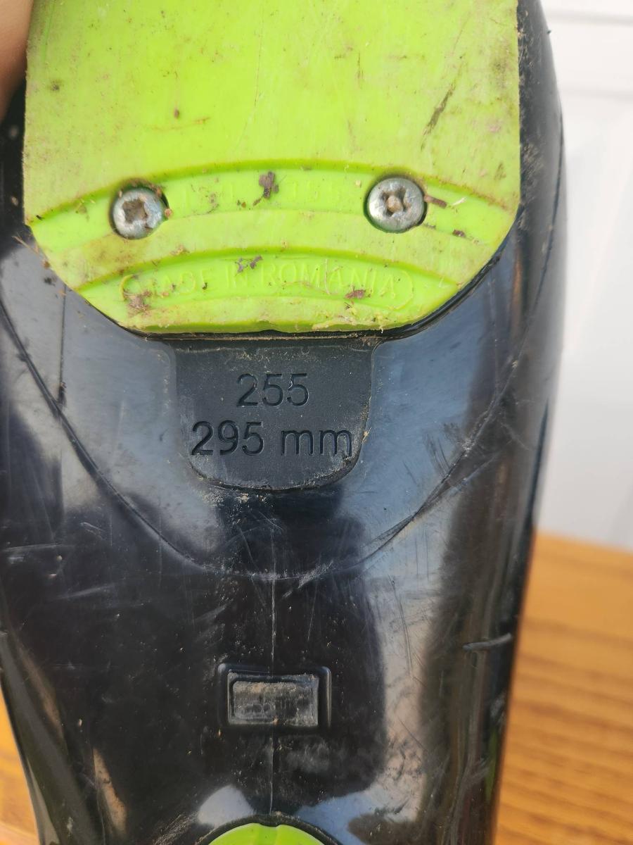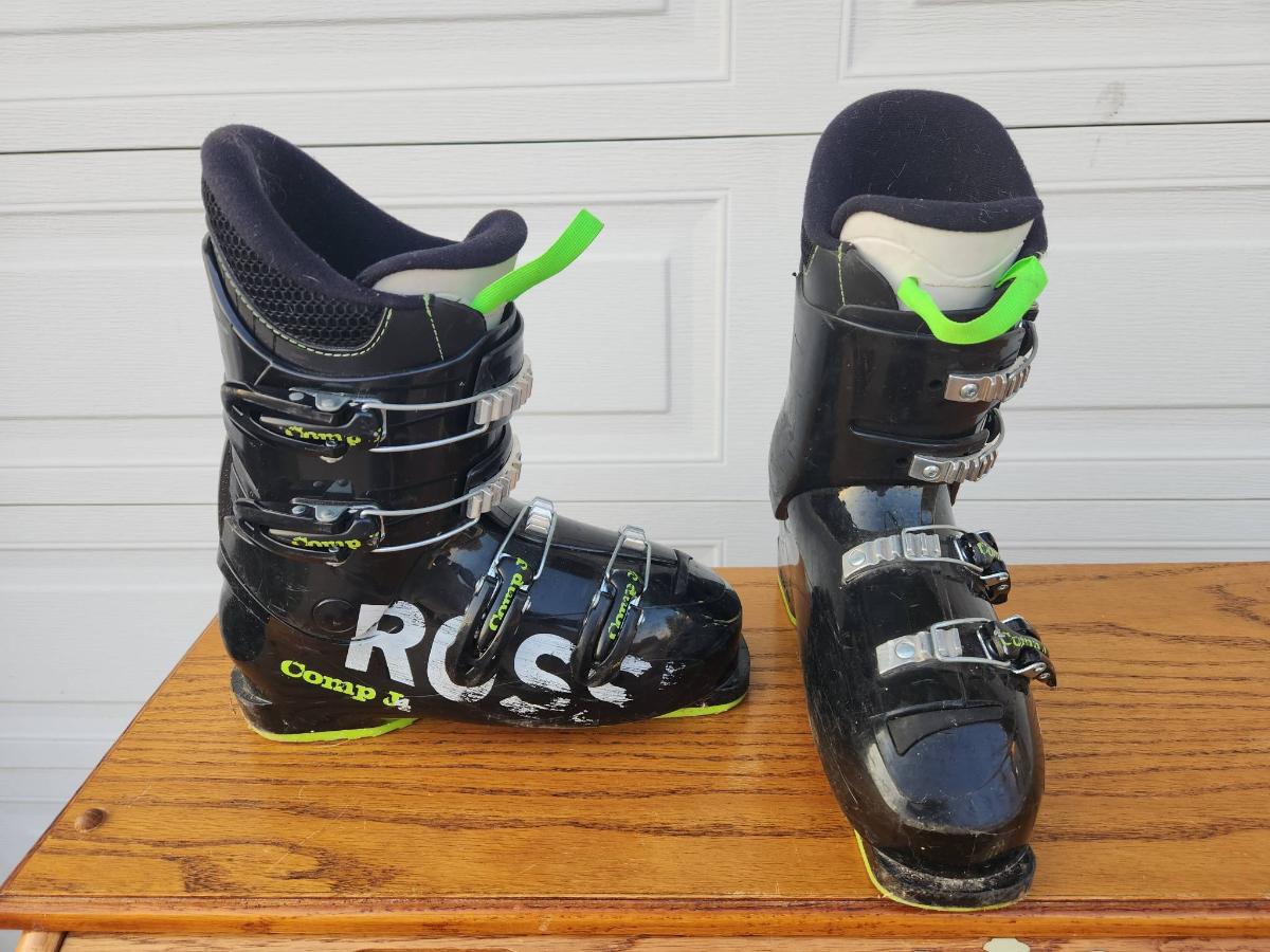 Rossignol Comp J4 Ski Boots featuring a black and green design, four adjustable buckles for secure fit, and comfort-focused padding. The sole length is marked as 295 mm. Designed for junior skiers, these boots combine performance and ease of use. Pre-owned condition with signs of normal wear.