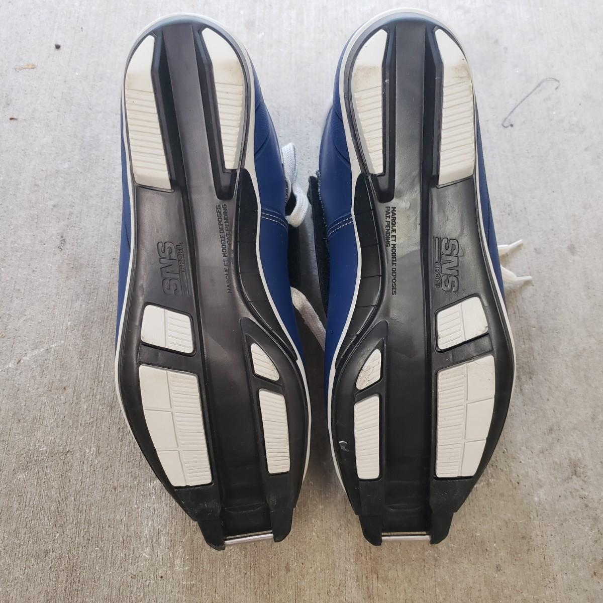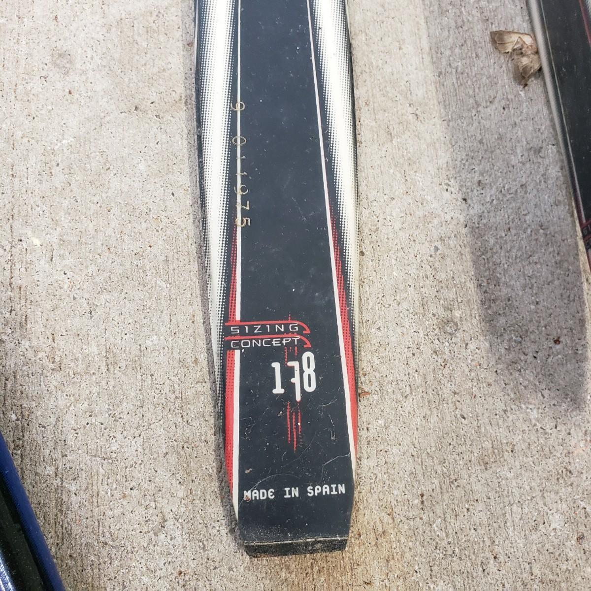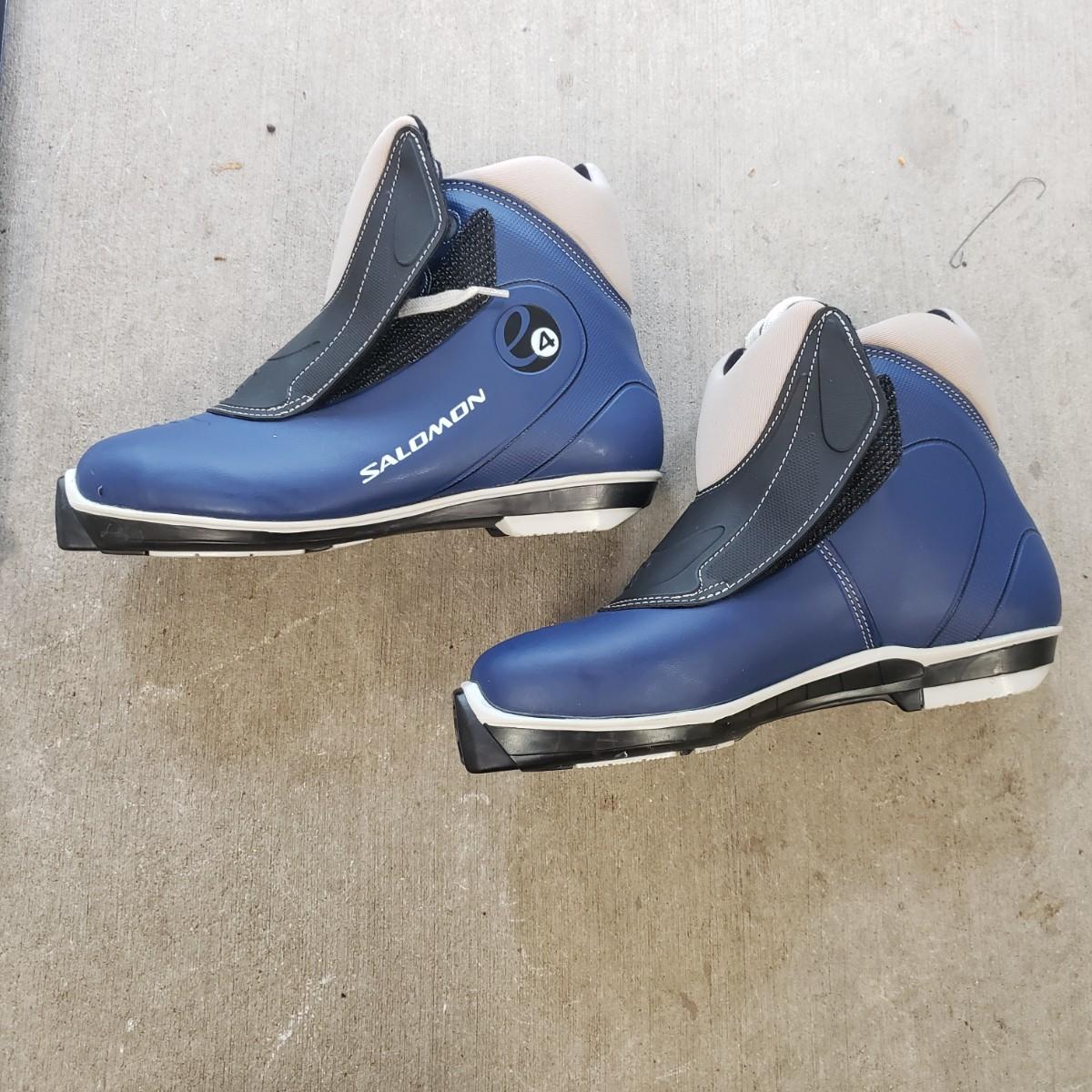 The Rossignol skis X-Tour measure 69" and are made in Spain. They have a Salomon boot system attached to snap your boots in. The Leki Cross poles are made in the Czech Republic and measure 48". Finally, are the size 40 European, which is equivalent to a size 9 US. The boots appear to have cracks on the tongue, see picture. The set appears to not have been used, but have been sitting. Since the boot tongue and foam are cracking.