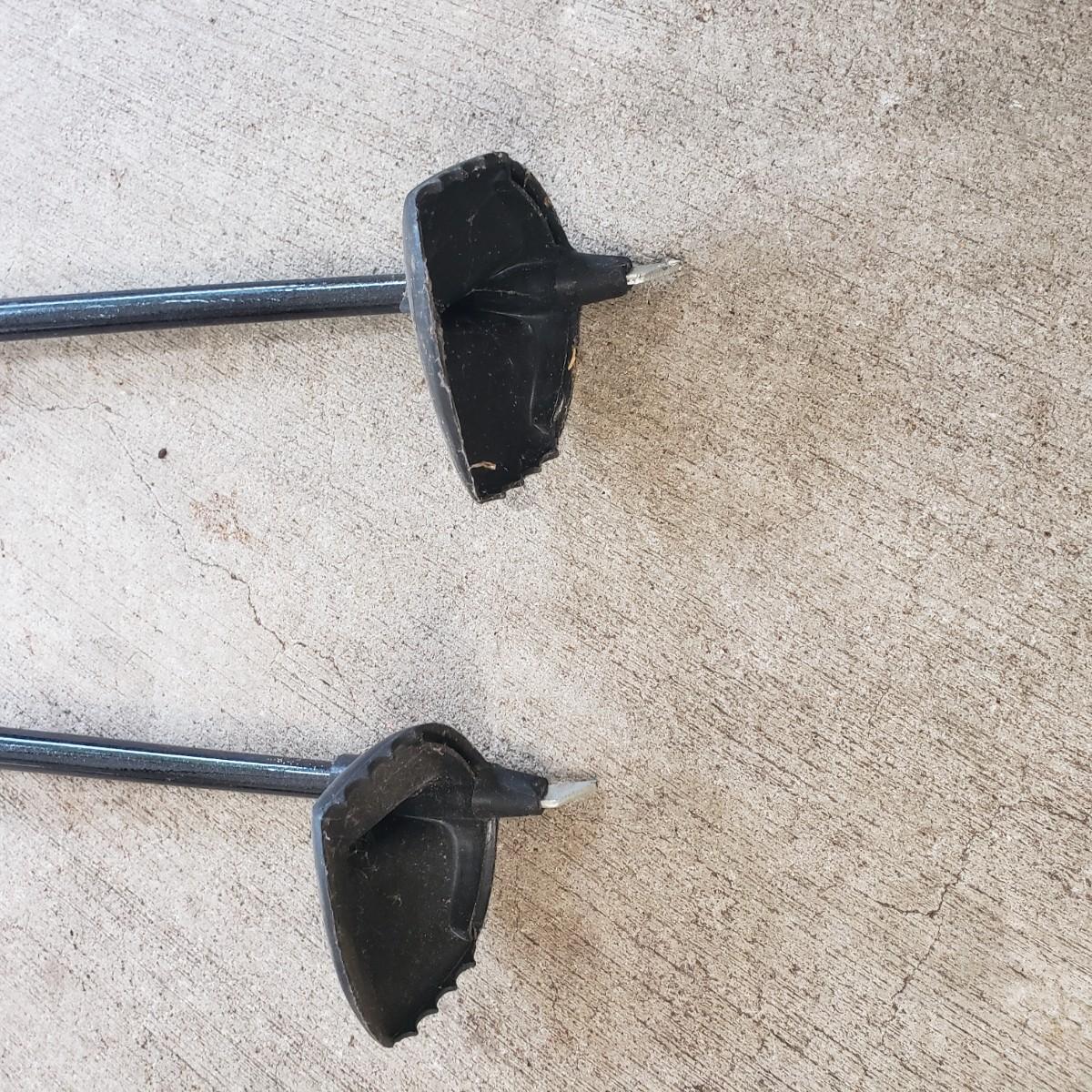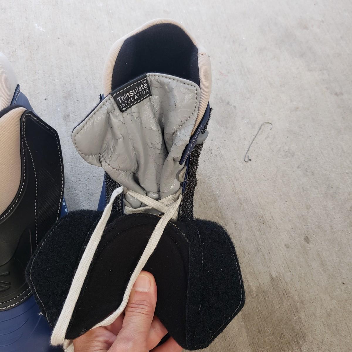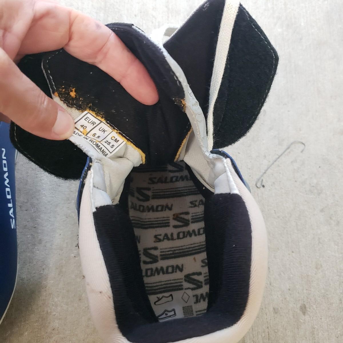 The Rossignol skis X-Tour measure 69" and are made in Spain. They have a Salomon boot system attached to snap your boots in. The Leki Cross poles are made in the Czech Republic and measure 48". Finally, are the size 40 European, which is equivalent to a size 9 US. The boots appear to have cracks on the tongue, see picture. The set appears to not have been used, but have been sitting. Since the boot tongue and foam are cracking.