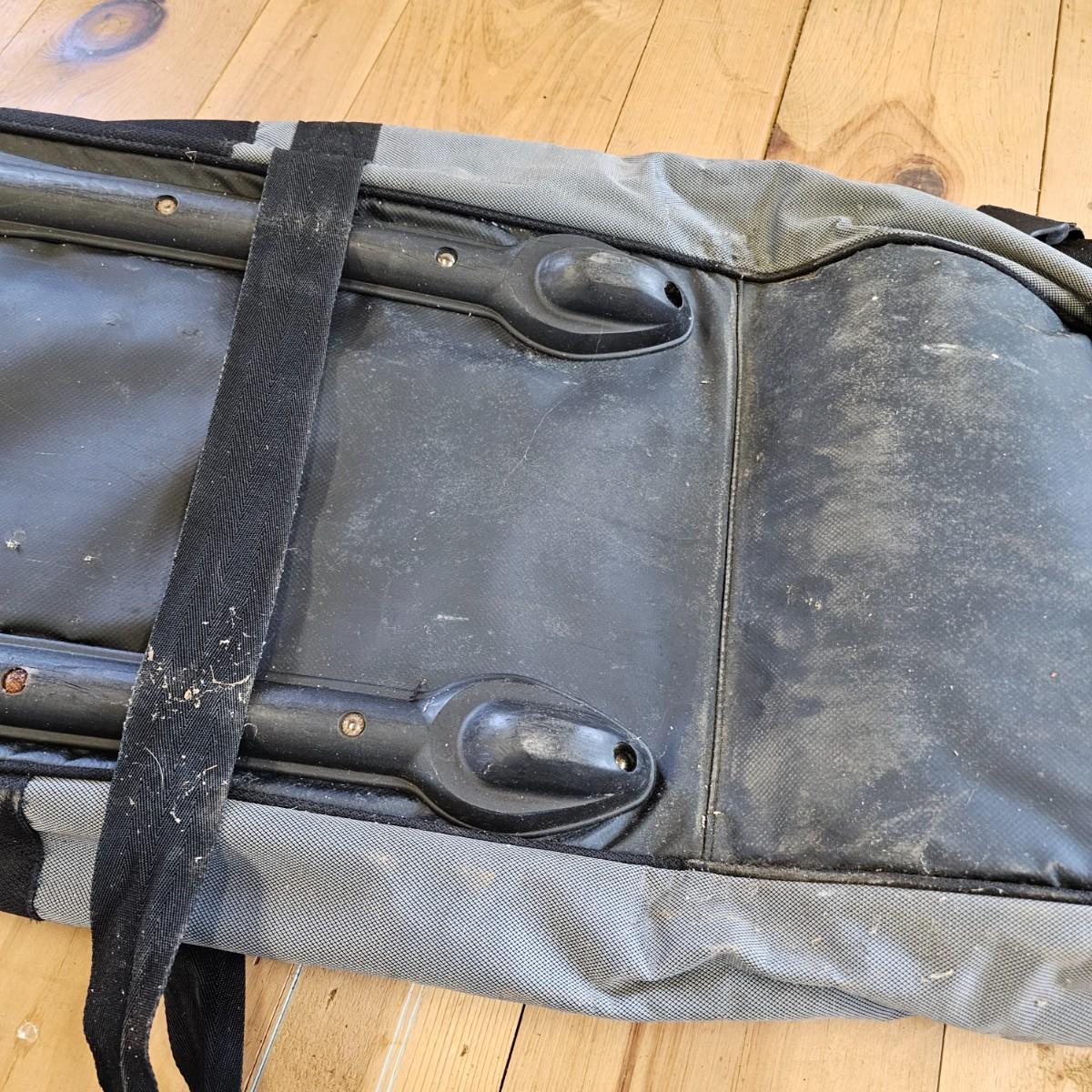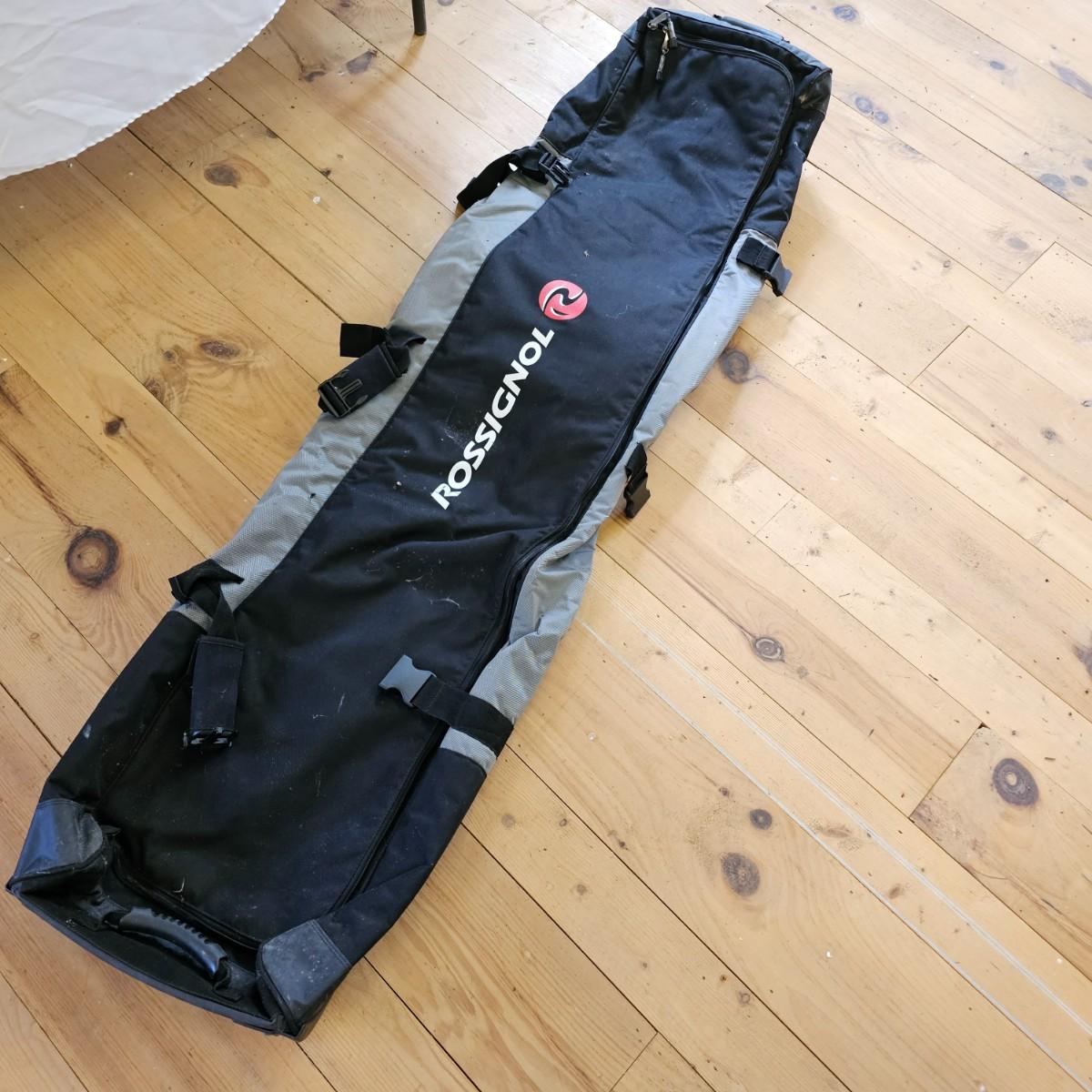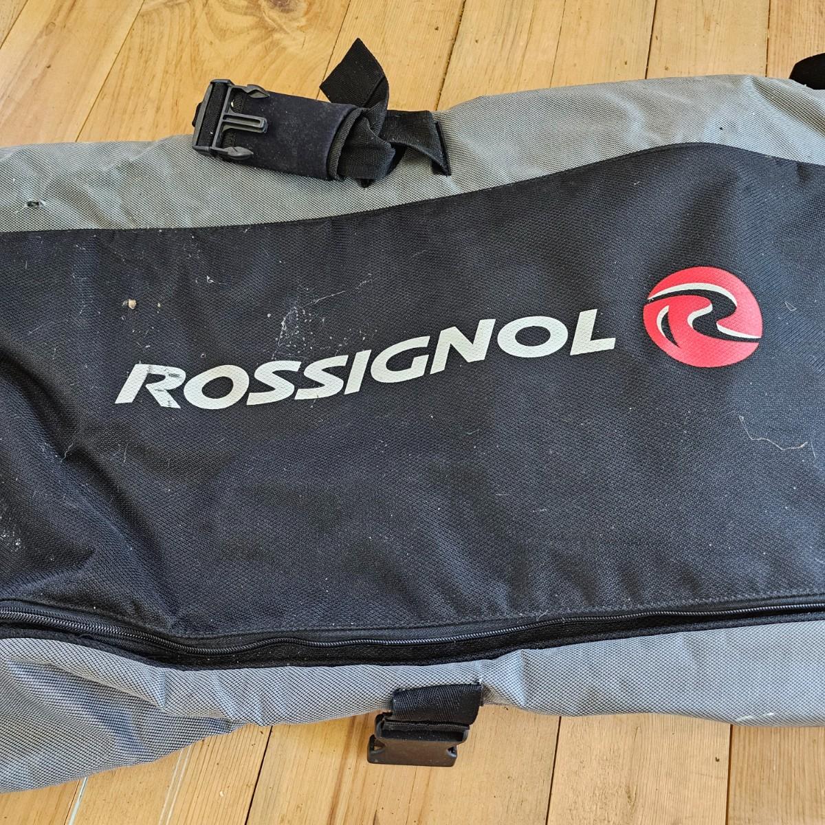 Rossignol brand travel bag for skis. Airline compatible, this bag has rolling wheels, handles and multiple strap points to protect your equipment. Inside bag is a padded sleeve to help keep bindings safe. 72" x 20" x 7"H, bag folds up for easy storage. See photos for details. Shipping available.