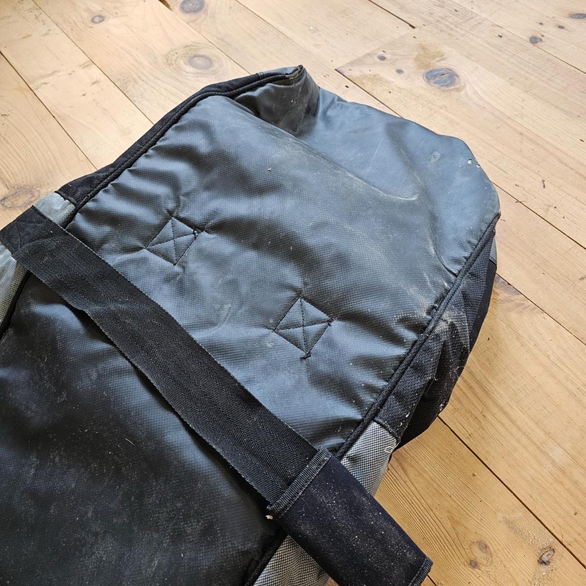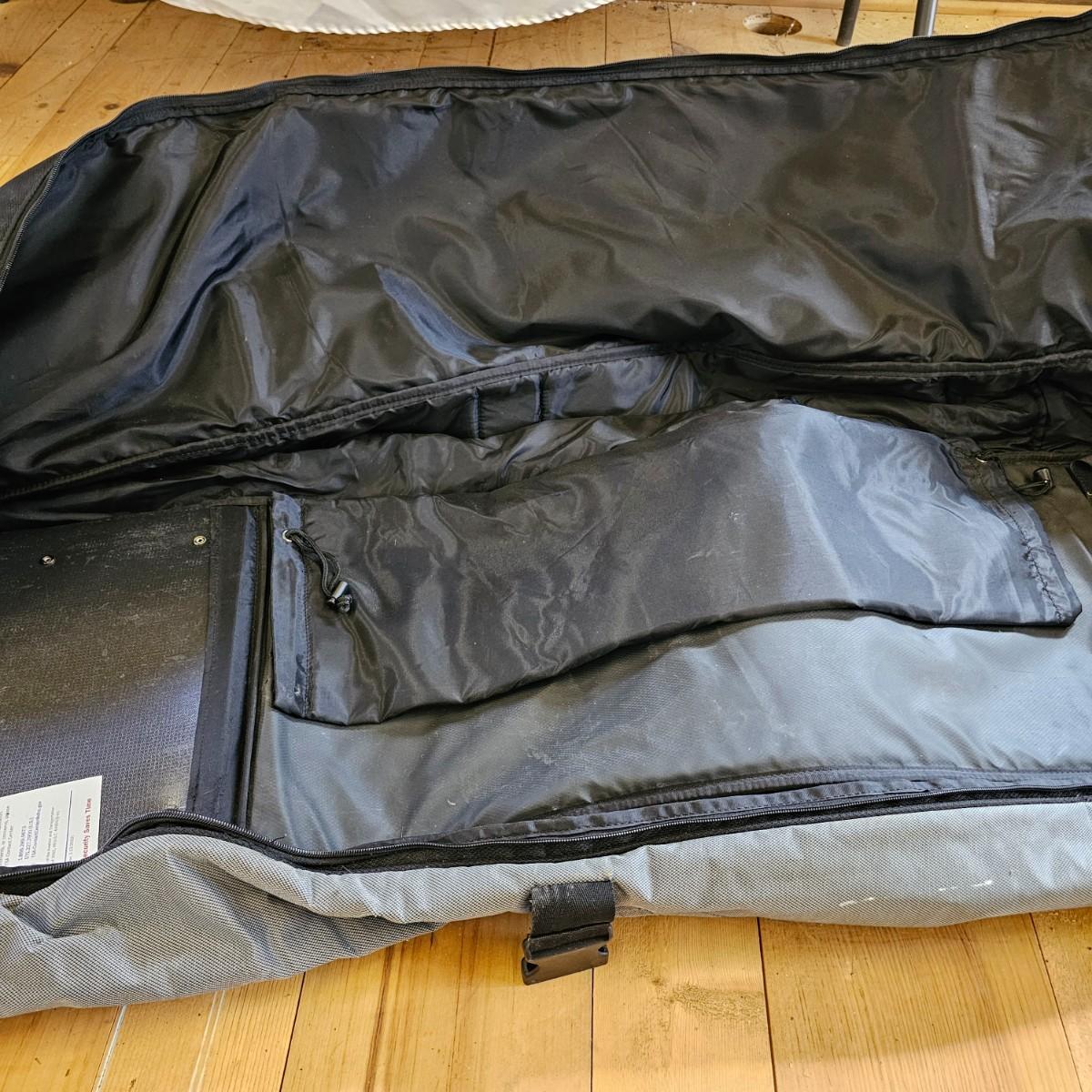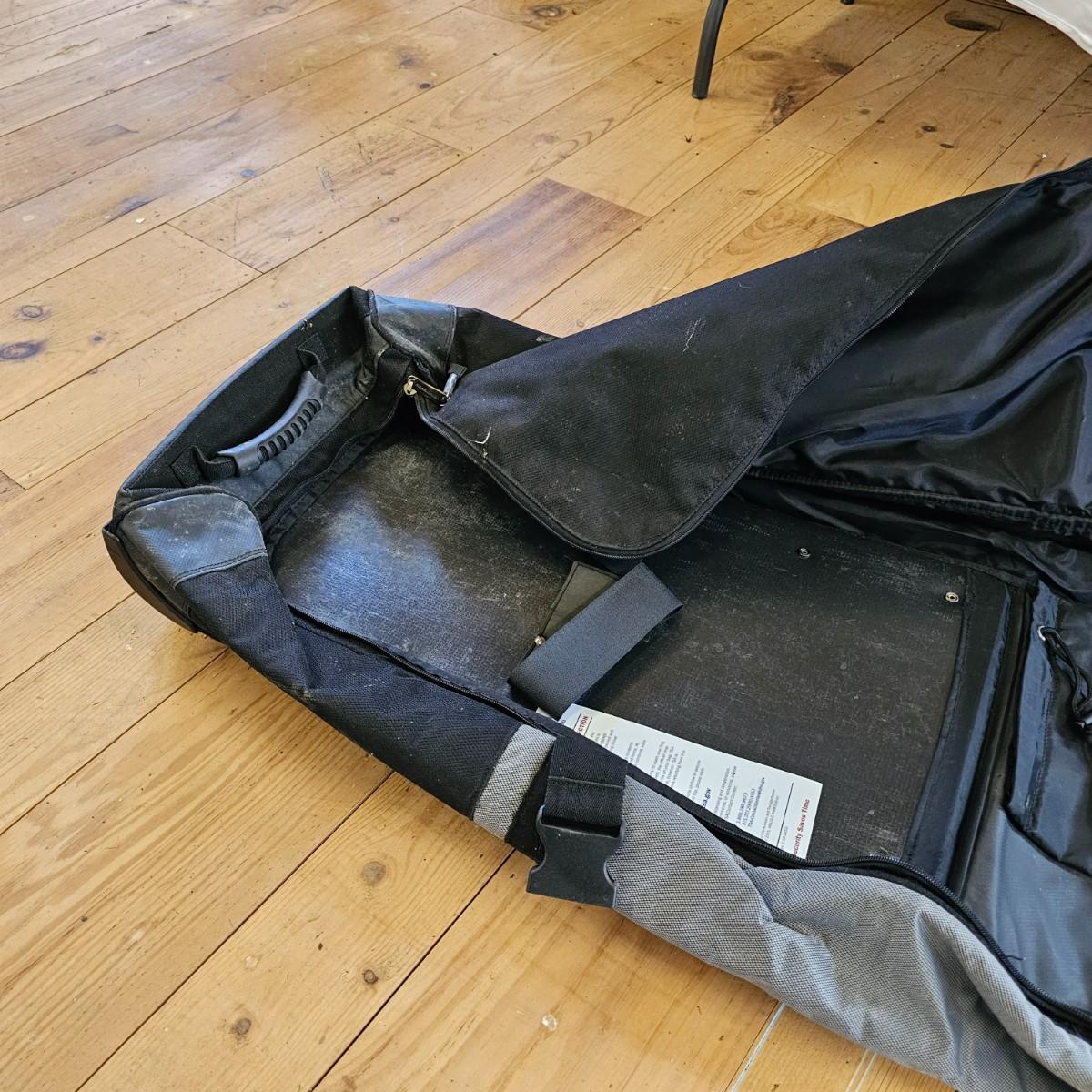 Rossignol brand travel bag for skis. Airline compatible, this bag has rolling wheels, handles and multiple strap points to protect your equipment. Inside bag is a padded sleeve to help keep bindings safe. 72" x 20" x 7"H, bag folds up for easy storage. See photos for details. Shipping available.