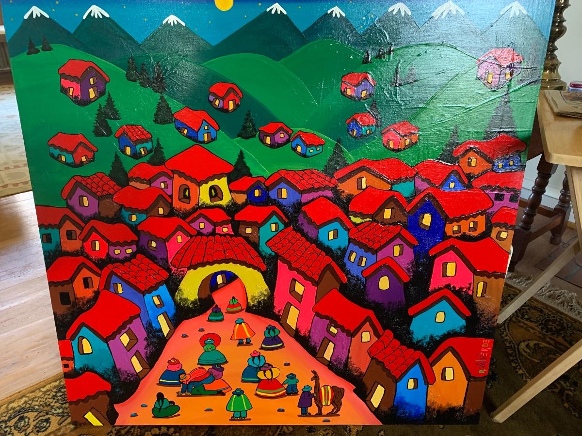 Val Verde’s distinctive folk-expressionist style blends saturated hues and bold geometric forms, reflecting both the warmth of community and the dramatic landscape of the Andes. The interplay of crimson roofs, emerald hills, and cobalt sky evokes a sense of unity and festivity that has made her work a favorite among collectors of Latin American art.