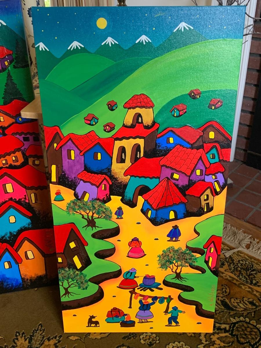 A brilliant, story-rich example of Rossmary Val Verde’s celebrated depictions of Andean village life. In Tiñendo Lana, Val Verde captures an everyday moment in a mountain village where women prepare and dye wool under a glowing yellow sky. Brightly dressed figures, terracotta rooftops, and lush green hills form a joyful narrative of color and tradition. The snow-capped Andes rise beyond, uniting daily labor and natural grandeur in a distinctly Peruvian rhythm of life.