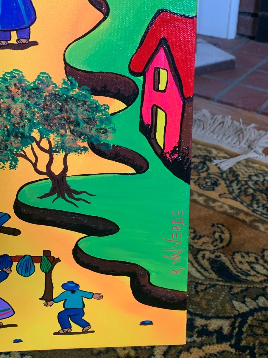 Executed in Val Verde’s signature style—bold color blocking, curving pathways, and geometric architecture—the work radiates warmth and cultural pride. The artist’s distinctive hand-layered oil and acrylic technique produces a richly textured surface that comes alive under light.