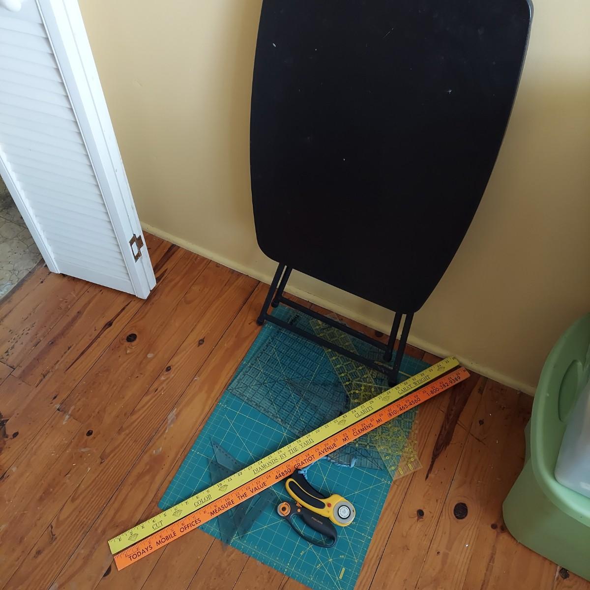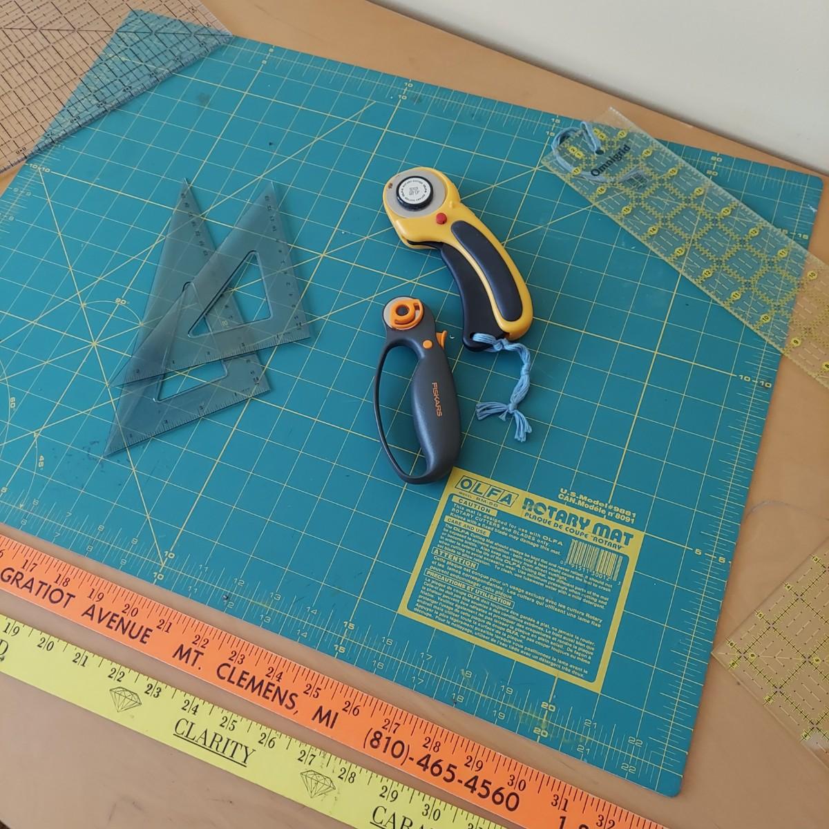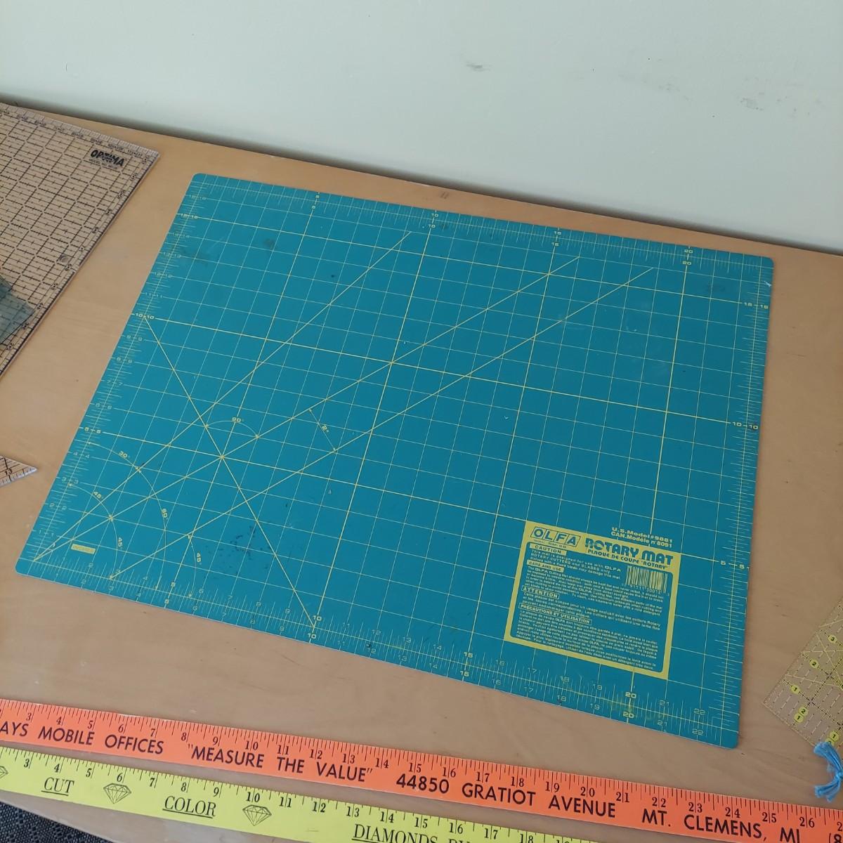 Lot includes a small black folding table that has an adjustable height. It measures approximately 26” x 18” x 25-28"H. Two rotary blades, one is Fiskars and the other Olfa, and a 17” x 22” Olfa rotary mat. Plus several acrylic straight edge rulers in various shapes and sizes. Please see photos for details. Local Pickup Only