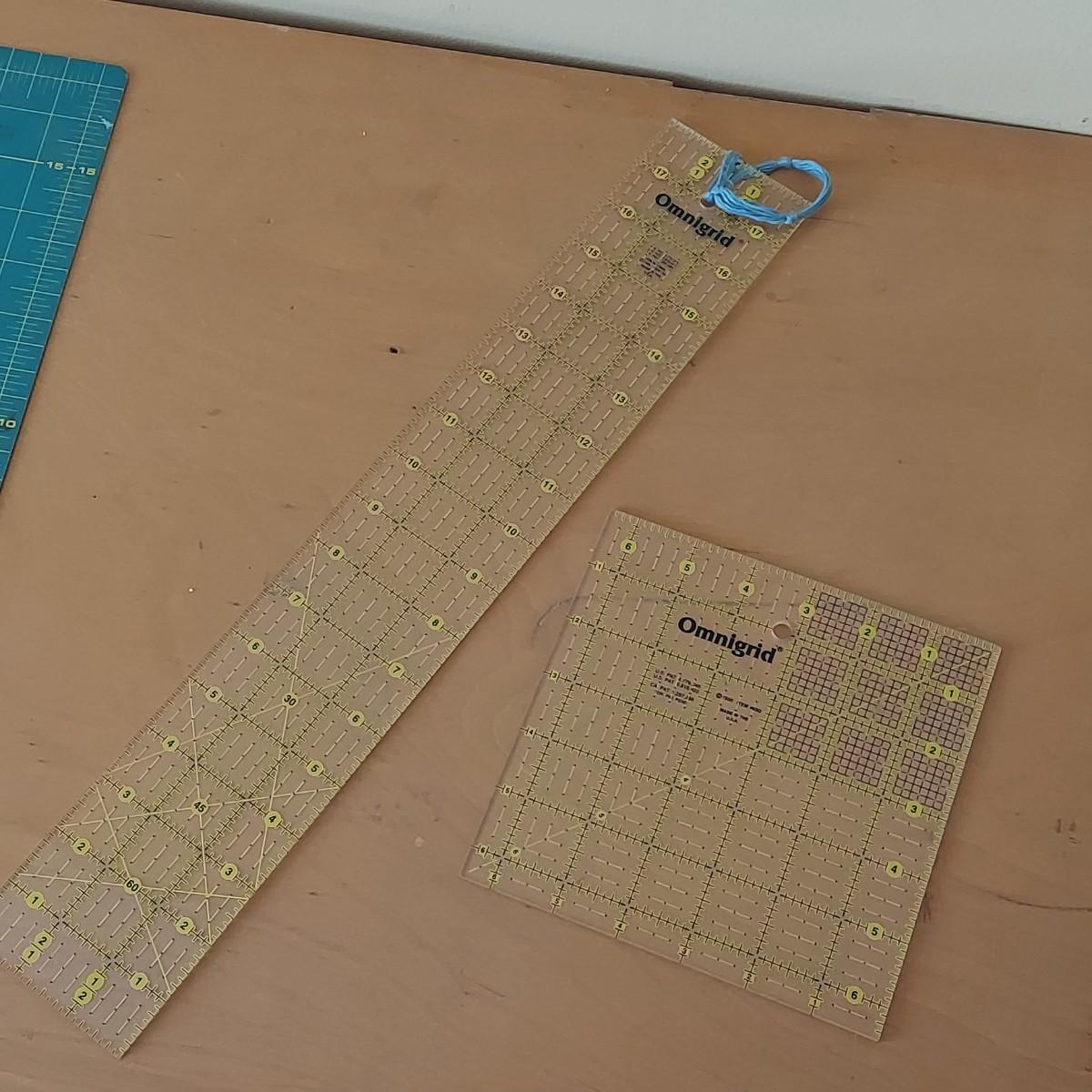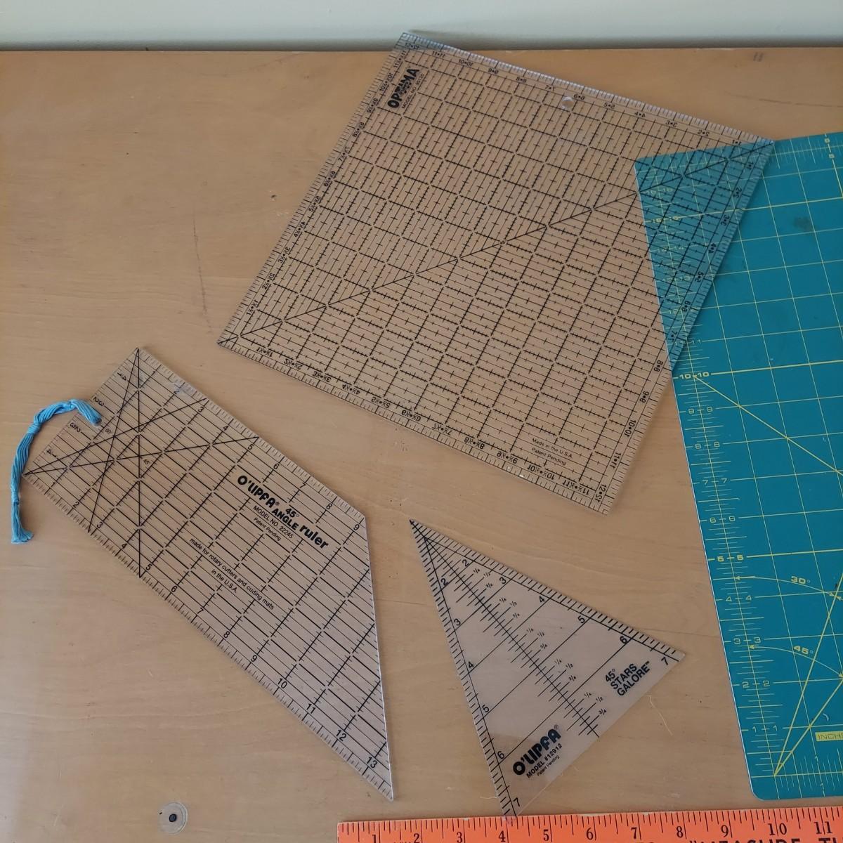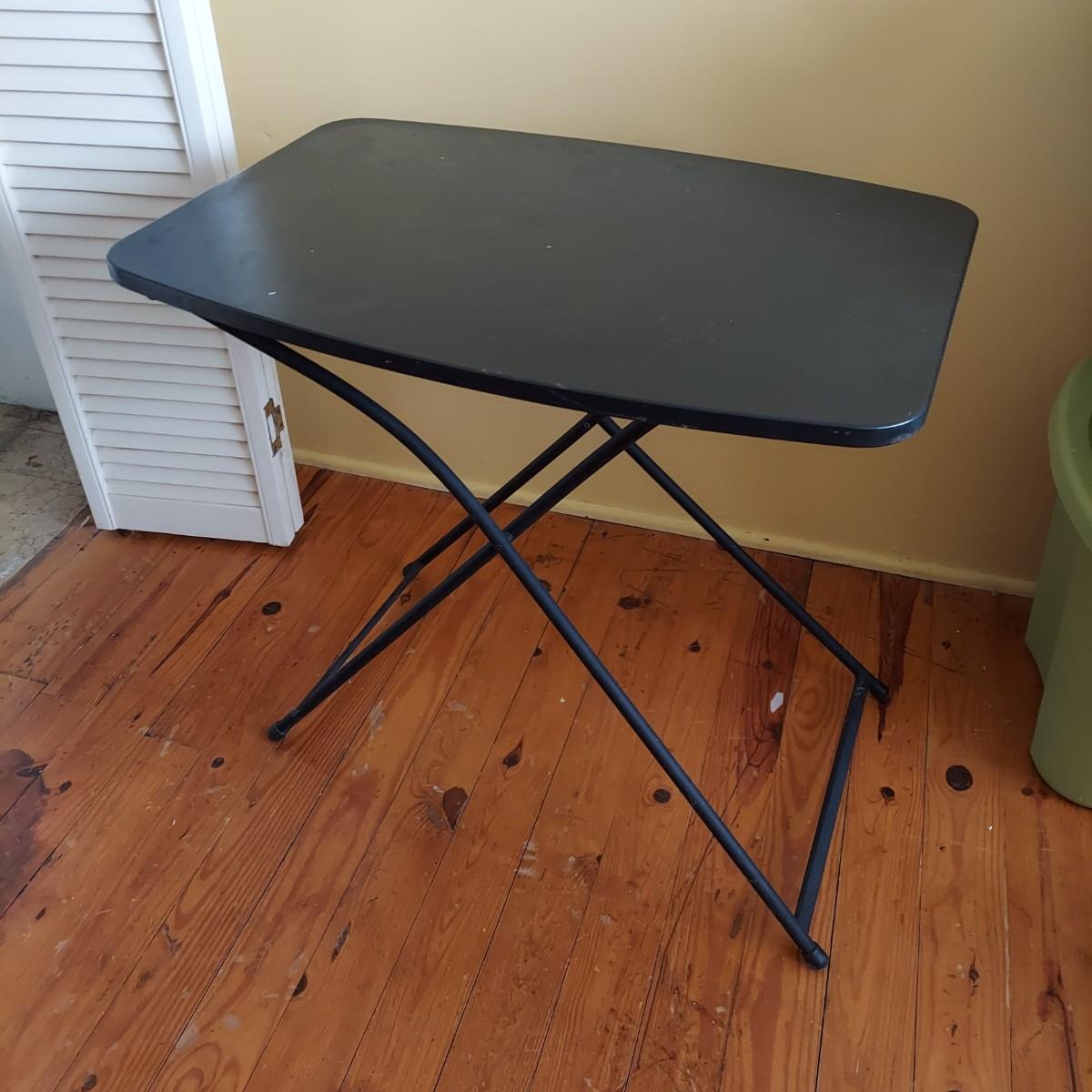 Lot includes a small black folding table that has an adjustable height. It measures approximately 26” x 18” x 25-28"H. Two rotary blades, one is Fiskars and the other Olfa, and a 17” x 22” Olfa rotary mat. Plus several acrylic straight edge rulers in various shapes and sizes. Please see photos for details. Local Pickup Only