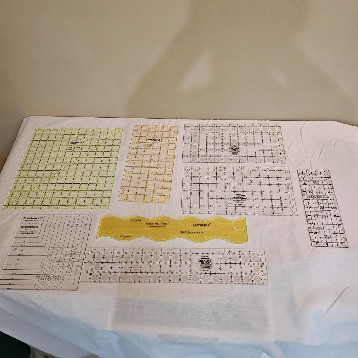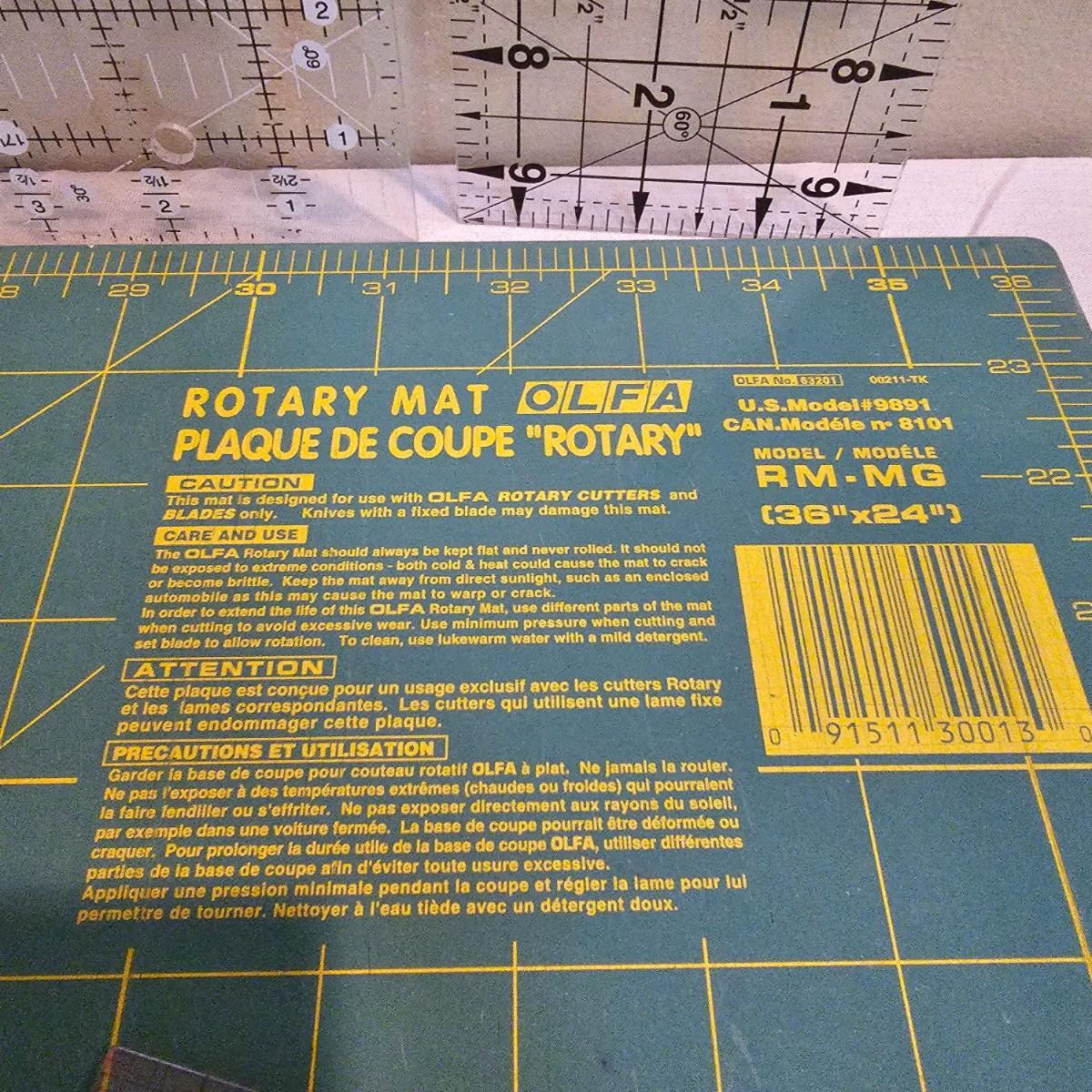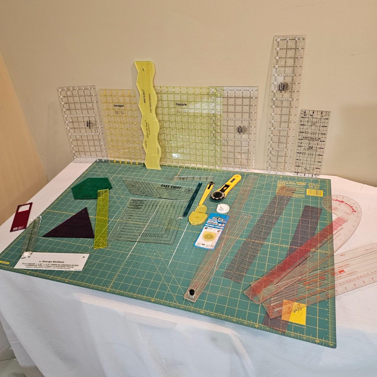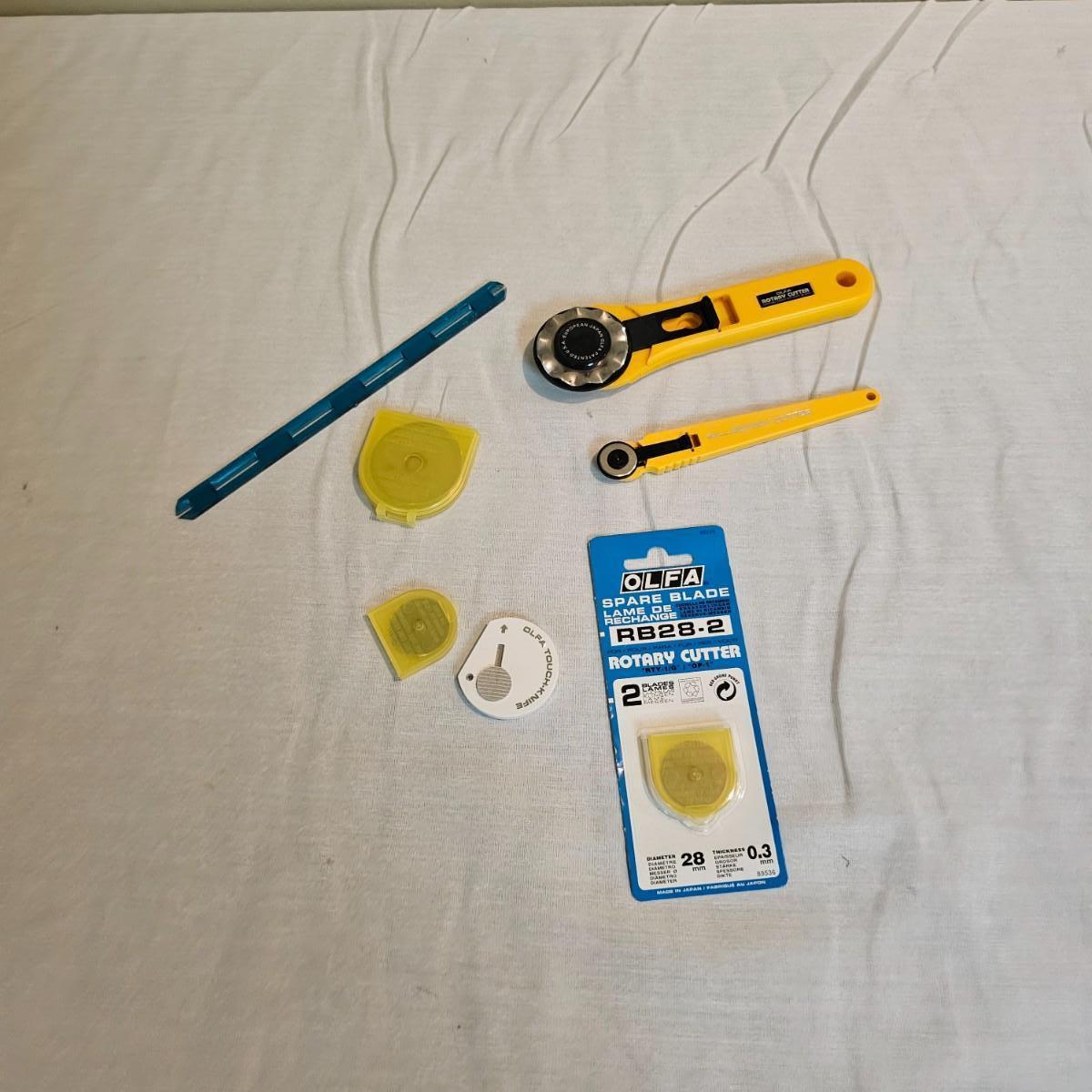 One Olfa 24"x 30" cutting mat plus several types of measuring grids and rulers, from 4" x 8" to 12"sq. Also includes two rotary cutters, 19mm and 45mm with extra blades. Good for quilting or sewing. See photos for details. Local pickup only.