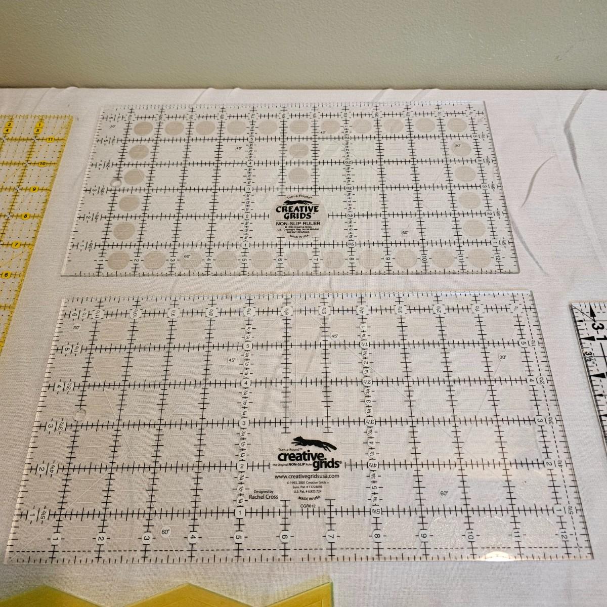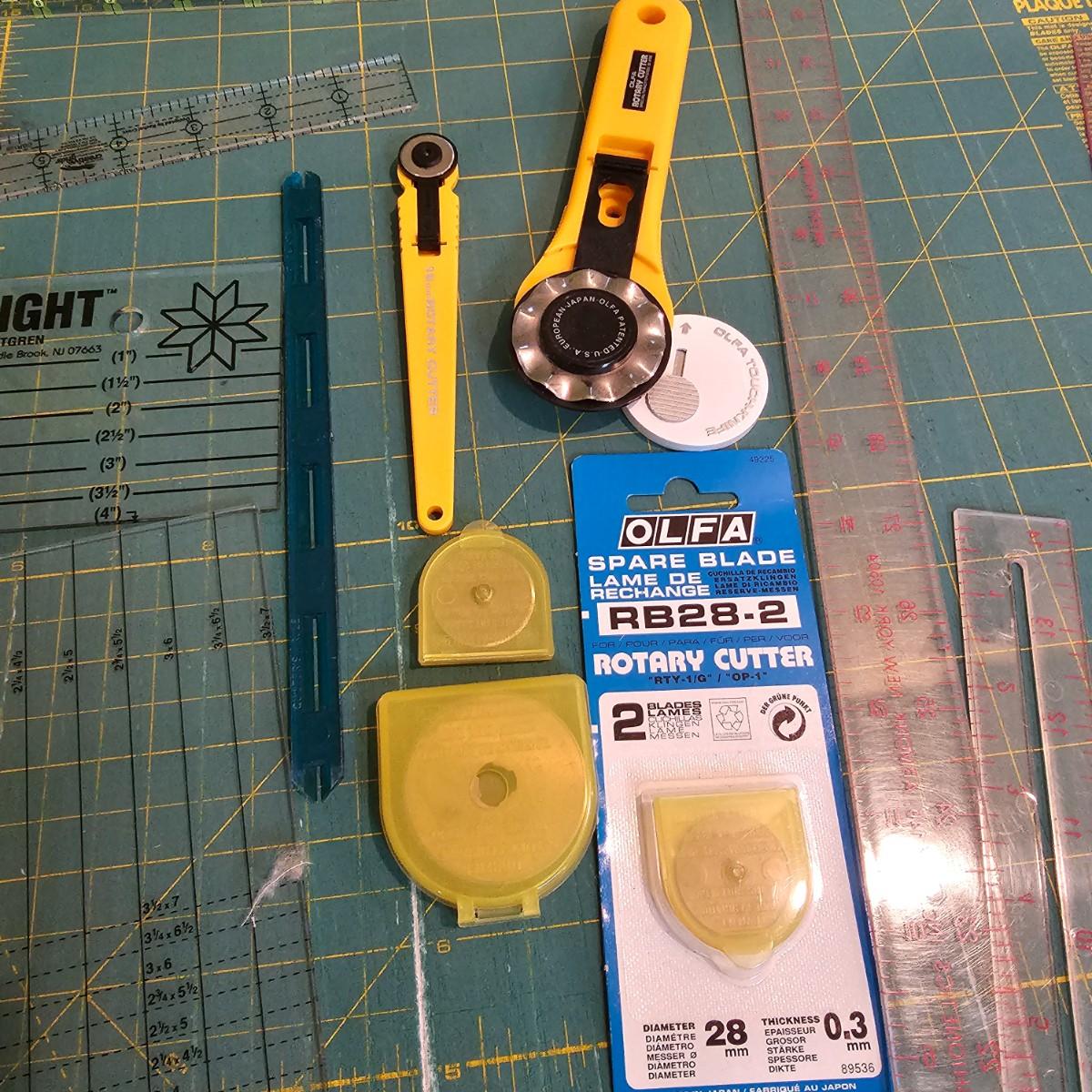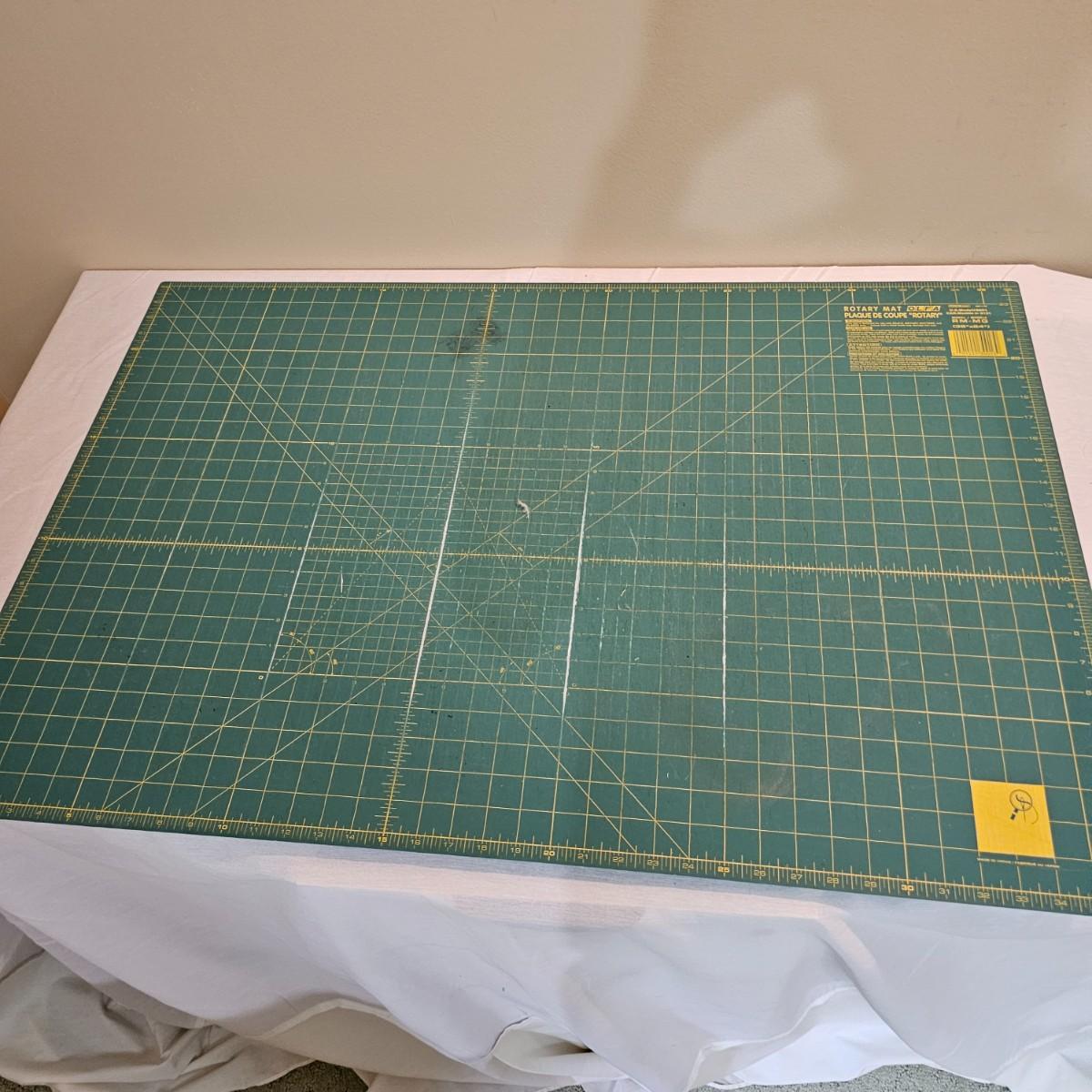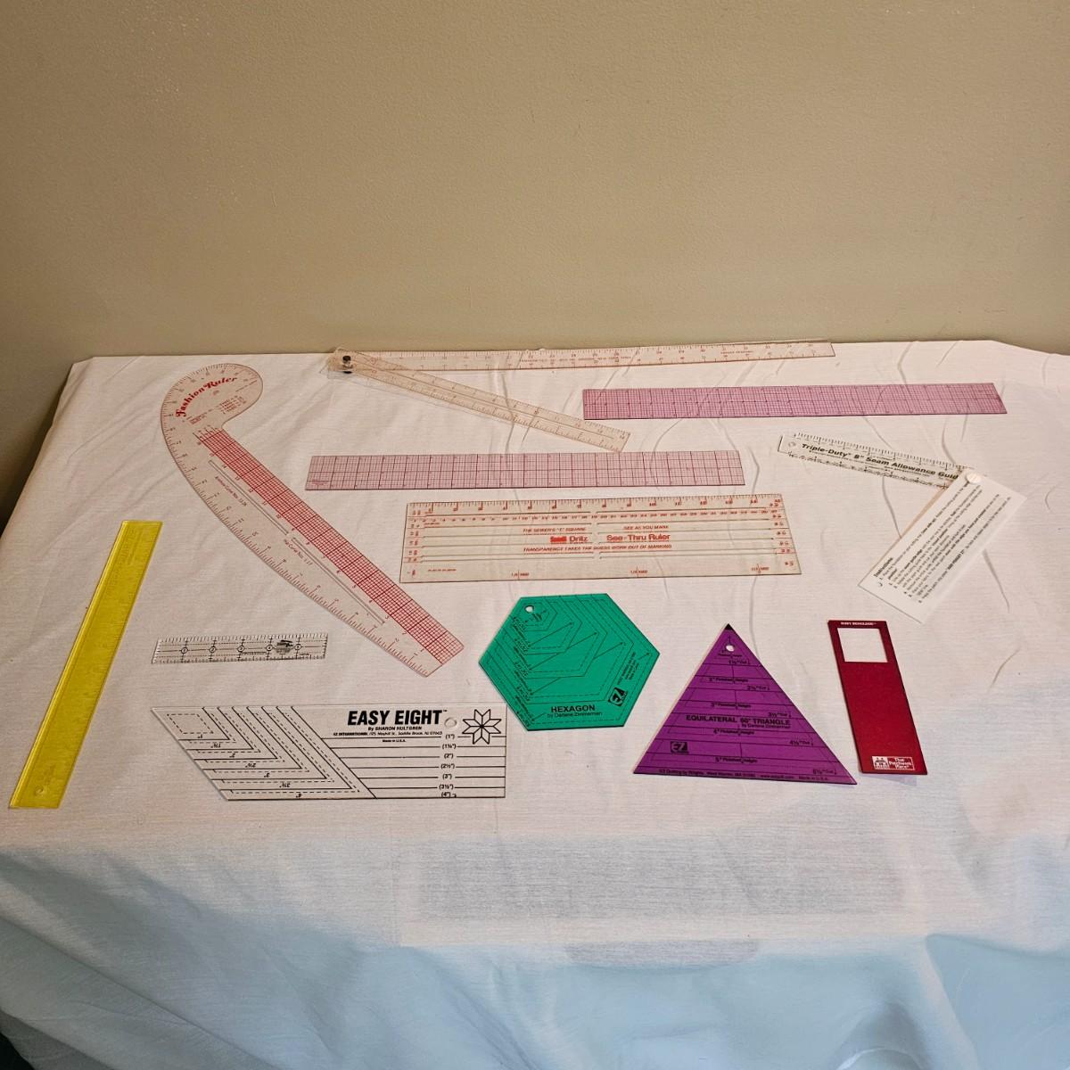 One Olfa 24"x 30" cutting mat plus several types of measuring grids and rulers, from 4" x 8" to 12"sq. Also includes two rotary cutters, 19mm and 45mm with extra blades. Good for quilting or sewing. See photos for details. Local pickup only.