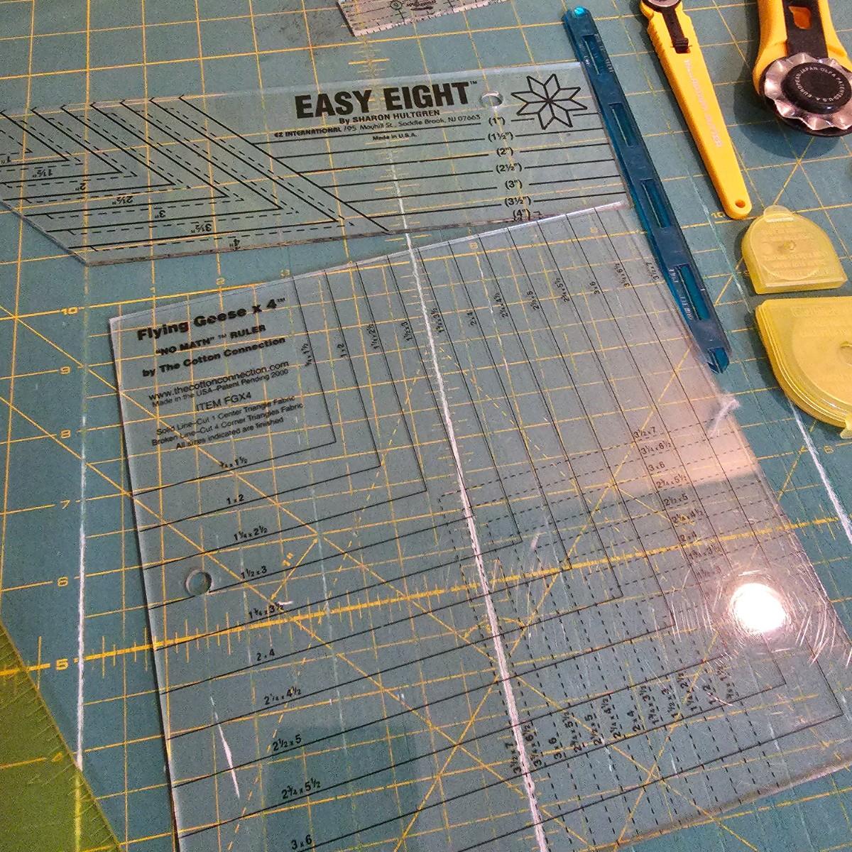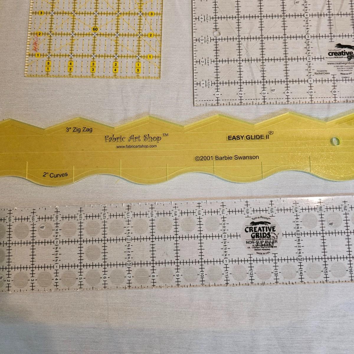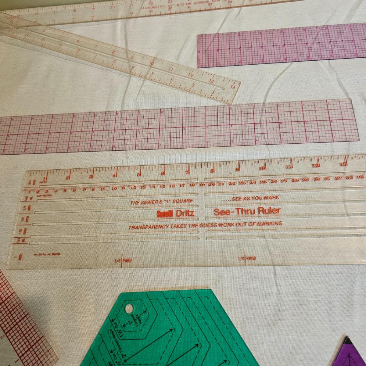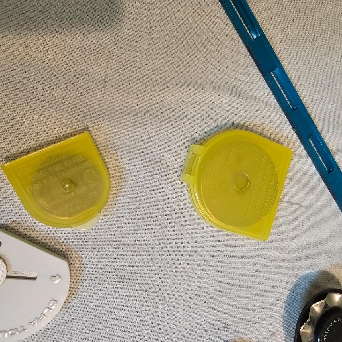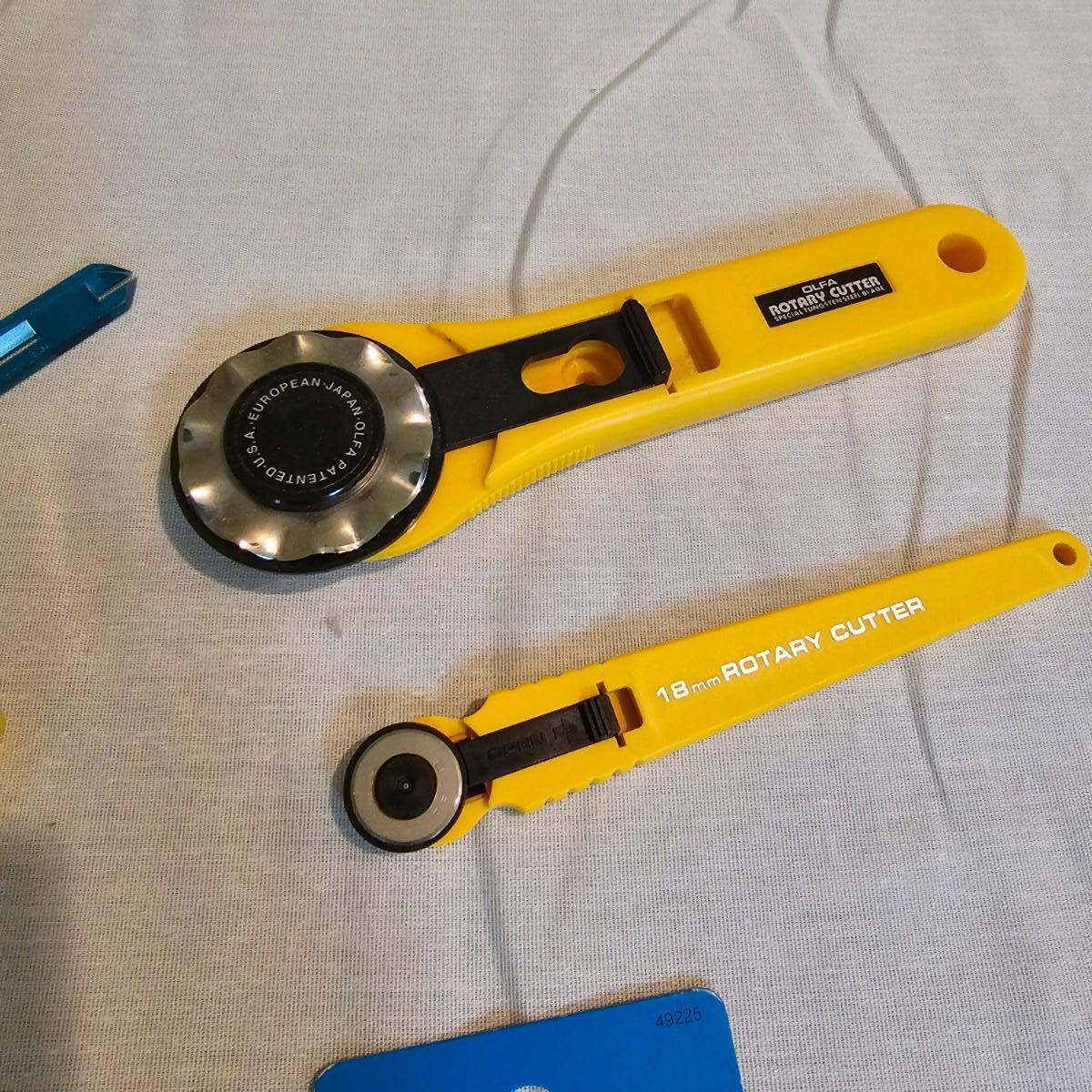One Olfa 24"x 30" cutting mat plus several types of measuring grids and rulers, from 4" x 8" to 12"sq. Also includes two rotary cutters, 19mm and 45mm with extra blades. Good for quilting or sewing. See photos for details. Local pickup only.