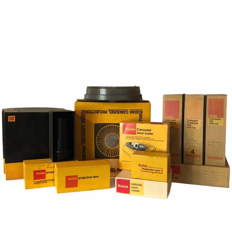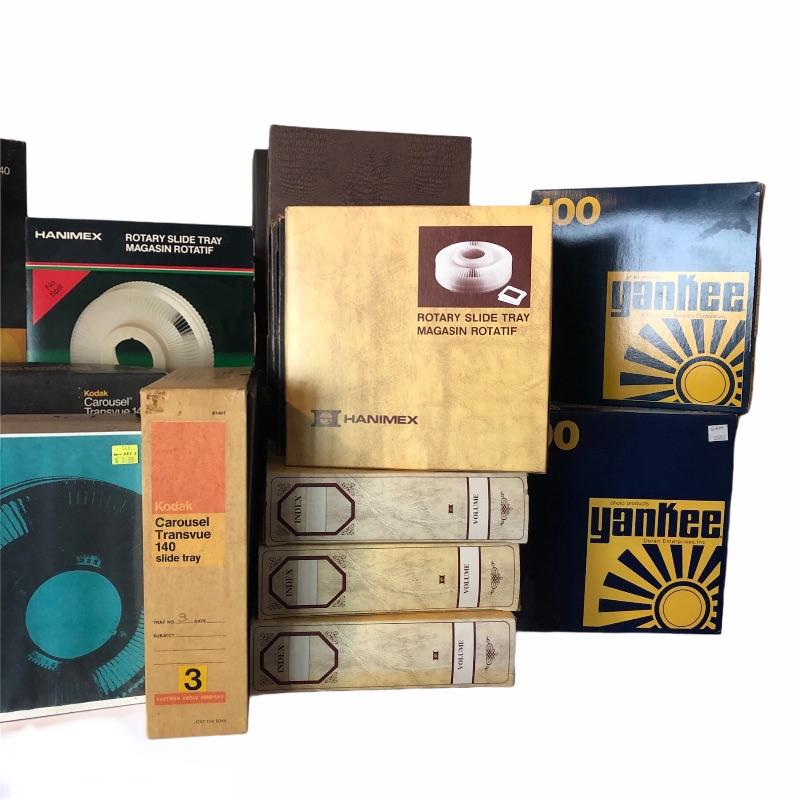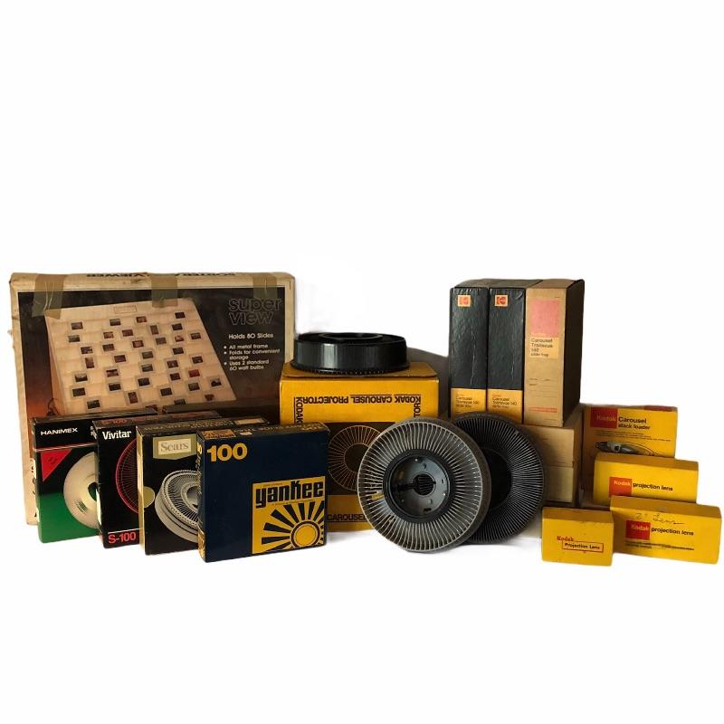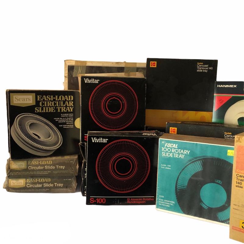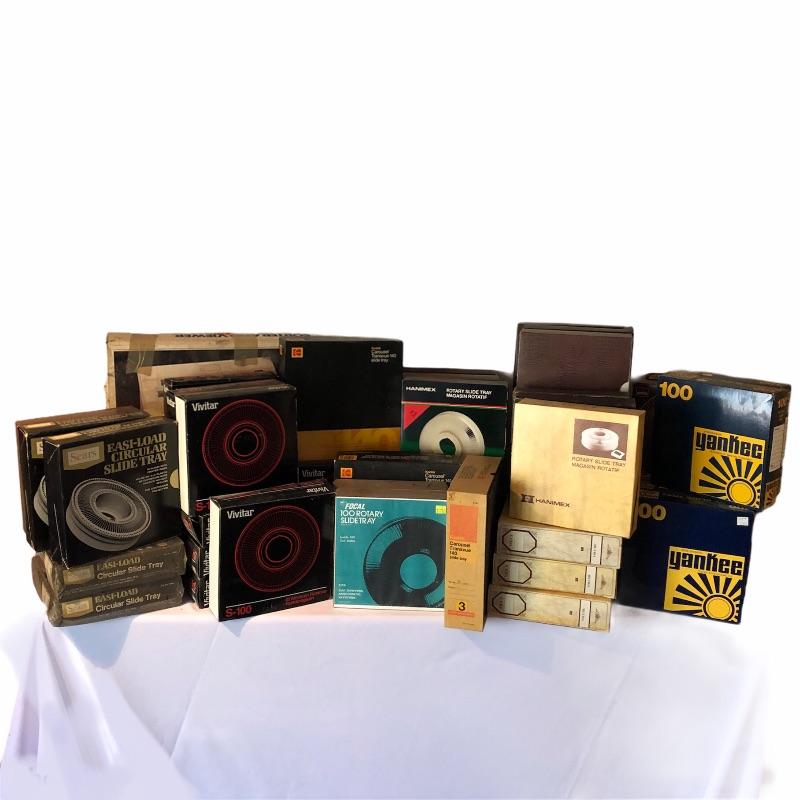 Large collection of rotary slide trays and accessories. Includes brands such as Kodak, Vivitar, Yankee, Sears, Hanimex, as well as brand-less items. Kodak collection includes multiple slide trays, a carousel projector, two stack loafers, and three projection lenses- one of which has “2” Lens” written in ink on the box. All trays are empty and the lot fills about 11 small boxes.