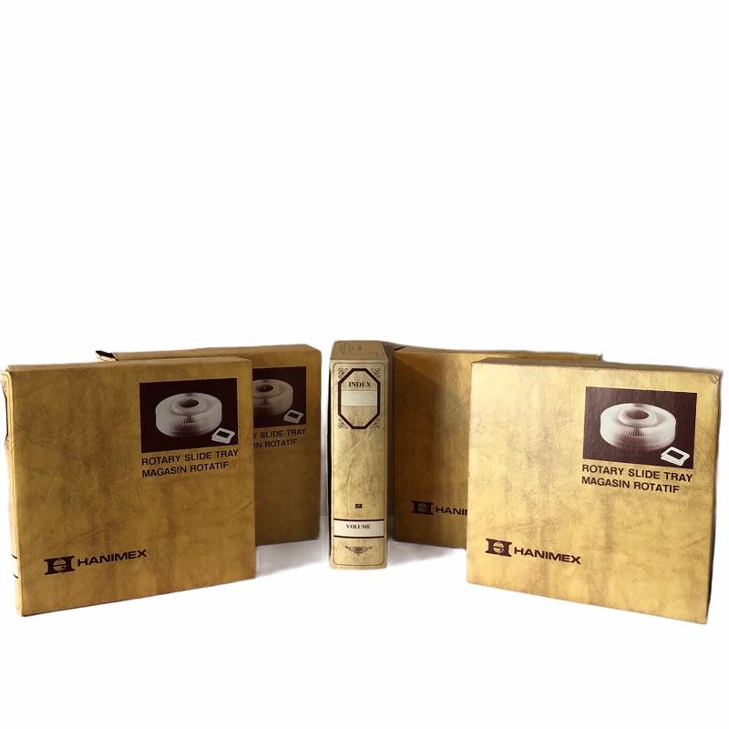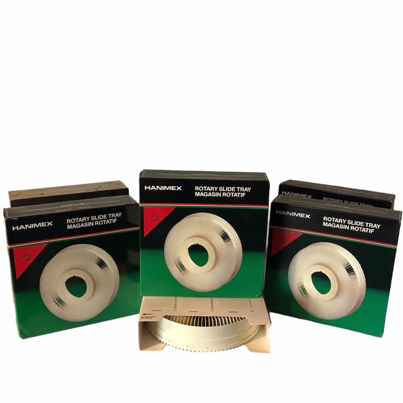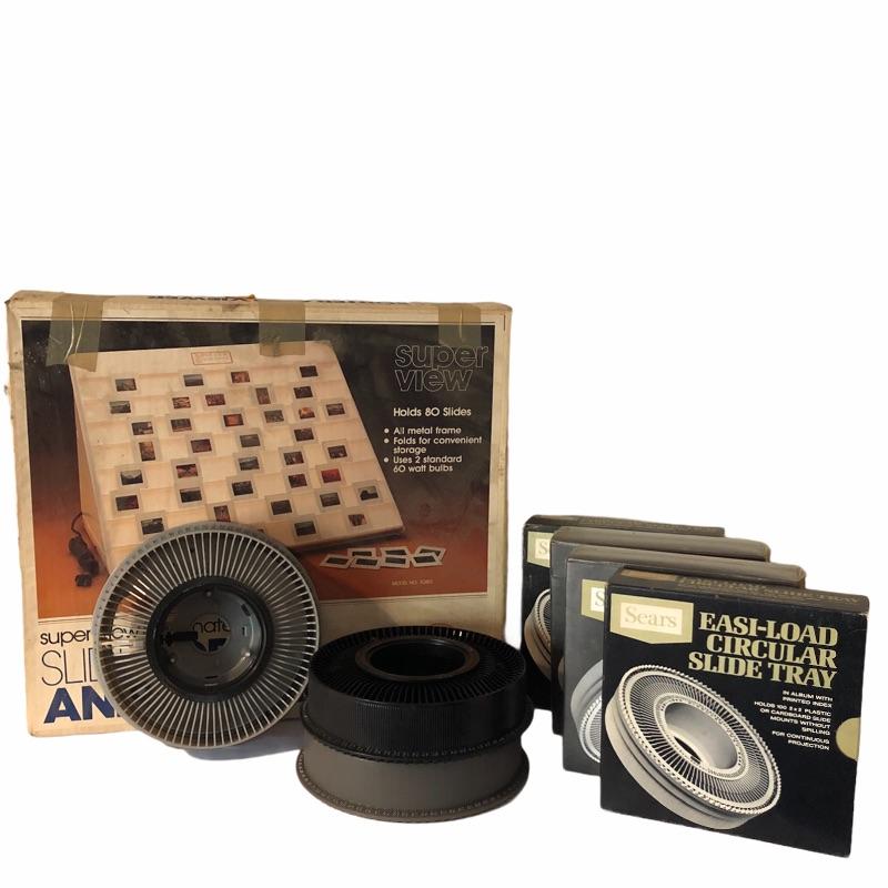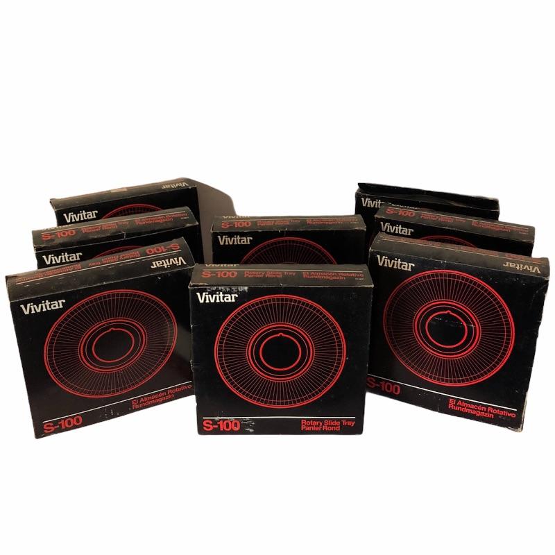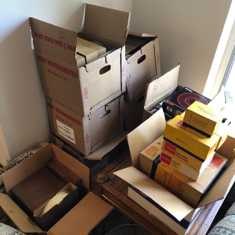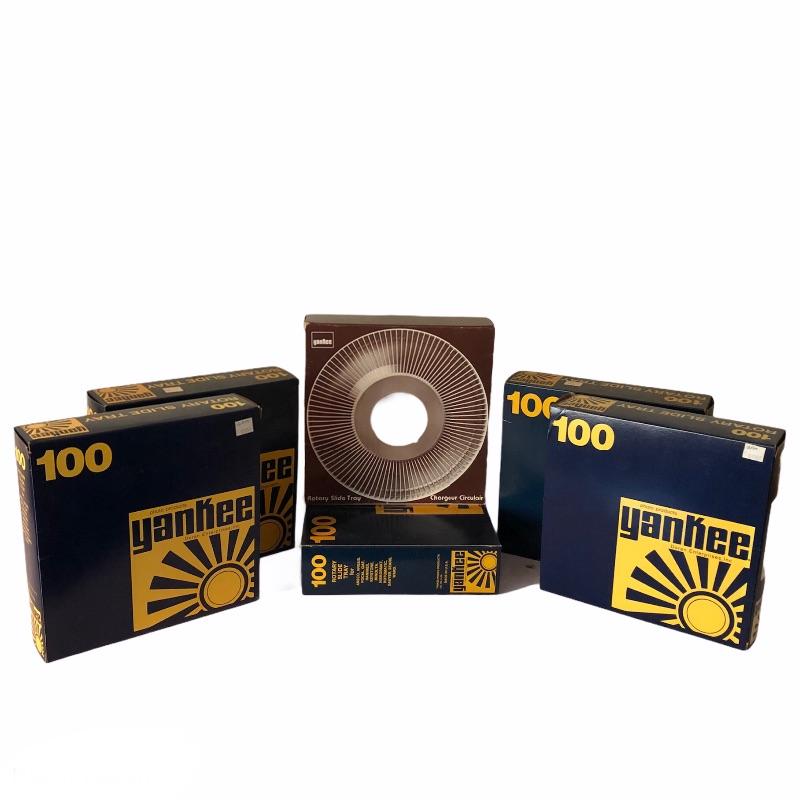 Large collection of rotary slide trays and accessories. Includes brands such as Kodak, Vivitar, Yankee, Sears, Hanimex, as well as brand-less items. Kodak collection includes multiple slide trays, a carousel projector, two stack loafers, and three projection lenses- one of which has “2” Lens” written in ink on the box. All trays are empty and the lot fills about 11 small boxes.