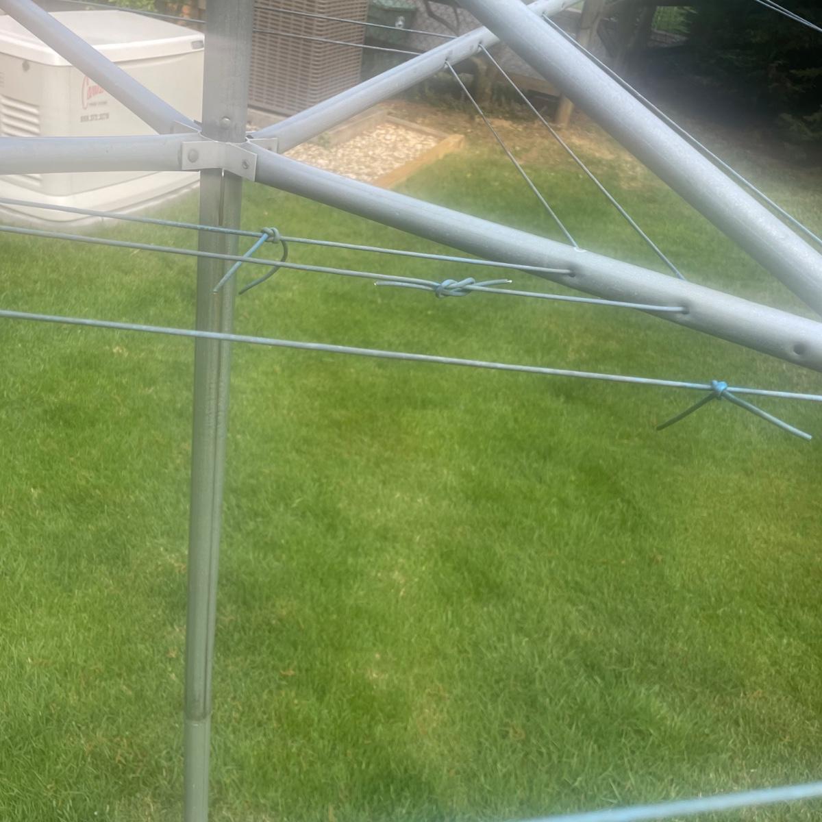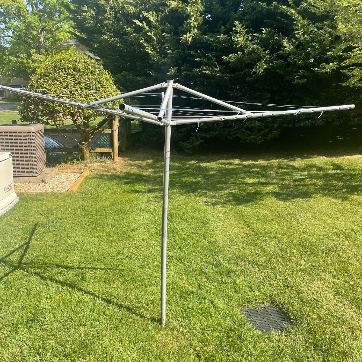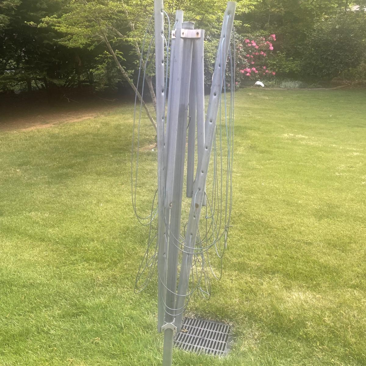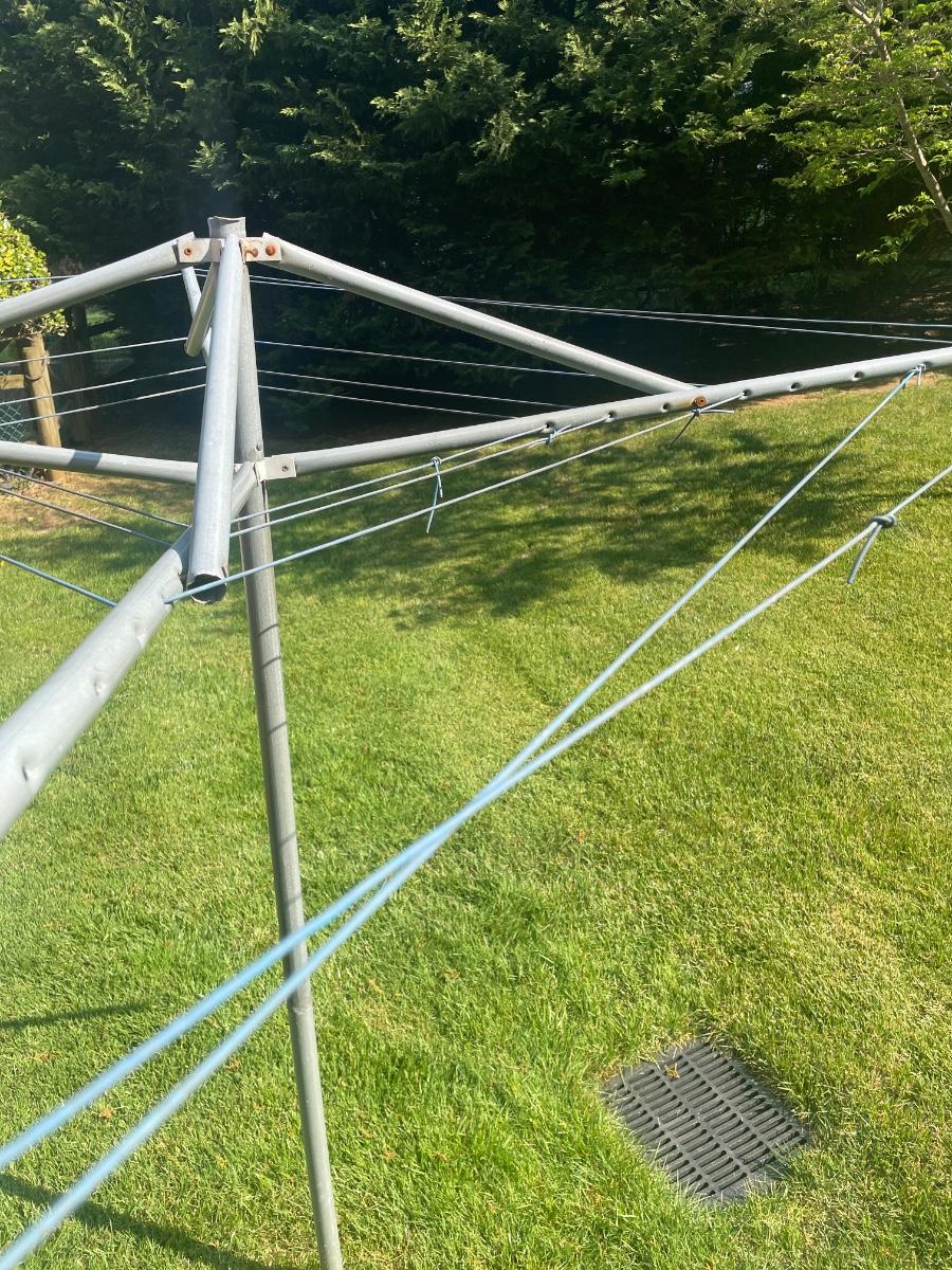 This metal rotary washing line measures 65” x 60” x 71” tall and it’s 19” d (when collapsed). The washing line itself has some repairs where the line has broken and it’s been tied back together so it could use new line. It collapses/erects easily and the metal is in good condition with just some rust on the pole where it was in the ground.