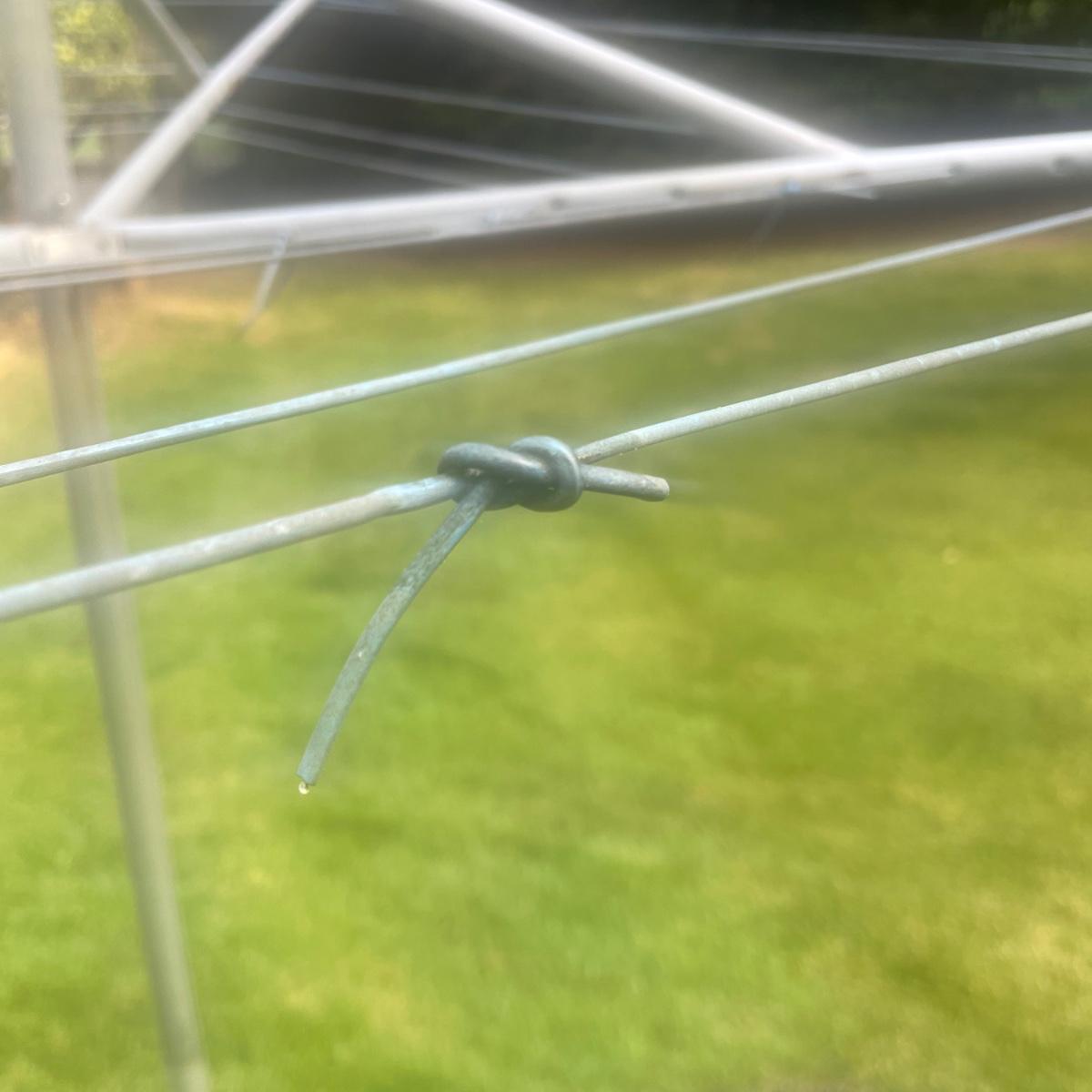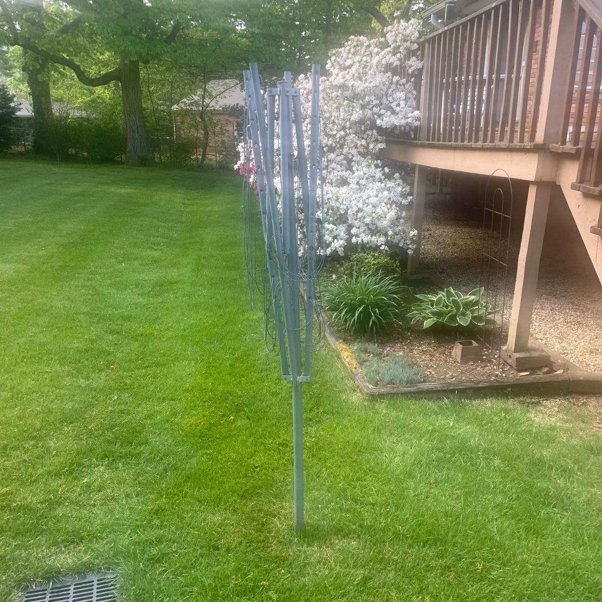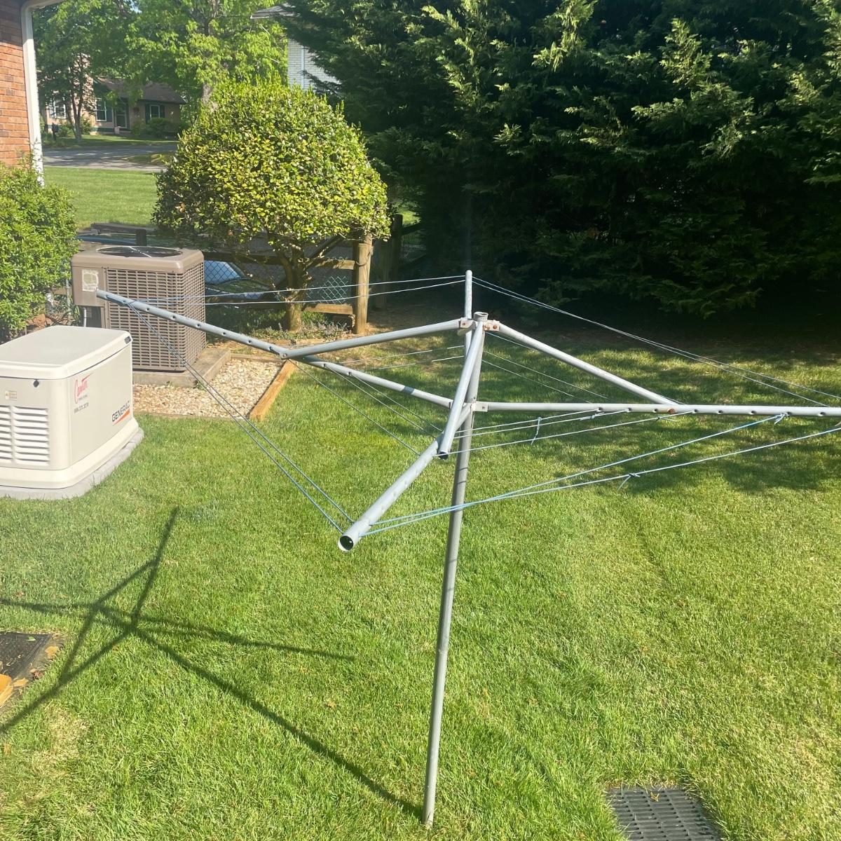 This metal rotary washing line measures 65” x 60” x 71” tall and it’s 19” d (when collapsed). The washing line itself has some repairs where the line has broken and it’s been tied back together so it could use new line. It collapses/erects easily and the metal is in good condition with just some rust on the pole where it was in the ground.