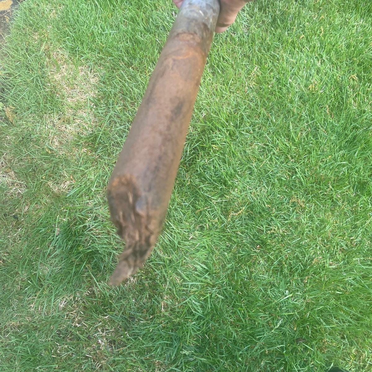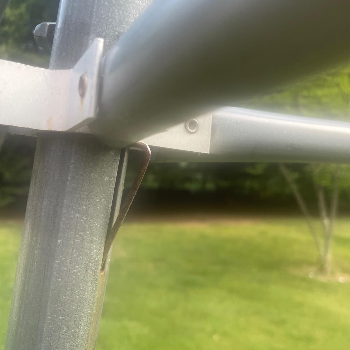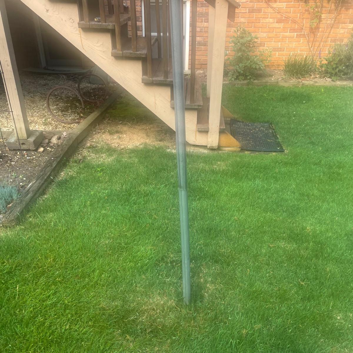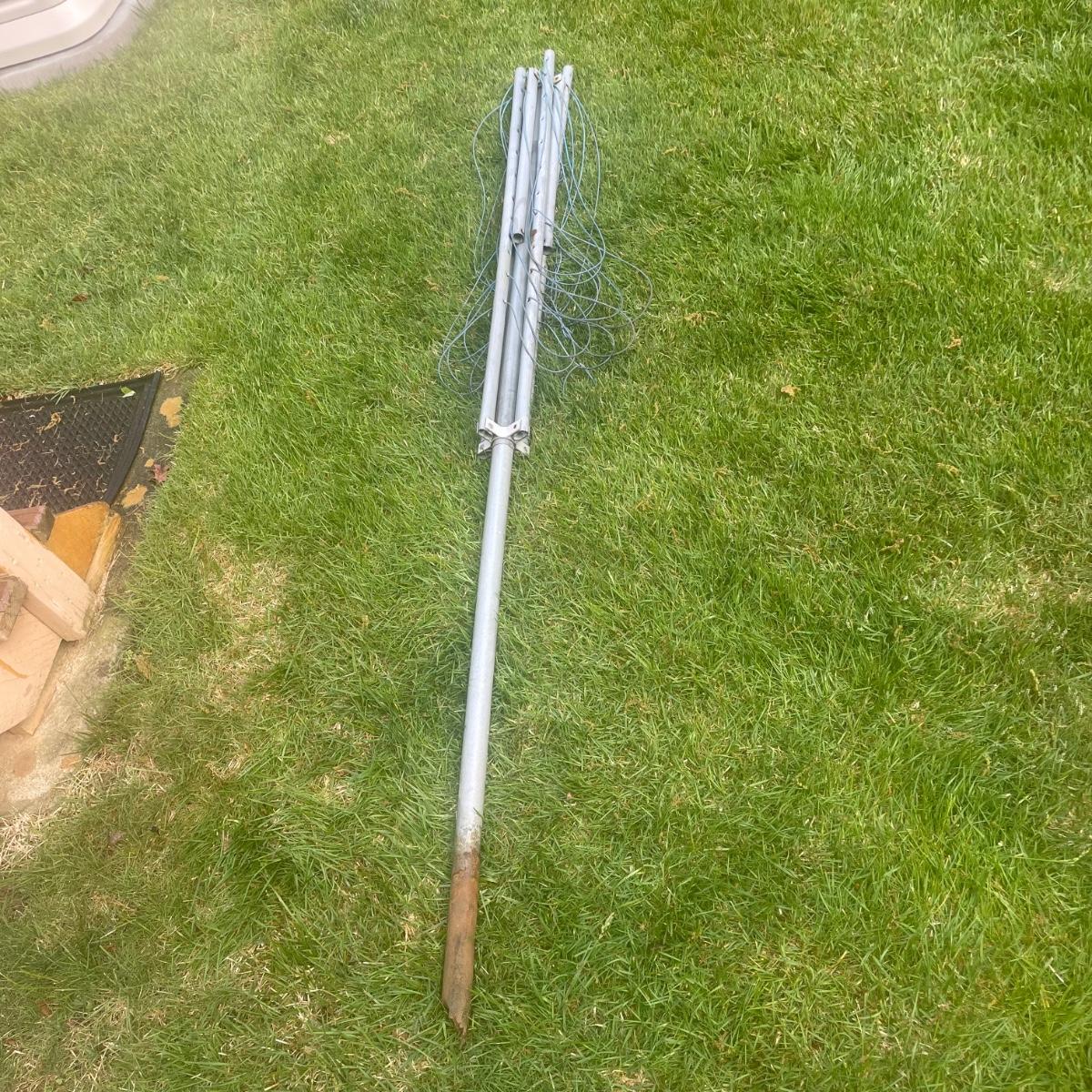 This metal rotary washing line measures 65” x 60” x 71” tall and it’s 19” d (when collapsed). The washing line itself has some repairs where the line has broken and it’s been tied back together so it could use new line. It collapses/erects easily and the metal is in good condition with just some rust on the pole where it was in the ground.