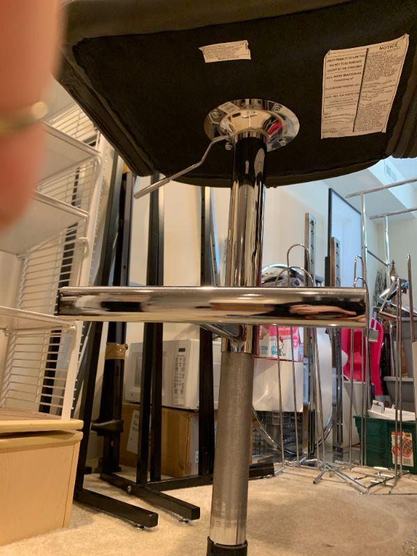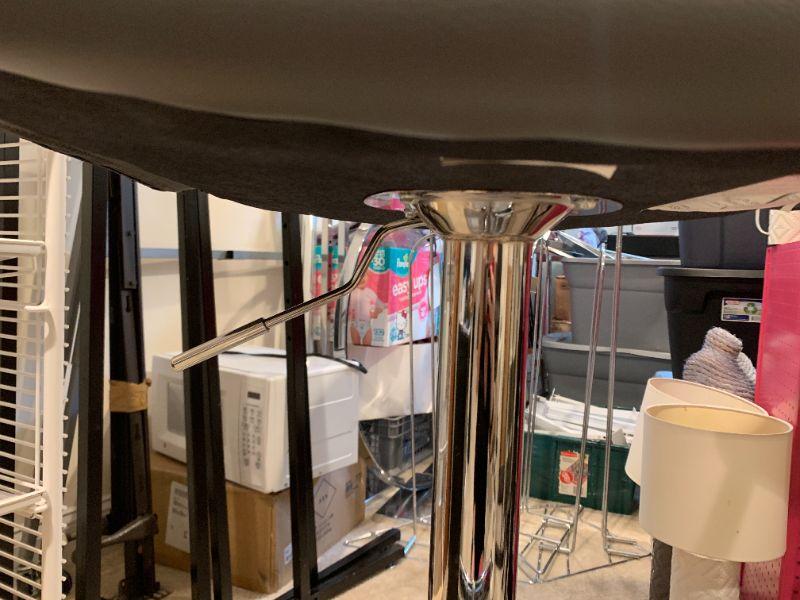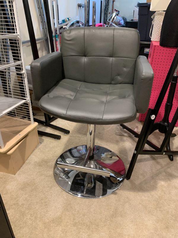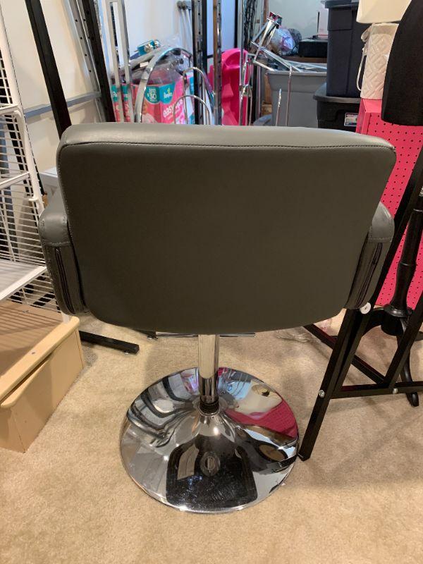Rotating, adjustable height gray stool with arms. Makes some noise when it goes up and down, but fully functional and in good condition. 24" tall at the shortest, 32" at the tallest. Seat measures 19" between each arm.