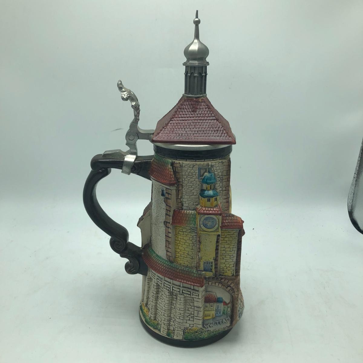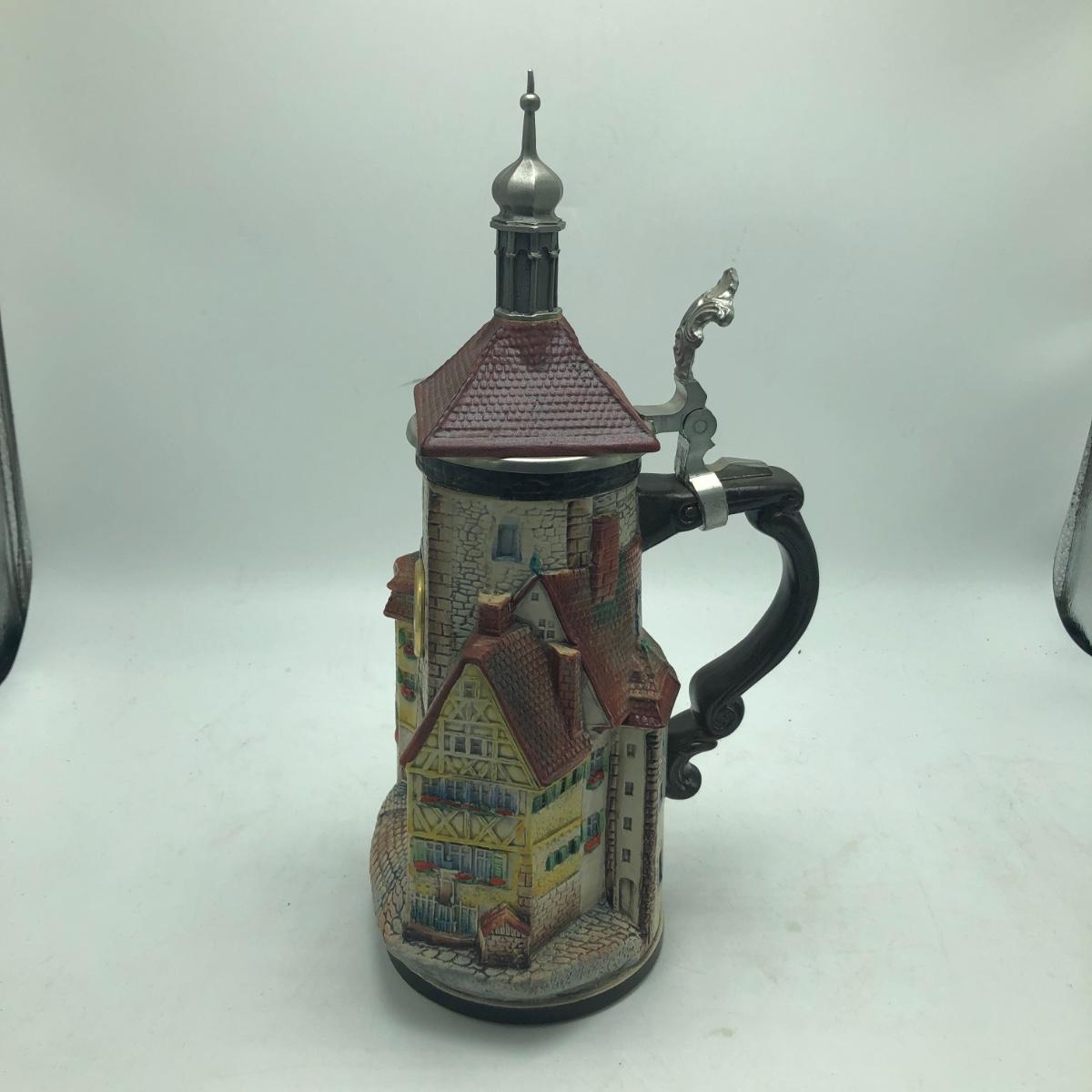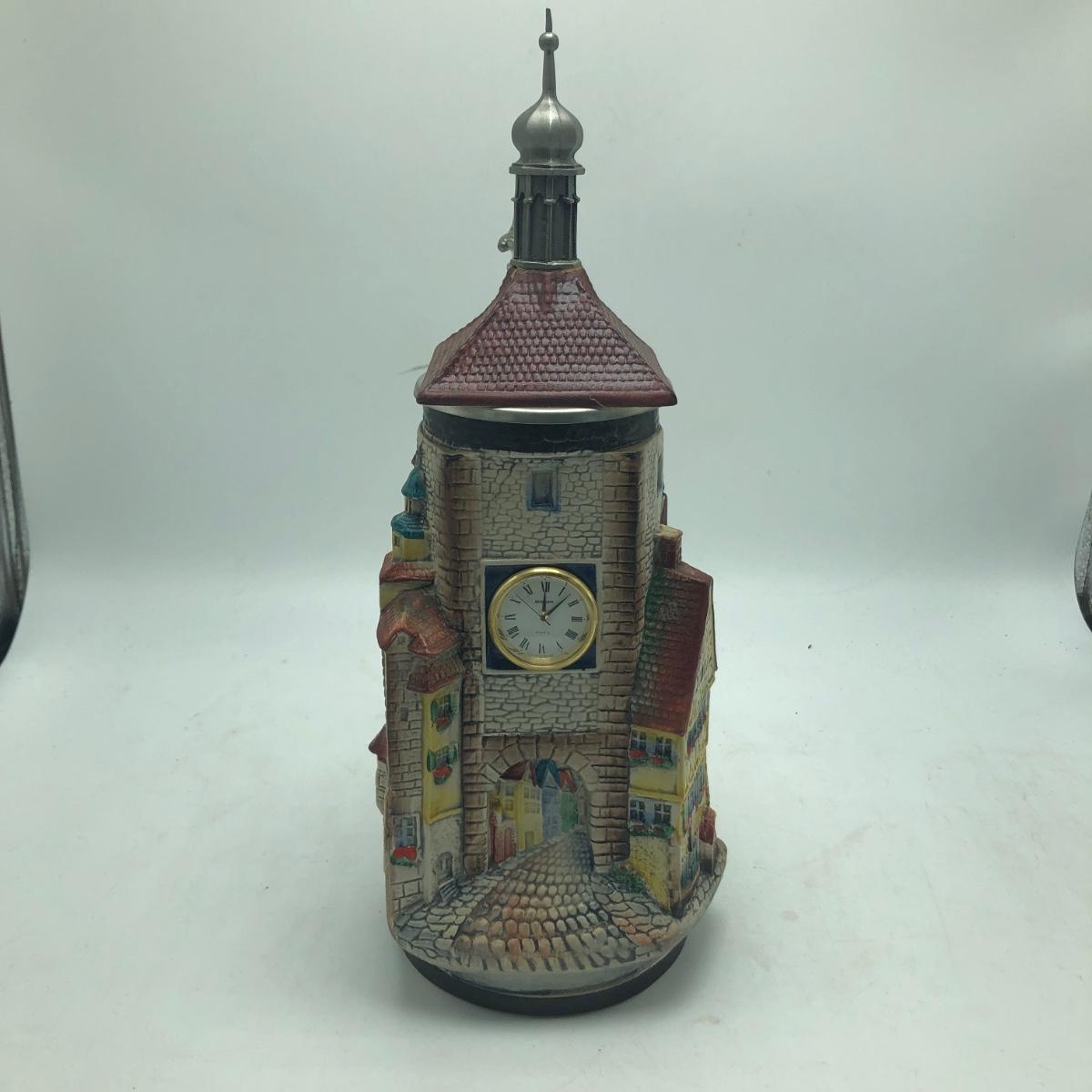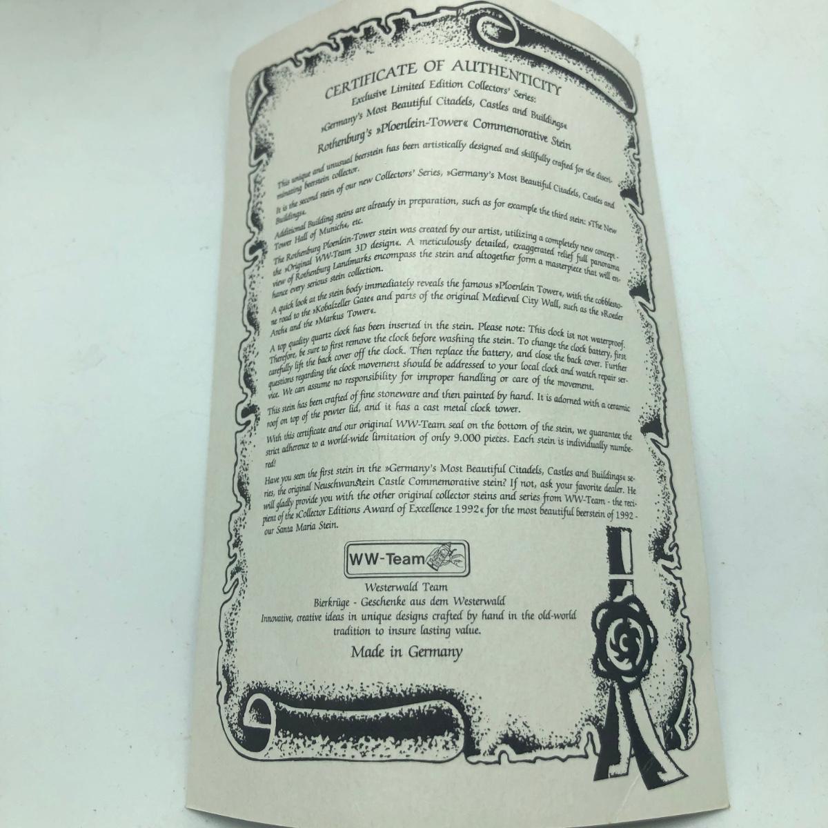 Lot includes a Rothenberg Plonlein-Tower commemorative stein with clock and COA. Clock appears to need battery as it did not work. Stein measures 4.25” x 6.5” x 12.5”.