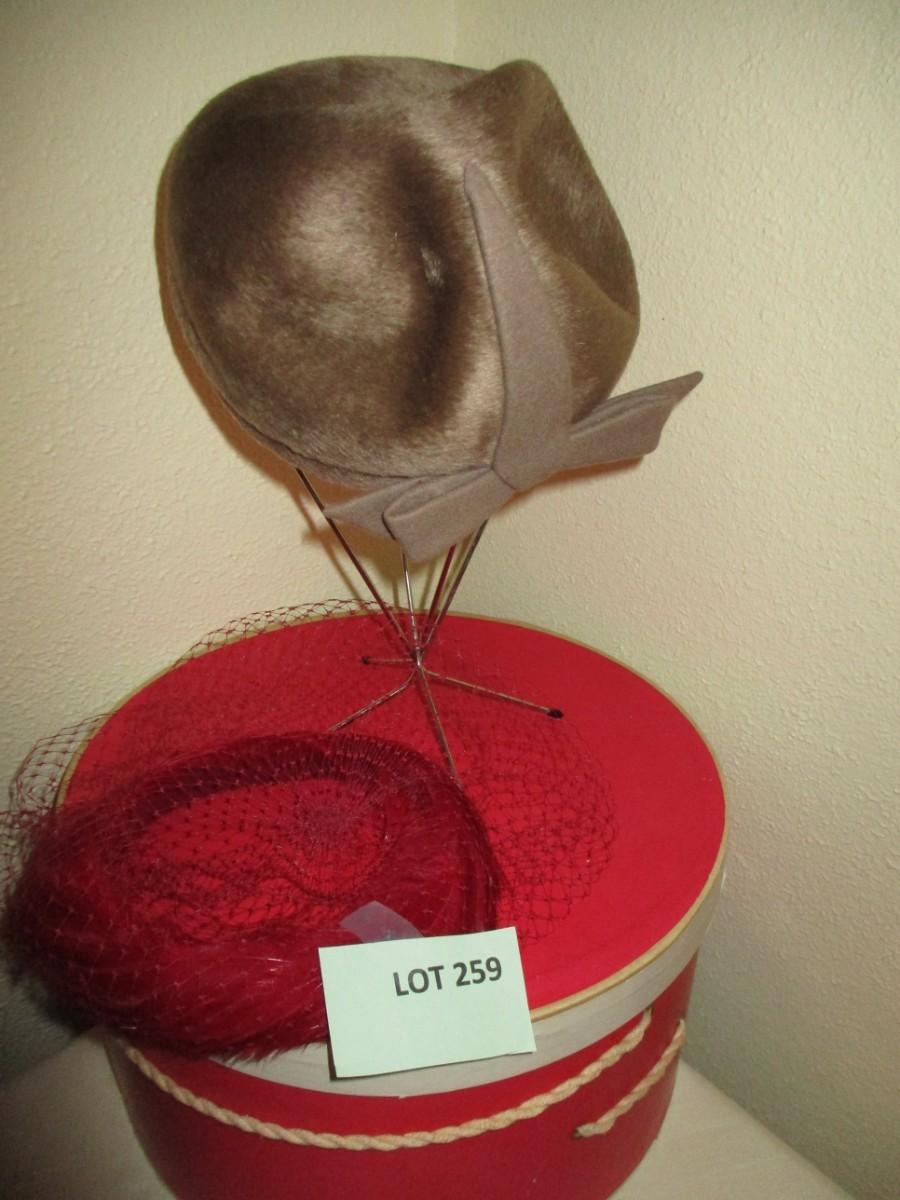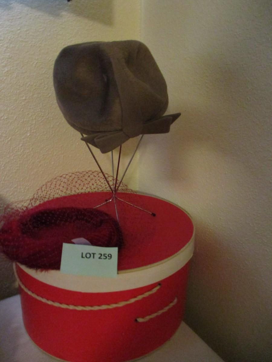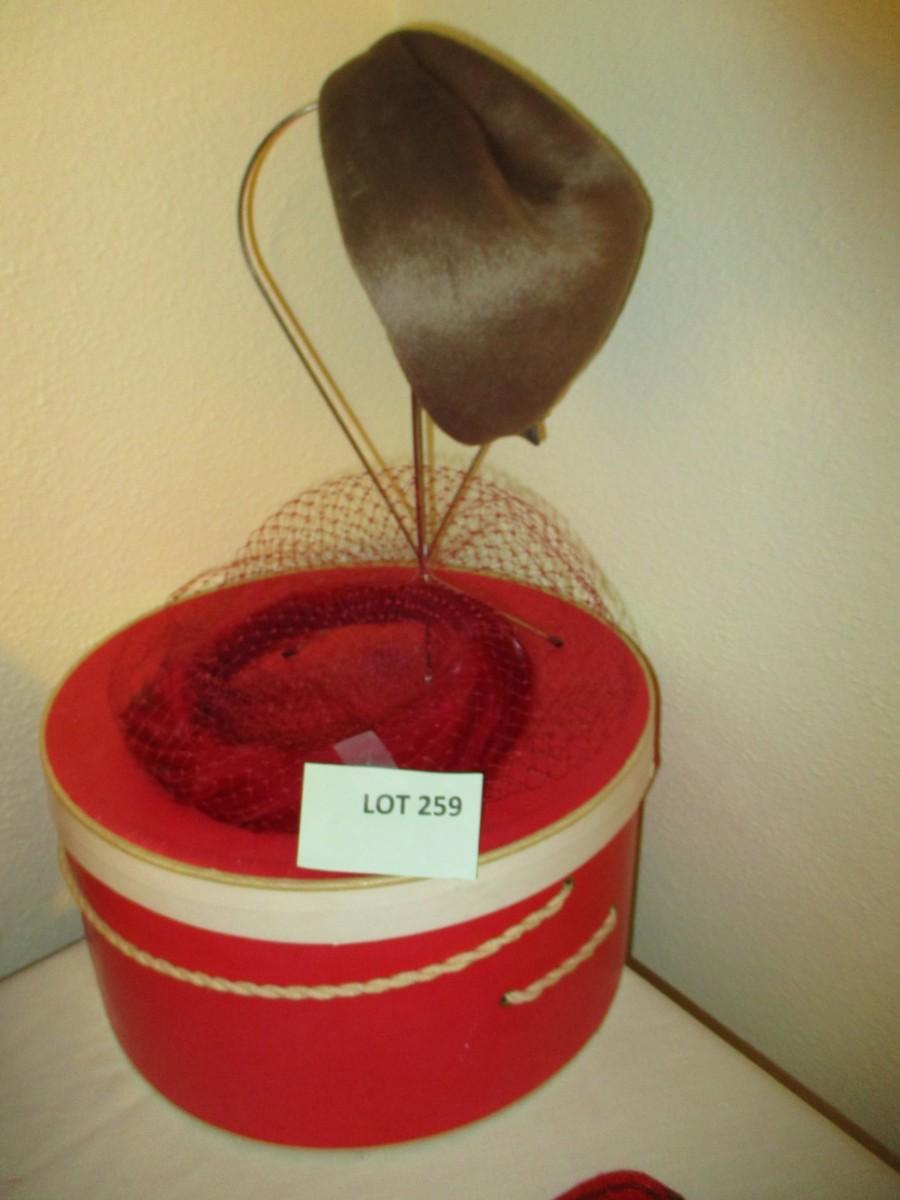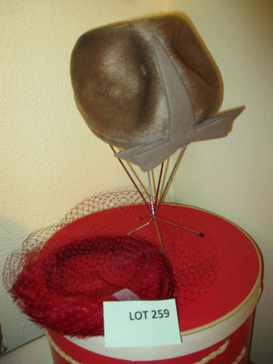 Burgundy netted ladie's hat. Rothschilds brown fur hat with vintage hatbox