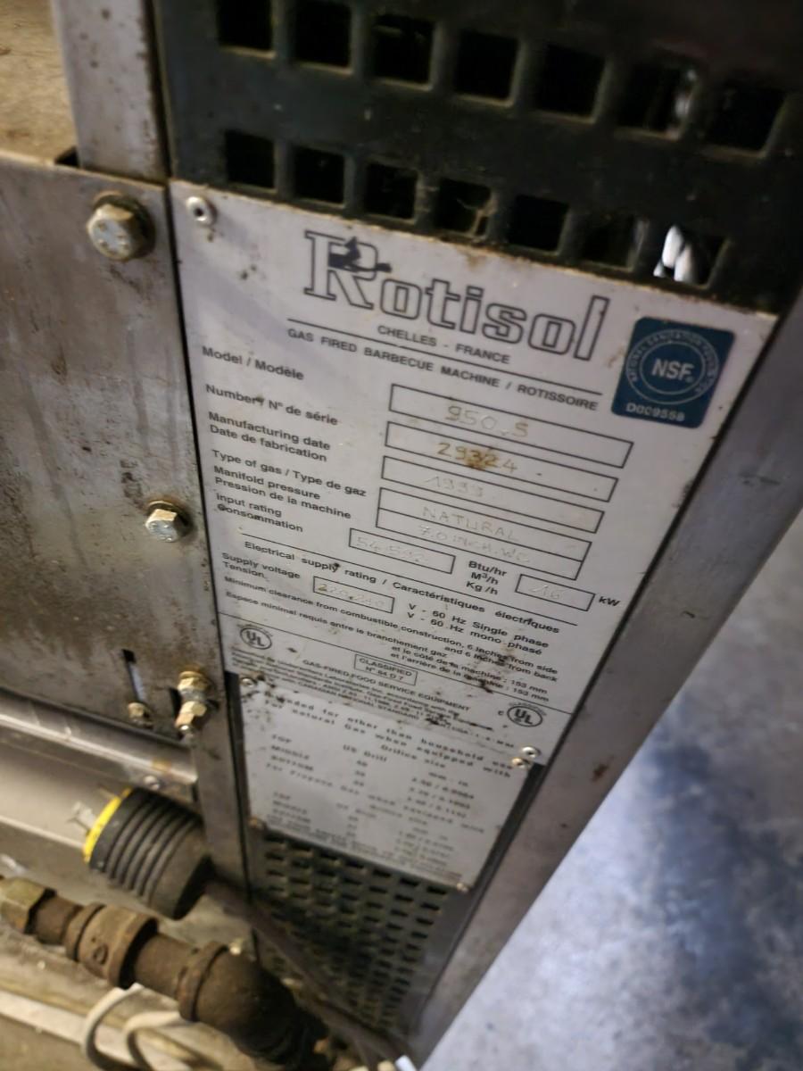 Rotisol Rotisserie, Model 950.s, natural gas. 38" x 20" x 46" tall