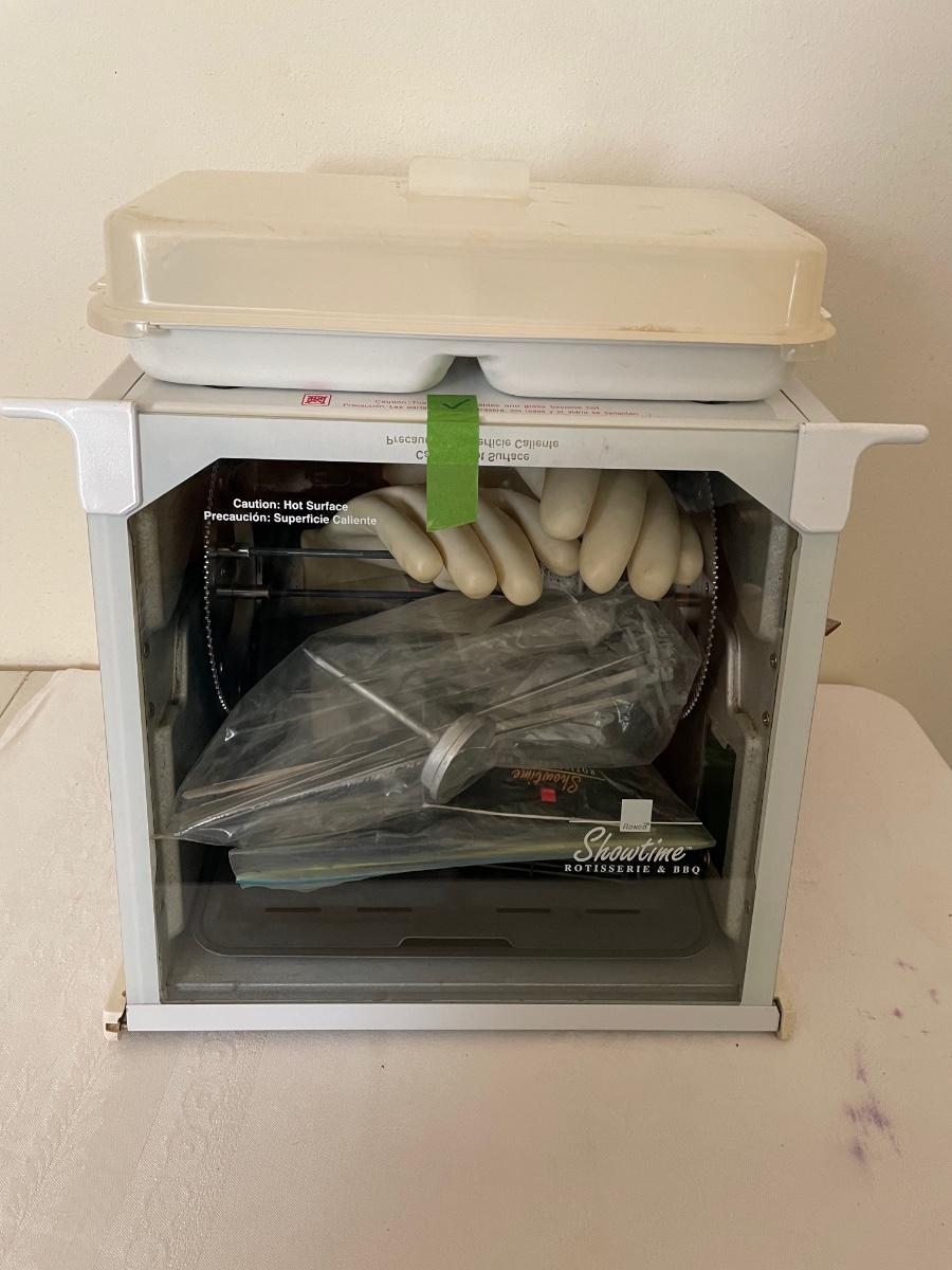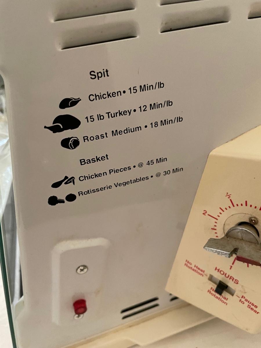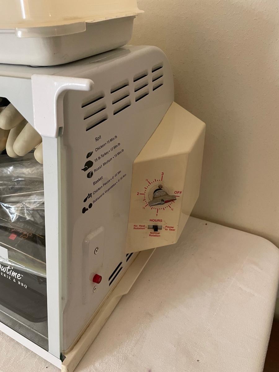 Showtime Rotisserie. Includes gloves, thermometer, "keep warm" tray (for top of rotisserie), interior tray, user manual