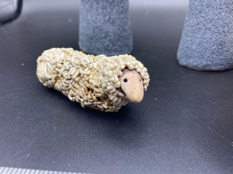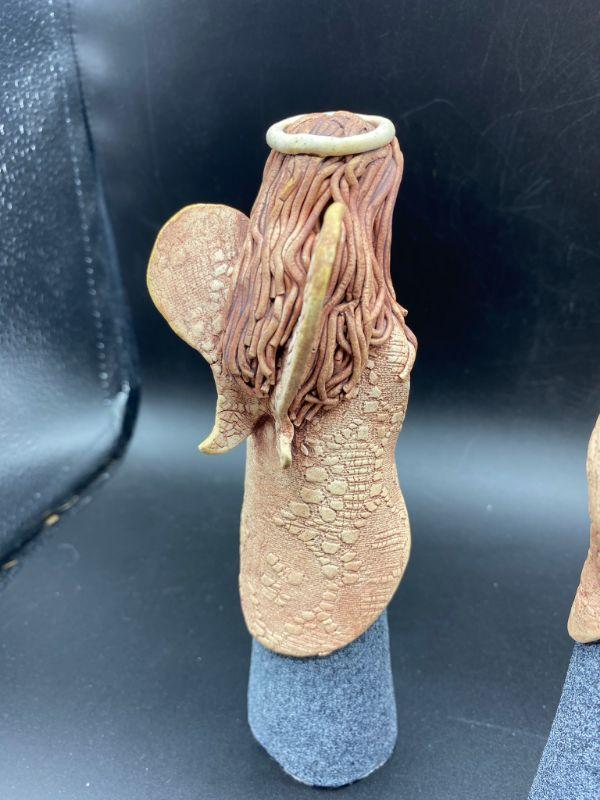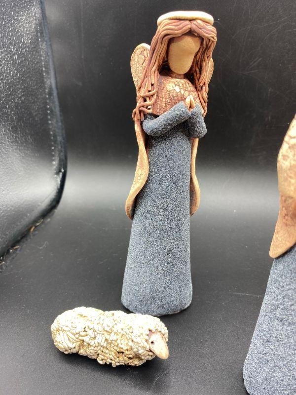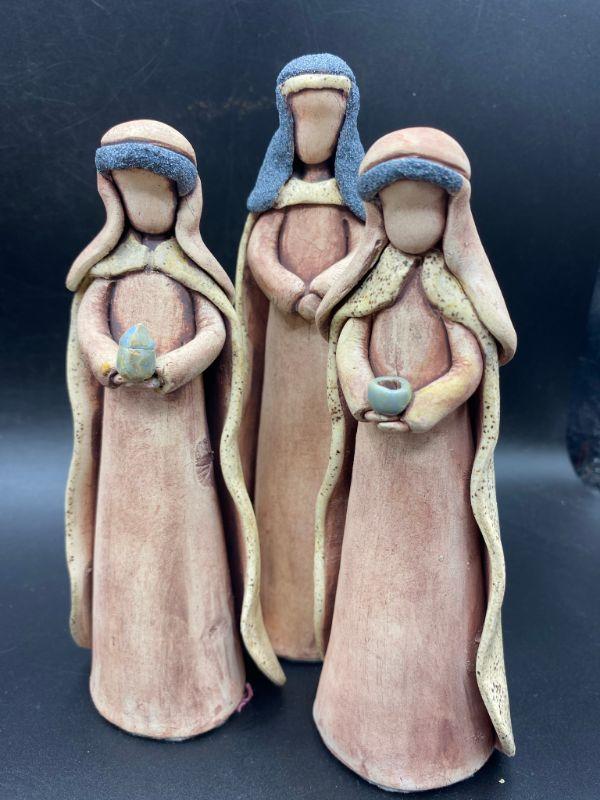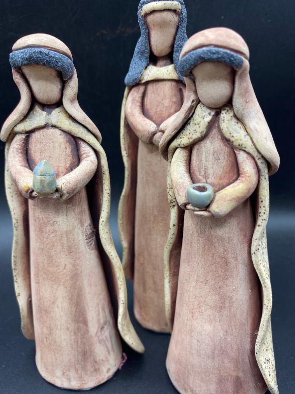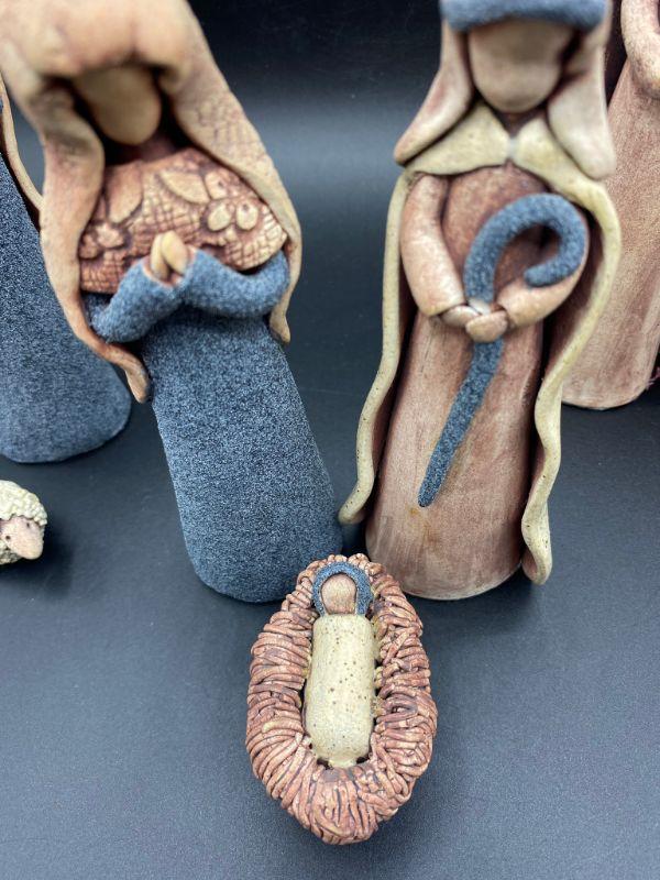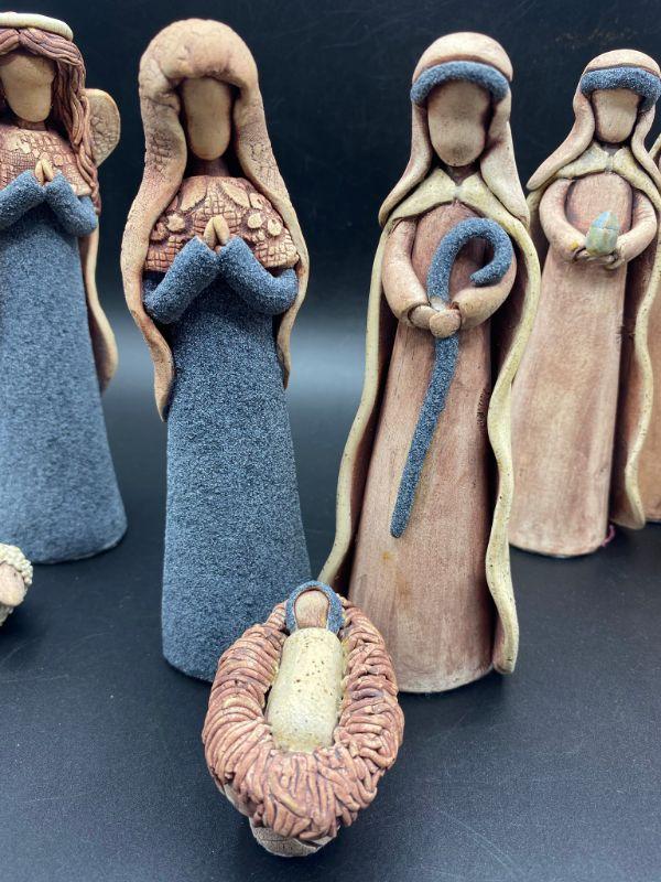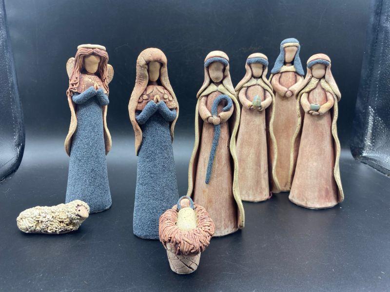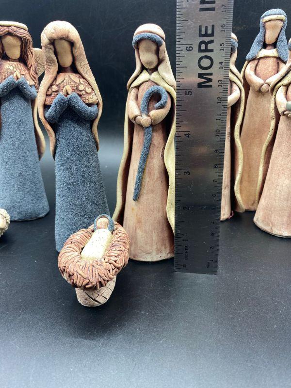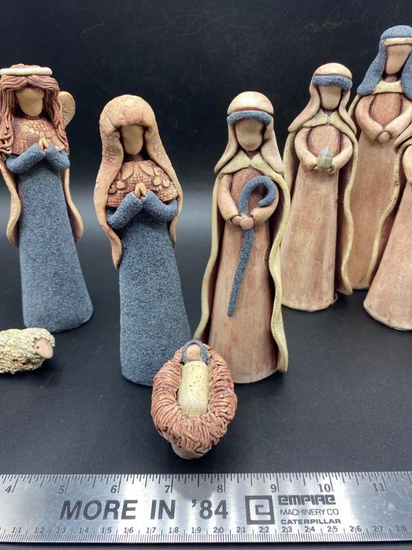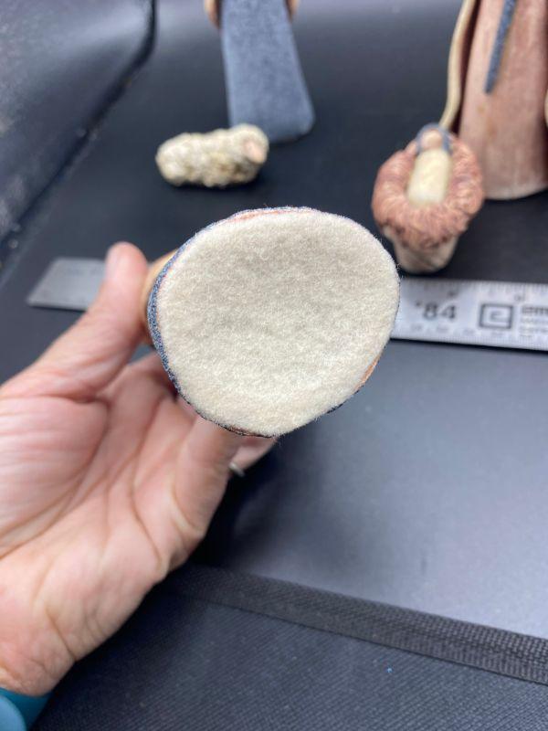 Rough sculpted clay Nativity scene. Muted Colors, nicely done. Felted bottoms. Unmarked or marked under felt.