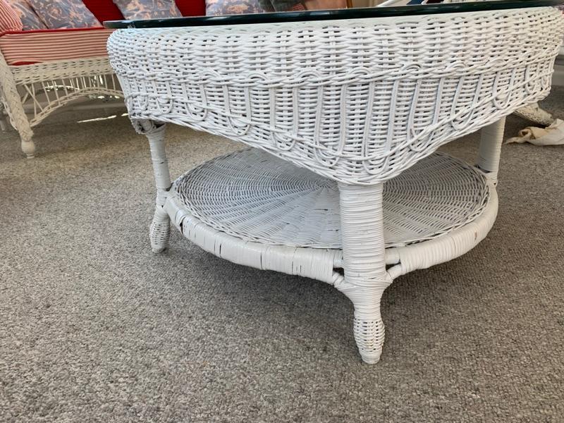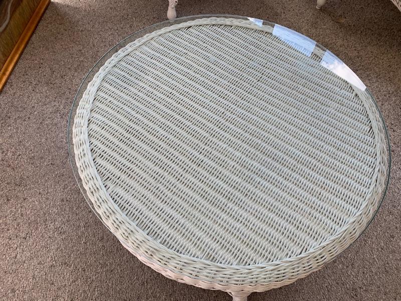 Round approx 30" white painted wicker coffee table with heavy glass top